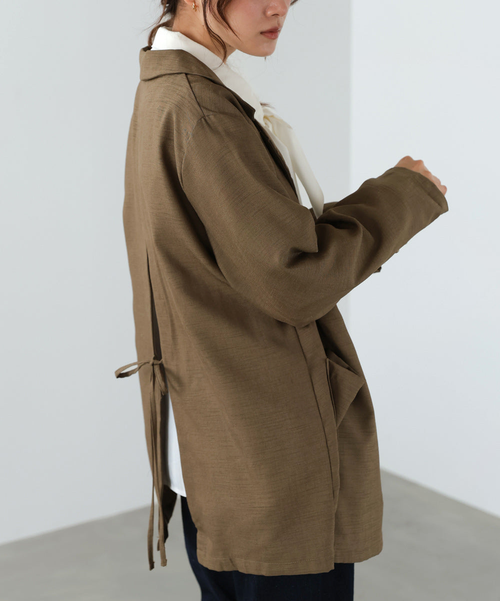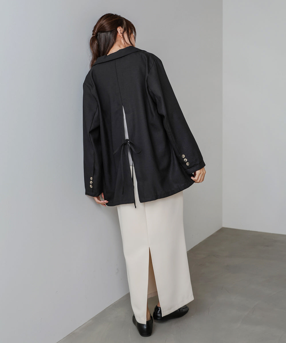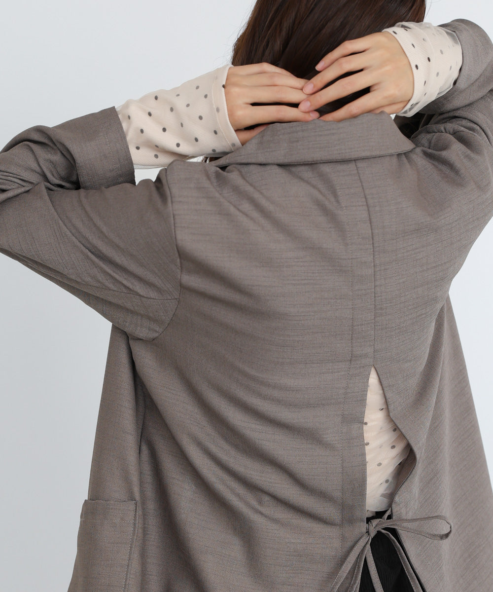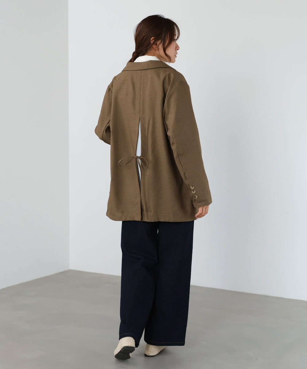バックデザインがポイントの秋ジャケットが登場しました!バックに入った大胆なスリットにリボンがあしらわれています♪重たすぎずな質感なのでワンピースに羽織として、デニムとチュニックなどのレイヤードとして秋シーズン大活躍なジャケットです!流行りのリボンにダブルボタンでトレンドライクなジャケットに仕上がっています!