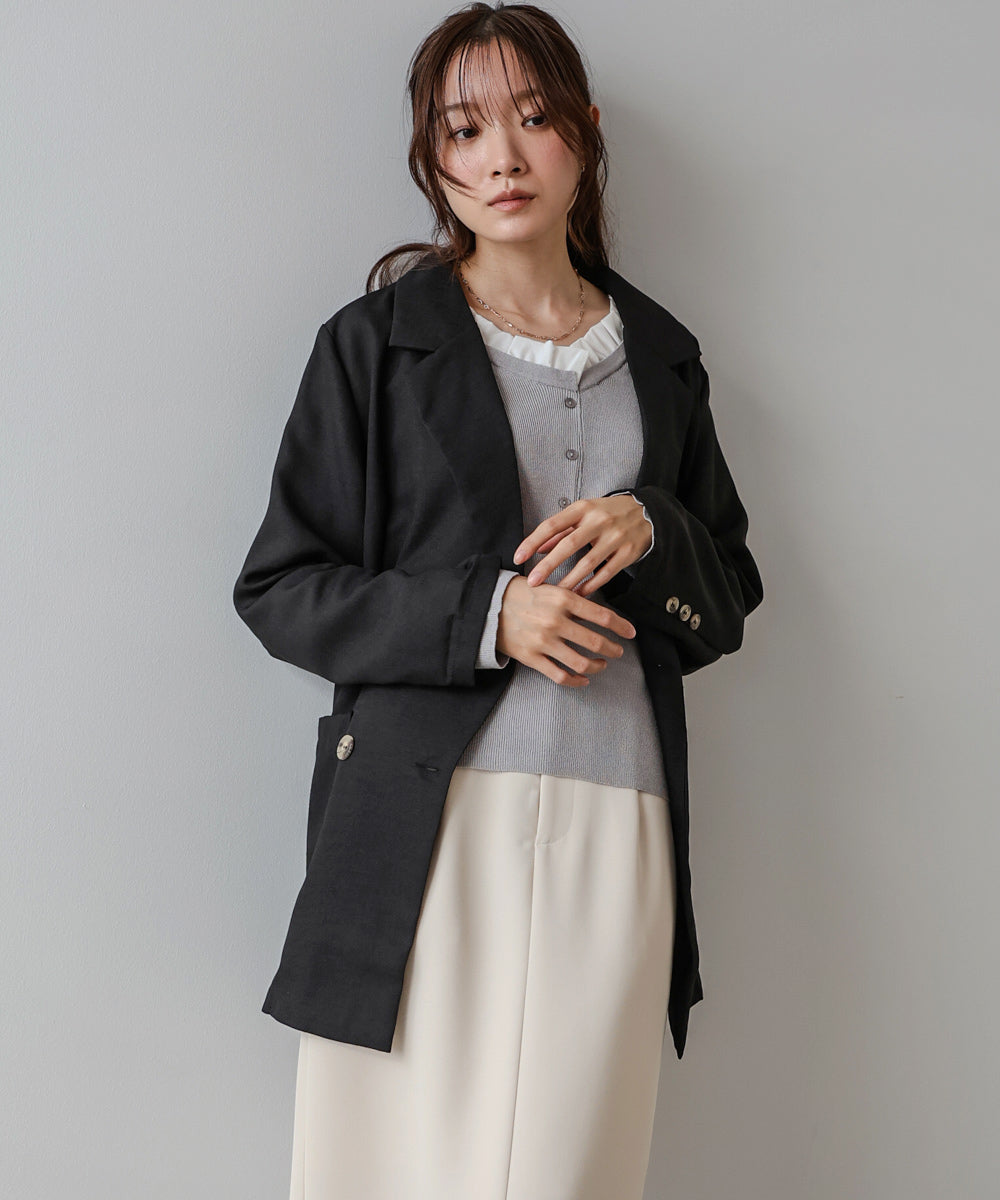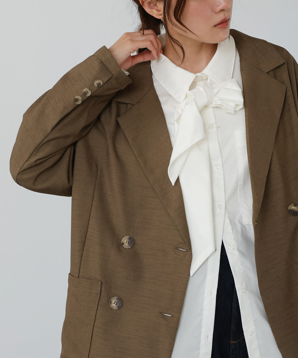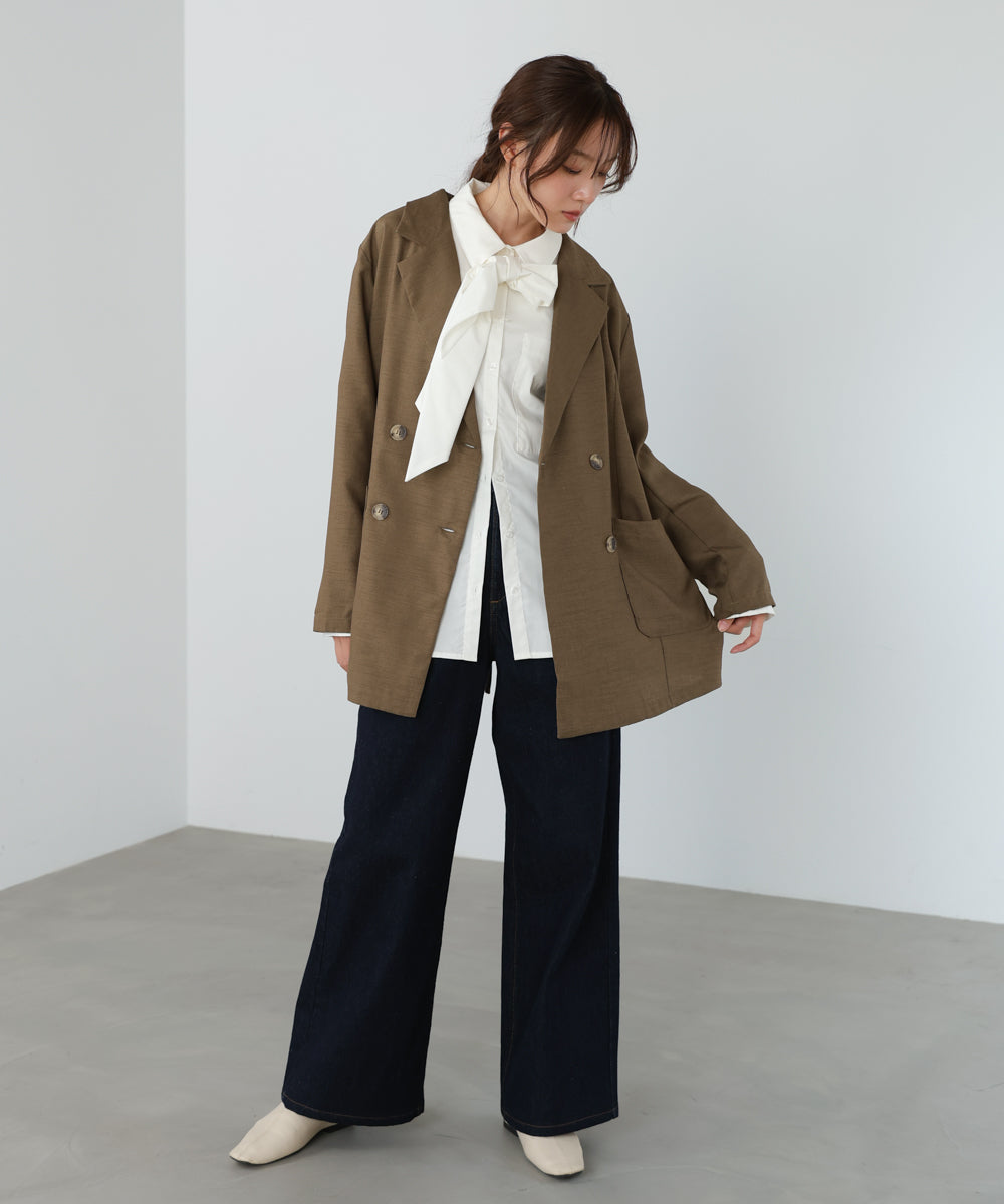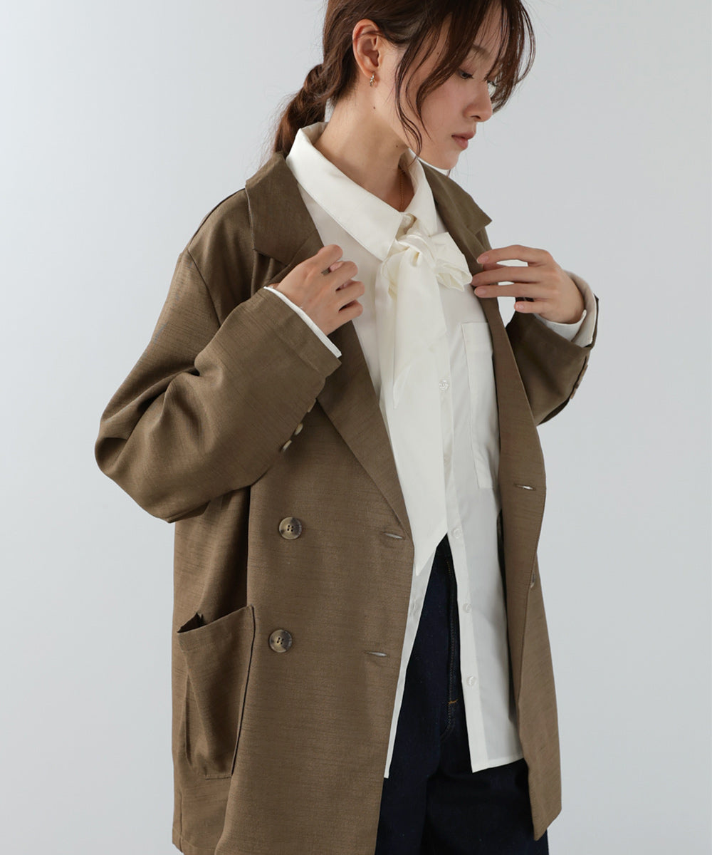 バックデザインがポイントの秋ジャケットが登場しました!バックに入った大胆なスリットにリボンがあしらわれています♪重たすぎずな質感なのでワンピースに羽織として、デニムとチュニックなどのレイヤードとして秋シーズン大活躍なジャケットです!流行りのリボンにダブルボタンでトレンドライクなジャケットに仕上がっています!