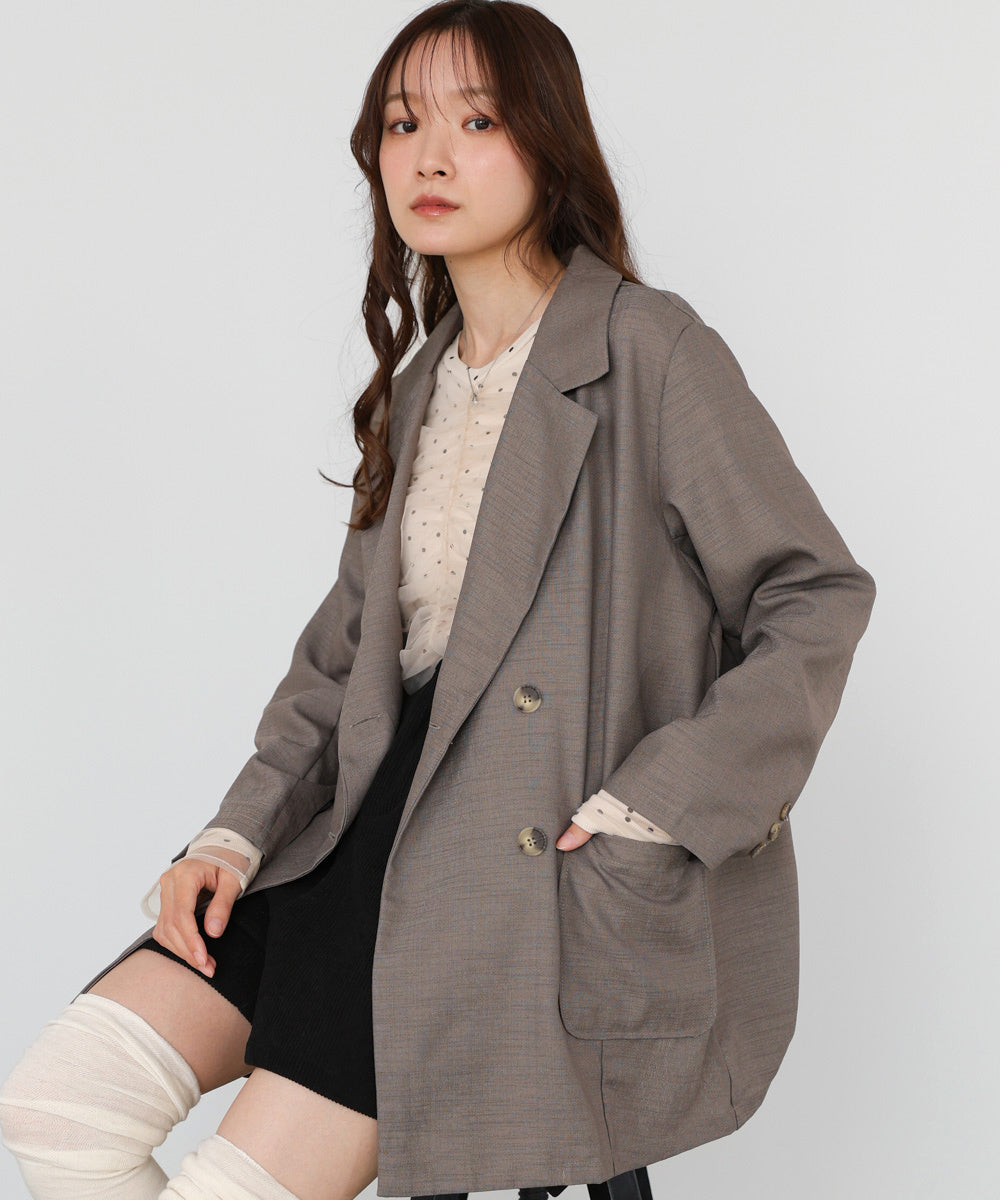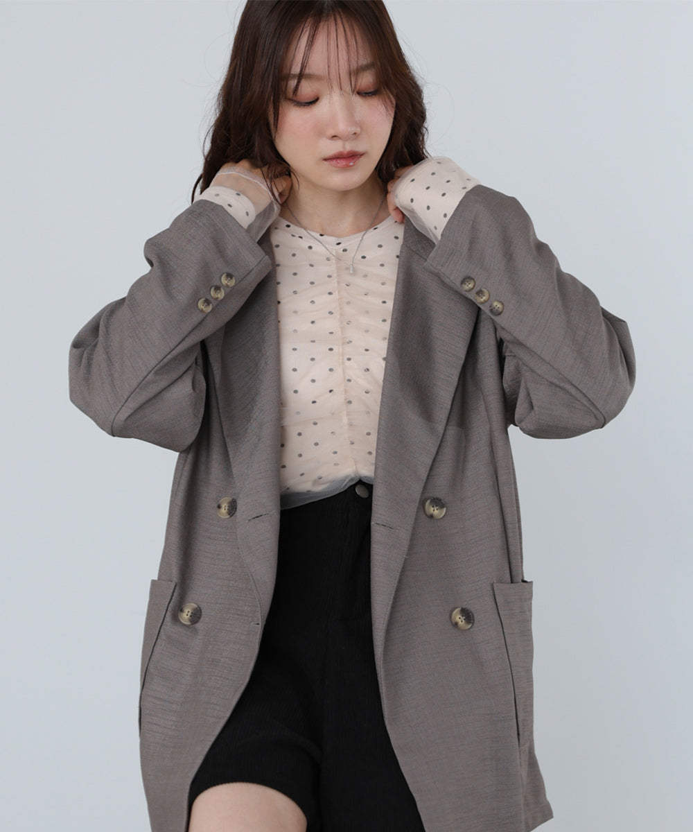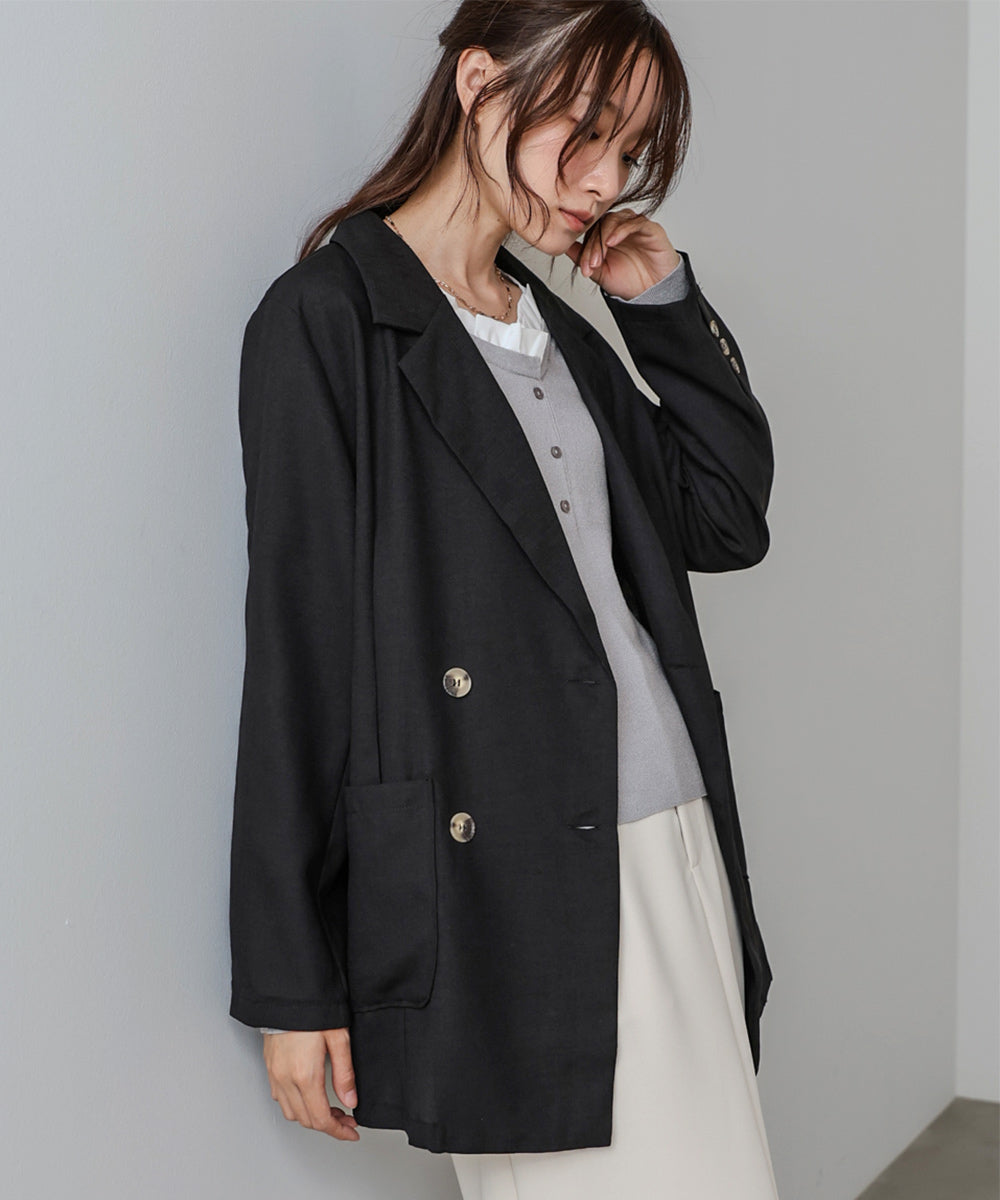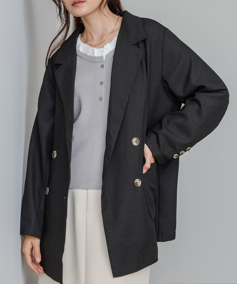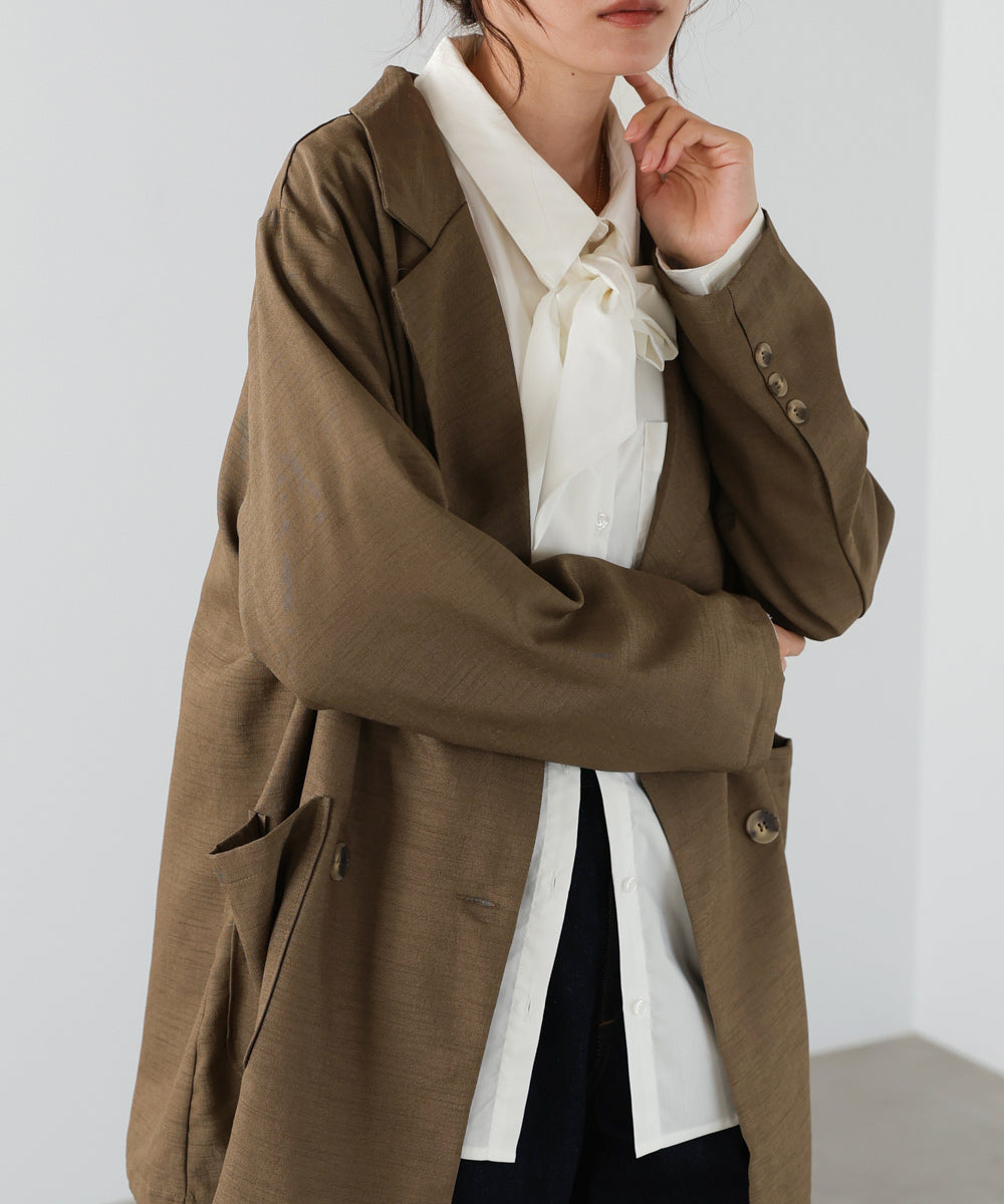バックデザインがポイントの秋ジャケットが登場しました!バックに入った大胆なスリットにリボンがあしらわれています♪重たすぎずな質感なのでワンピースに羽織として、デニムとチュニックなどのレイヤードとして秋シーズン大活躍なジャケットです!流行りのリボンにダブルボタンでトレンドライクなジャケットに仕上がっています!