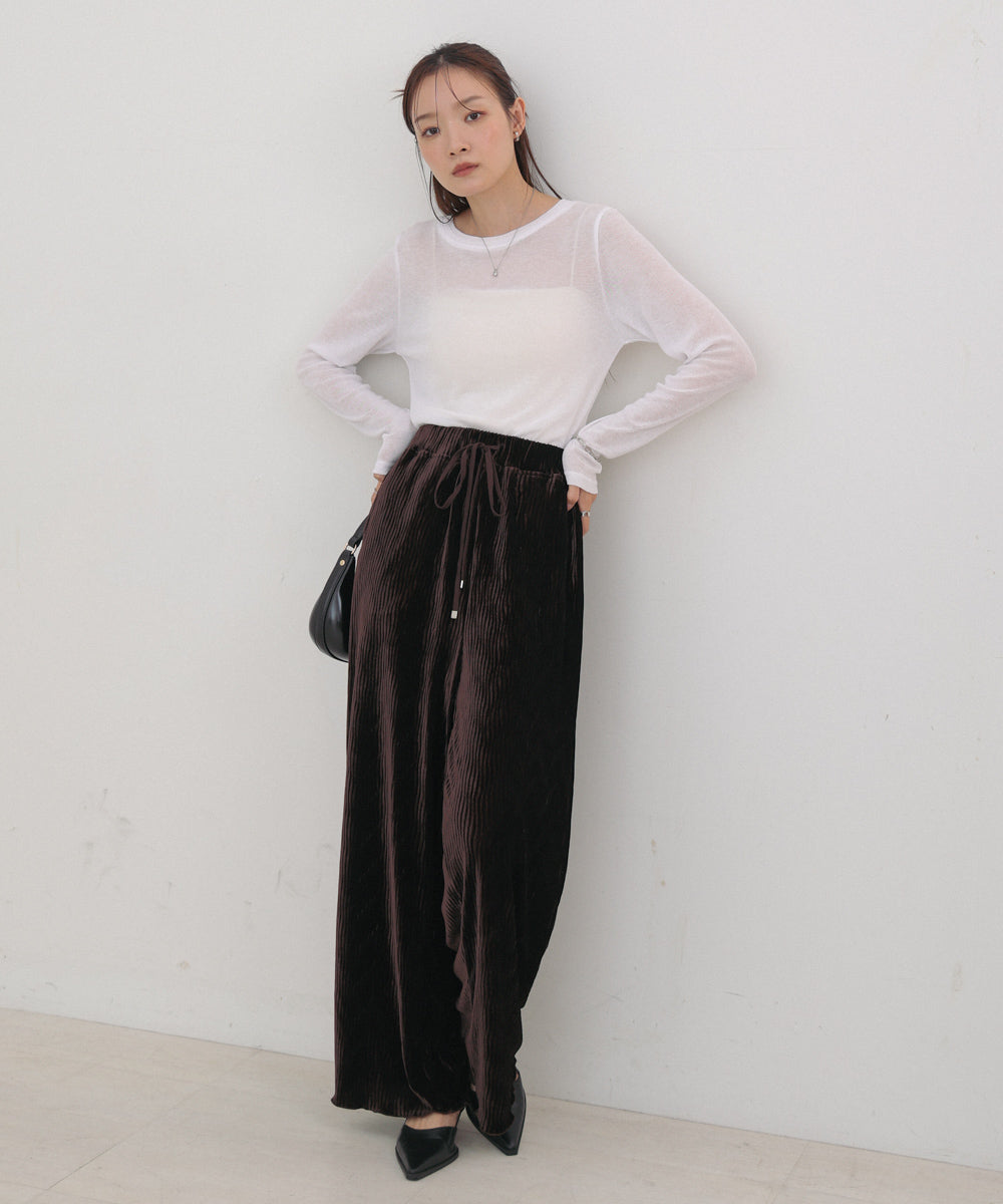 光沢感あふれるベロアパンツが登場!ベロア生地が上品さを引き立てる一方でウエスト部分はゴムで仕上げる事でラフに着ていただけます。薄手のカットソーだけでなく、ニットやべロア素材のベストなど様々な素材と合うので何にでも合わせやすいのがポイントです。