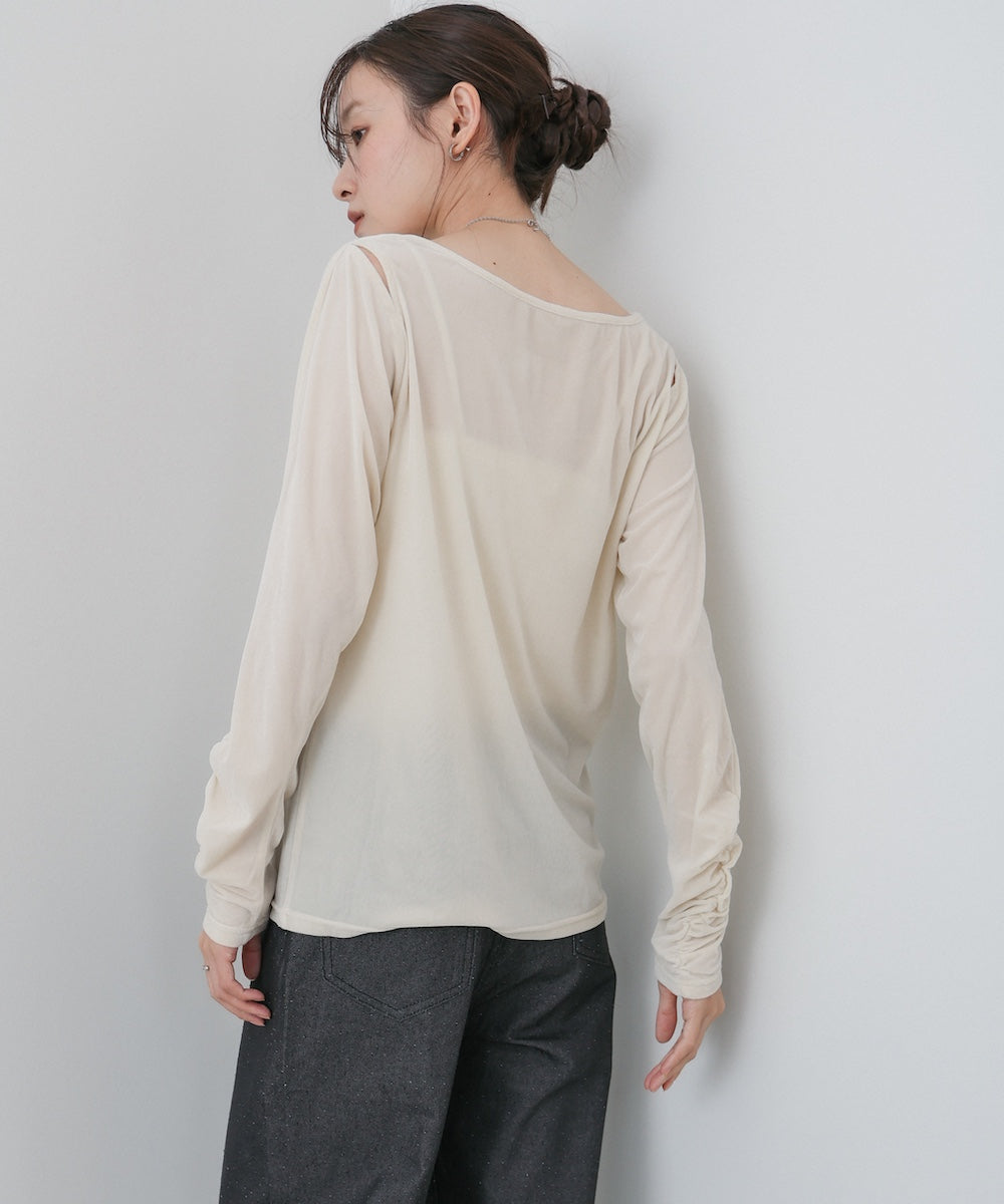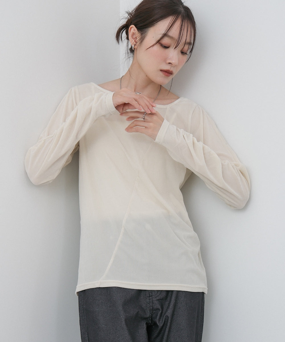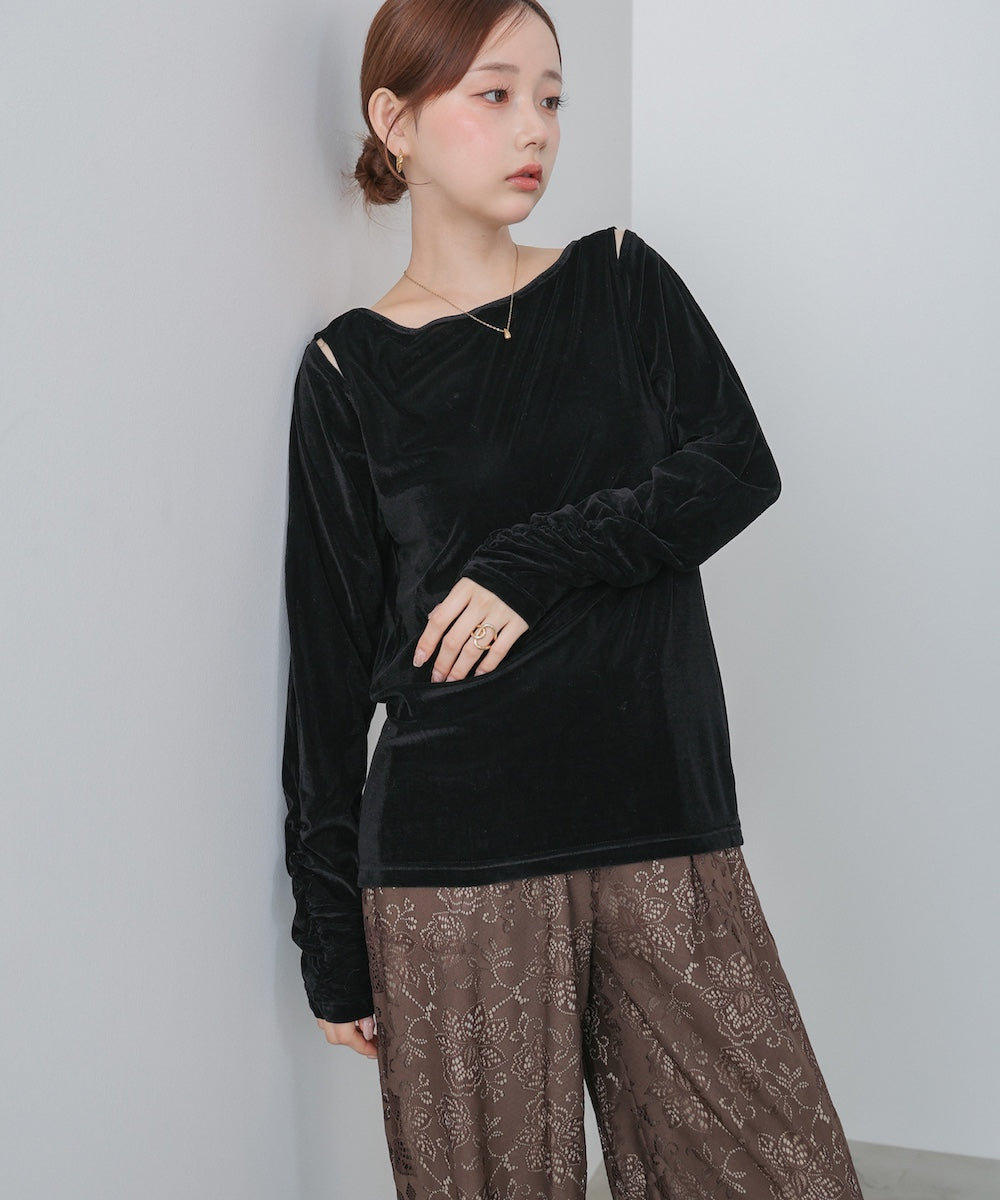 シアー感とベロアの上品な艶が女性らしさを引き立てる、前後2WAY仕様のトップス。肩部分にさりげない肌見せディテールを入れることで、ヘルシーな抜け感をプラス。後ろは斜めに入った切り替えデザインで、どこから見ても印象的なシルエットに仕上がっています。袖はひじ下からくしゅくしゅとギャザーが寄り、華やかで立体的な表情を演出。シンプルながらも一枚で着映える存在感のあるアイテムです。前後どちらでも着られる2WAY仕様なので、その日の気分やシーンに合わせて着こなしを楽しめます。