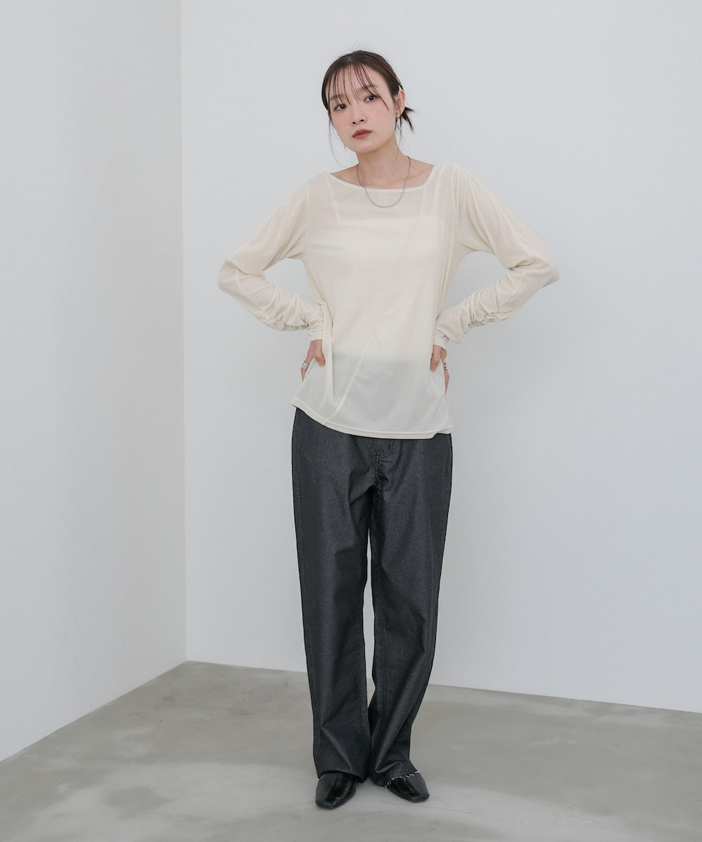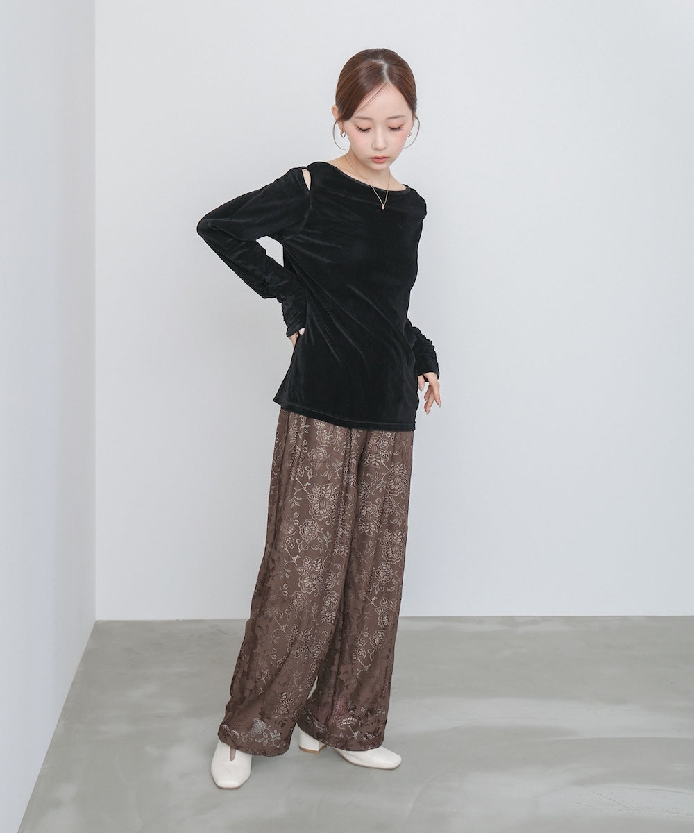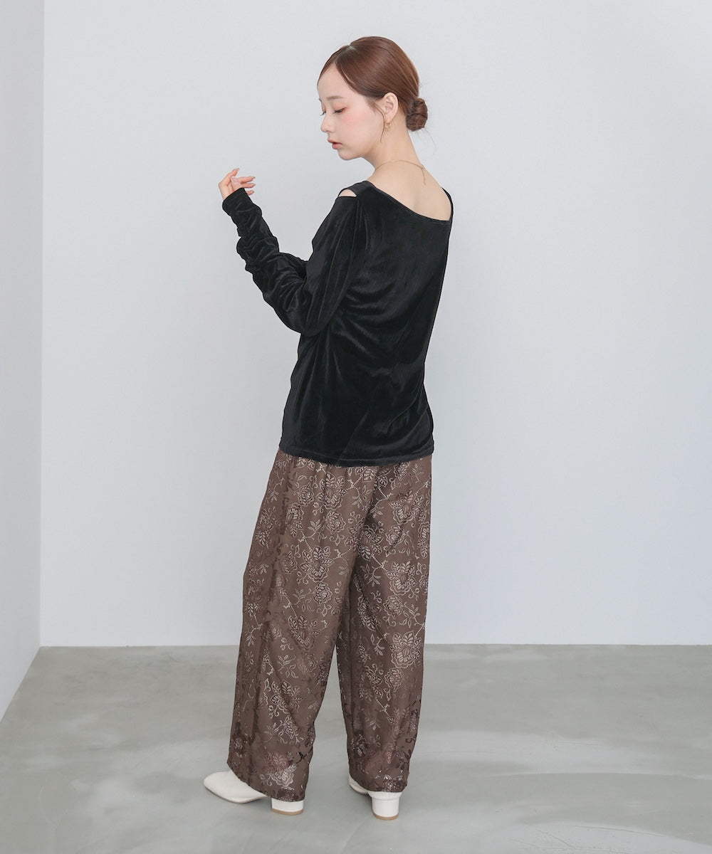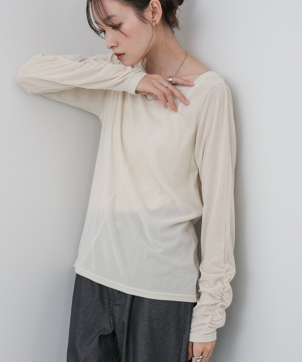 シアー感とベロアの上品な艶が女性らしさを引き立てる、前後2WAY仕様のトップス。肩部分にさりげない肌見せディテールを入れることで、ヘルシーな抜け感をプラス。後ろは斜めに入った切り替えデザインで、どこから見ても印象的なシルエットに仕上がっています。袖はひじ下からくしゅくしゅとギャザーが寄り、華やかで立体的な表情を演出。シンプルながらも一枚で着映える存在感のあるアイテムです。前後どちらでも着られる2WAY仕様なので、その日の気分やシーンに合わせて着こなしを楽しめます。