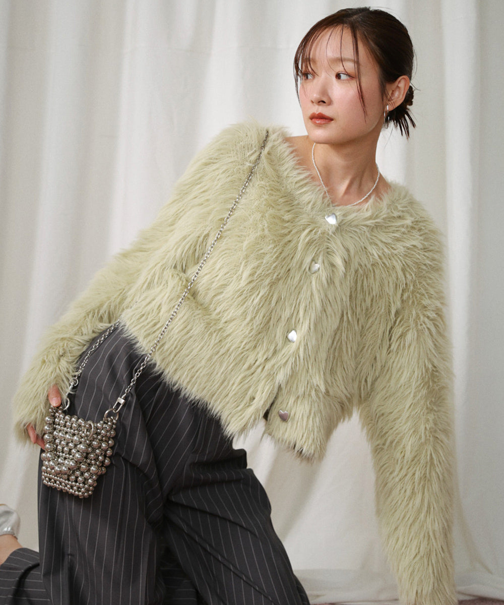 着丈が選べる万能シャギーニットカーディガンが登場です!ボタン部分はハートになっていてガーリーな一面もあるカーディガンは、この秋冬大活躍すること間違いなしです。アイボリーのみボタン部分がゴールドに、そのほかのカラーはシルバーになっています。ふわっとしていて暖かいシャギーが着るだけでフェミニンな印象を与えます。ショート丈はUネックに、ミドル丈はVネックとどちらも華奢見えするようなデザインになっています。また、ショート丈の方はサムホールがついているため袖が長すぎる問題を解消してくれます。