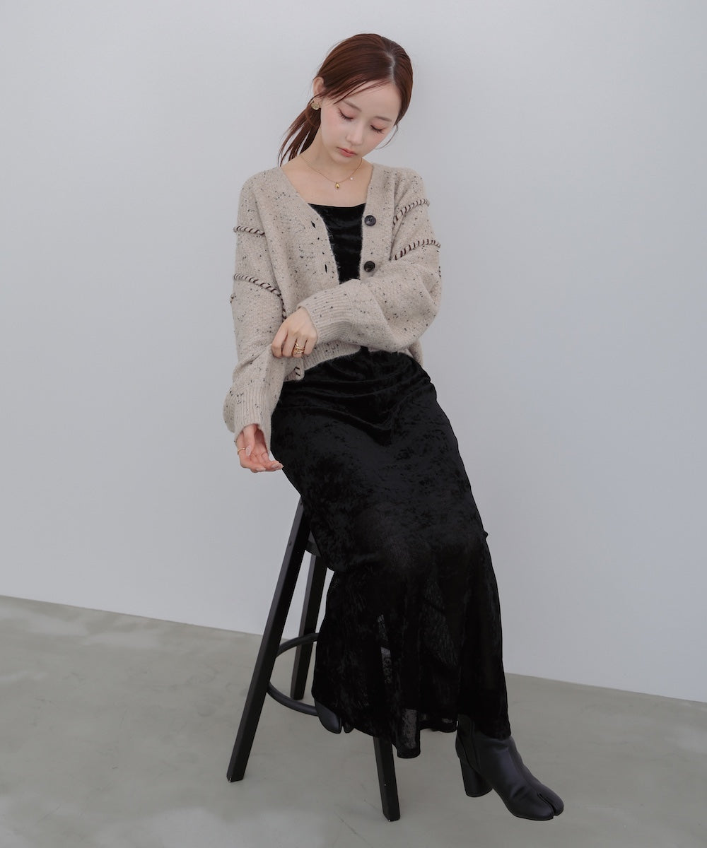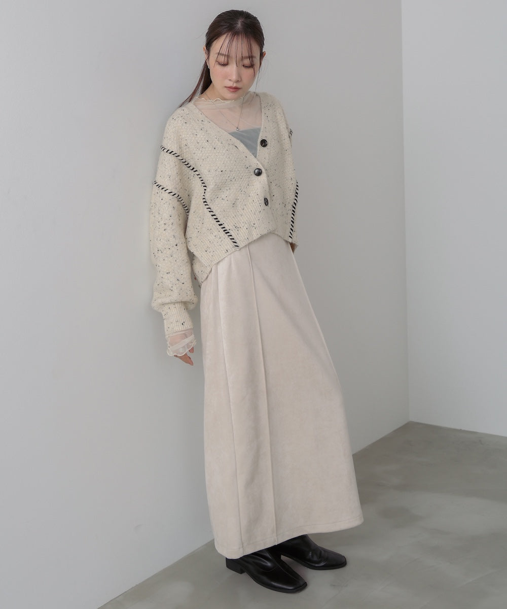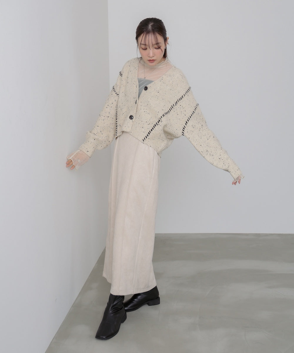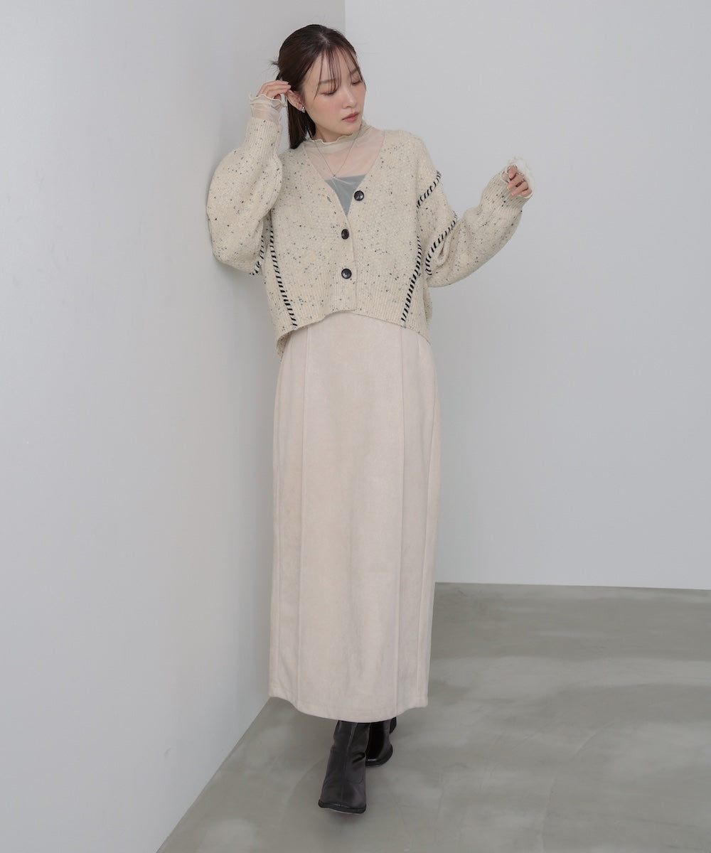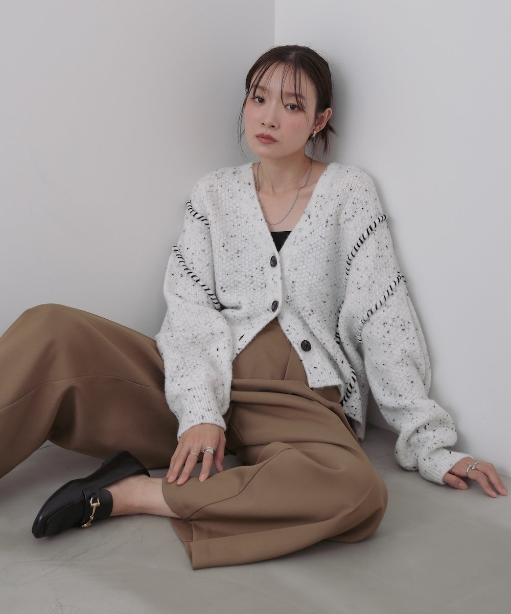 薄手トップスの上から合わせたり、ワンピースの上から羽織ったりと使い回しの利くアイテムです。デザイン性のあるニットカーデなのでボトムスはシンプルなものと相性◎です!