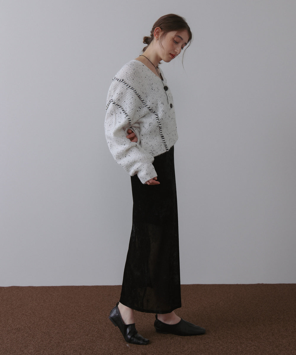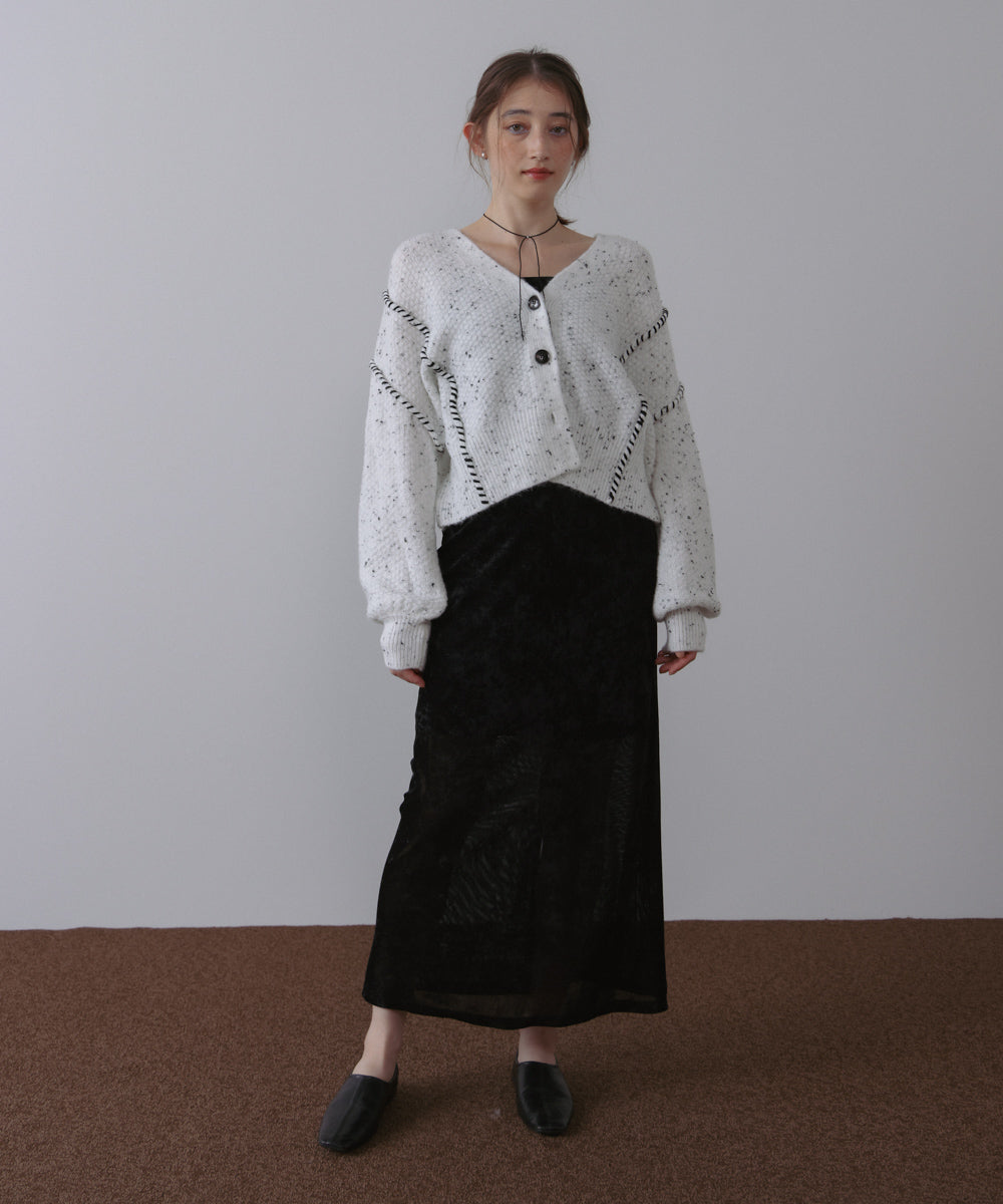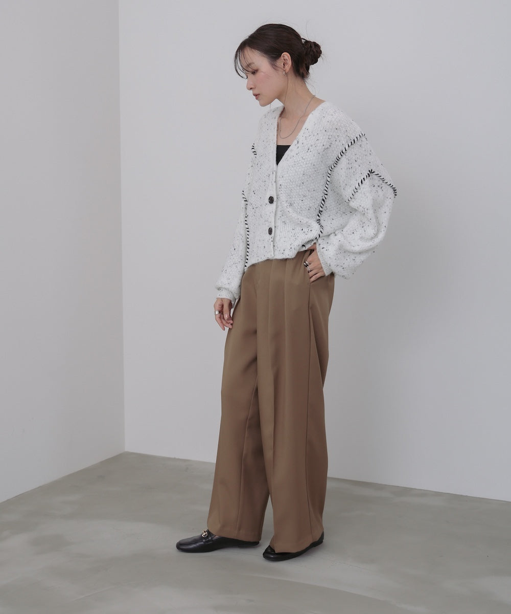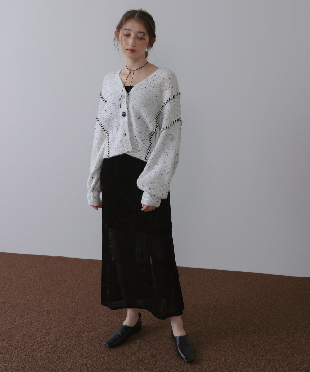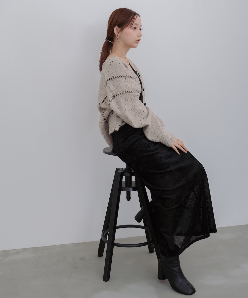 薄手トップスの上から合わせたり、ワンピースの上から羽織ったりと使い回しの利くアイテムです。デザイン性のあるニットカーデなのでボトムスはシンプルなものと相性◎です!