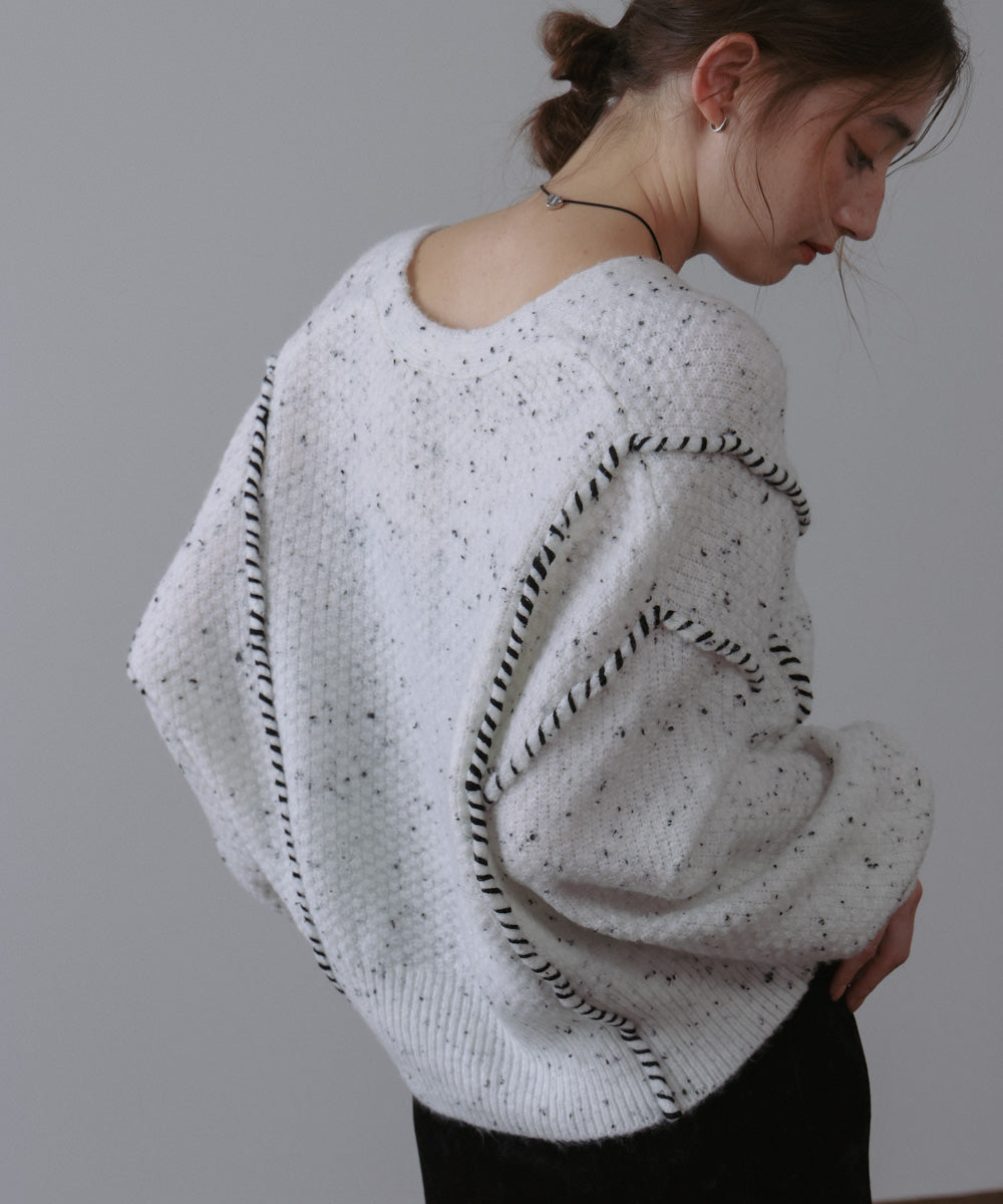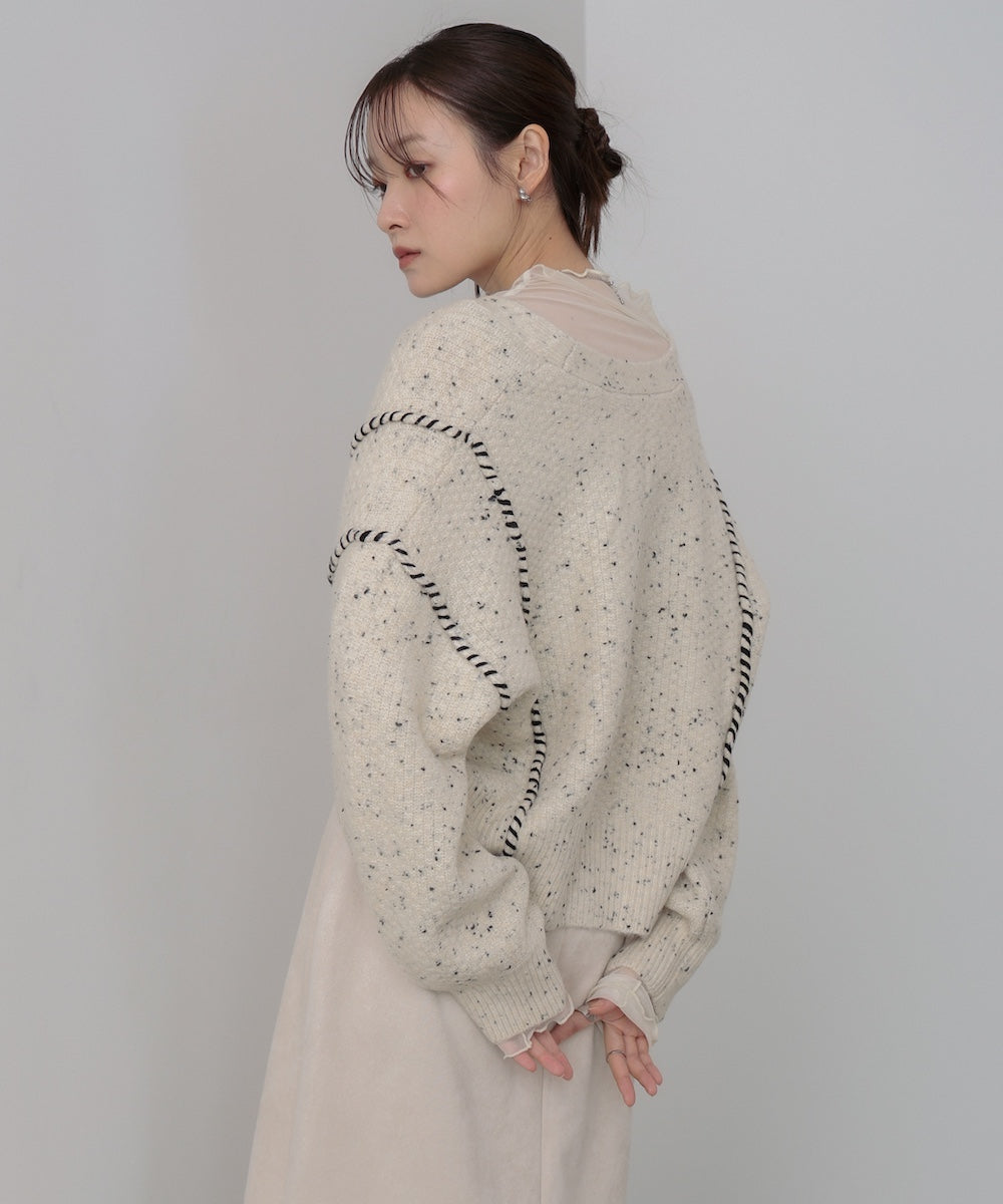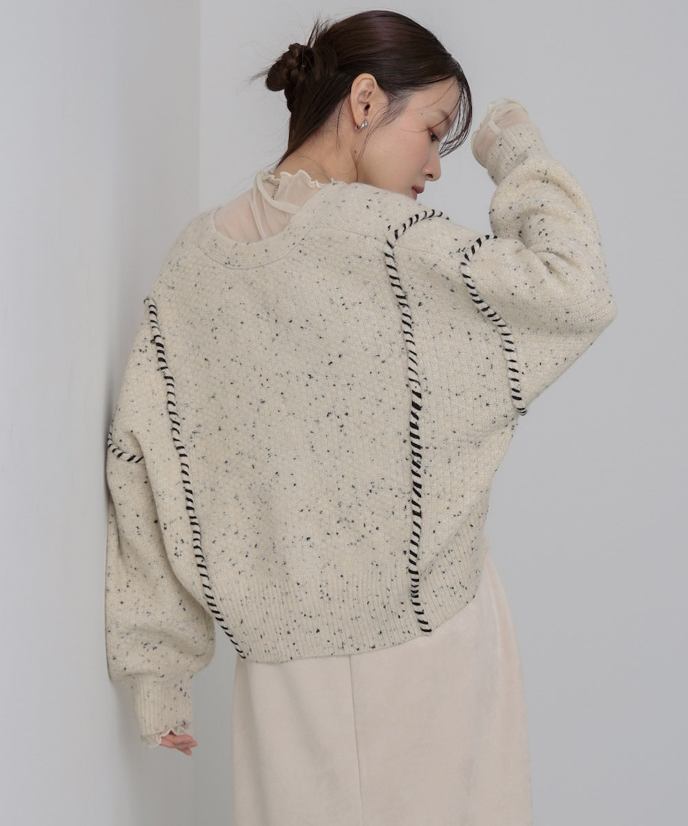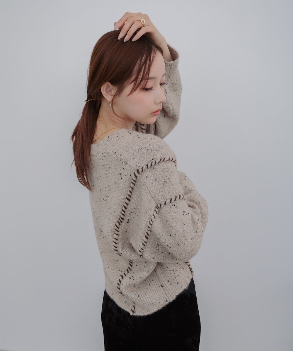 5540012 チョコチップ風ネップ編み上げニットトップス