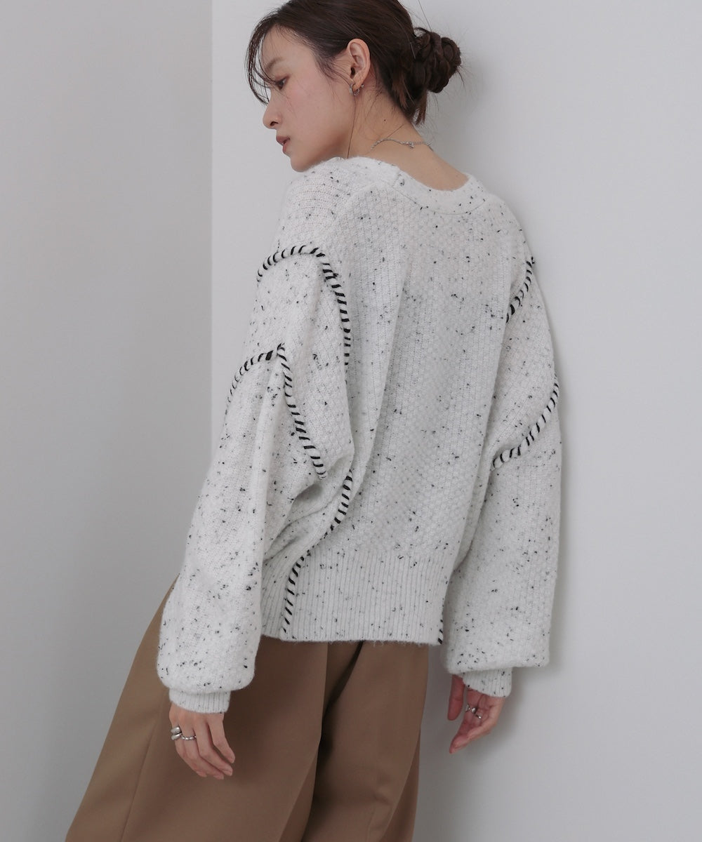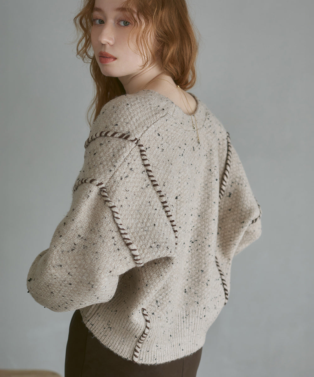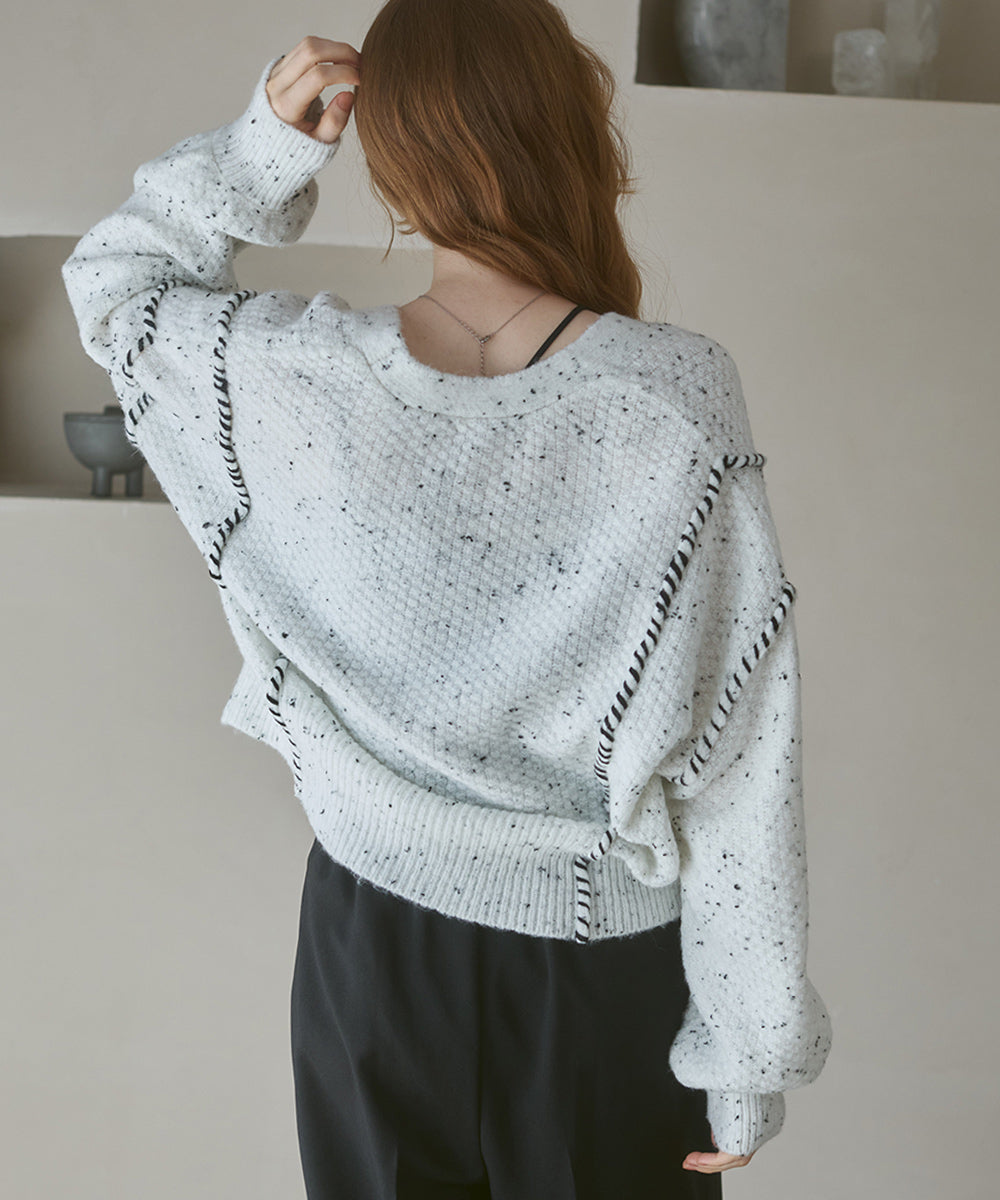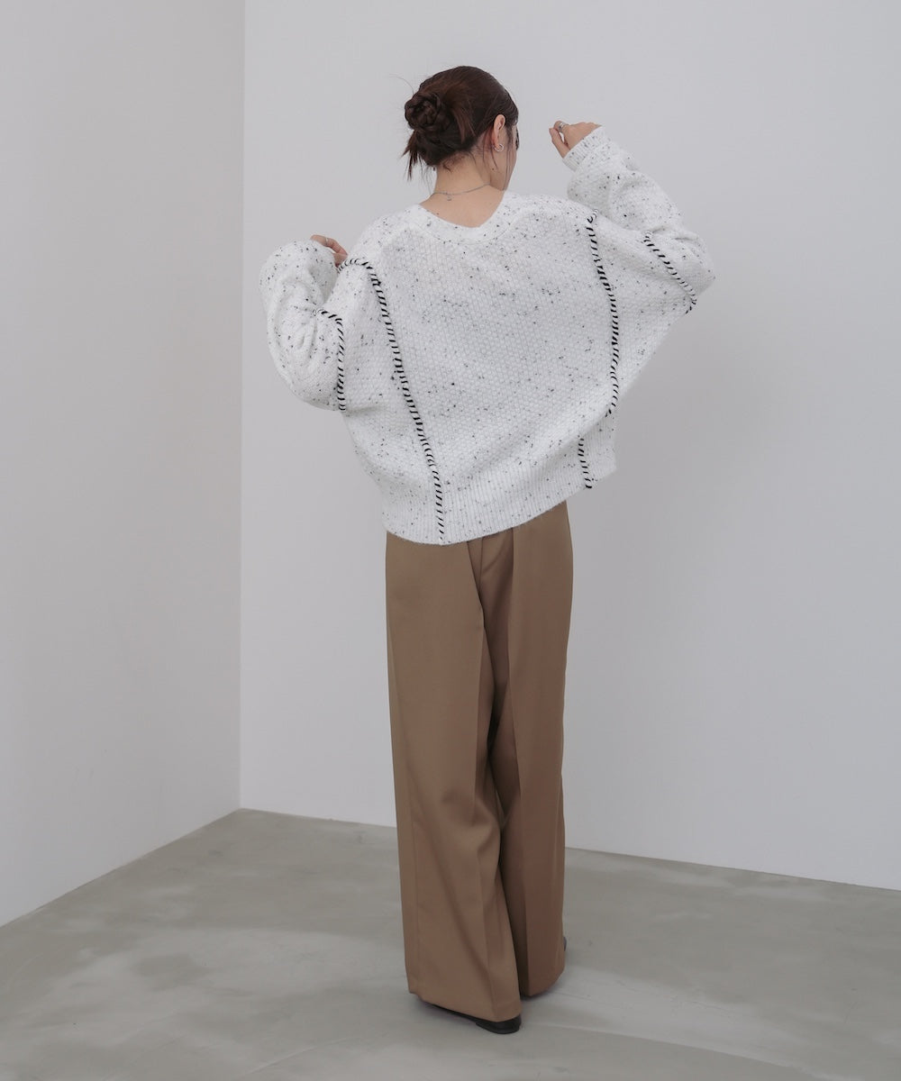 5540012 チョコチップ風ネップ編み上げニットトップス