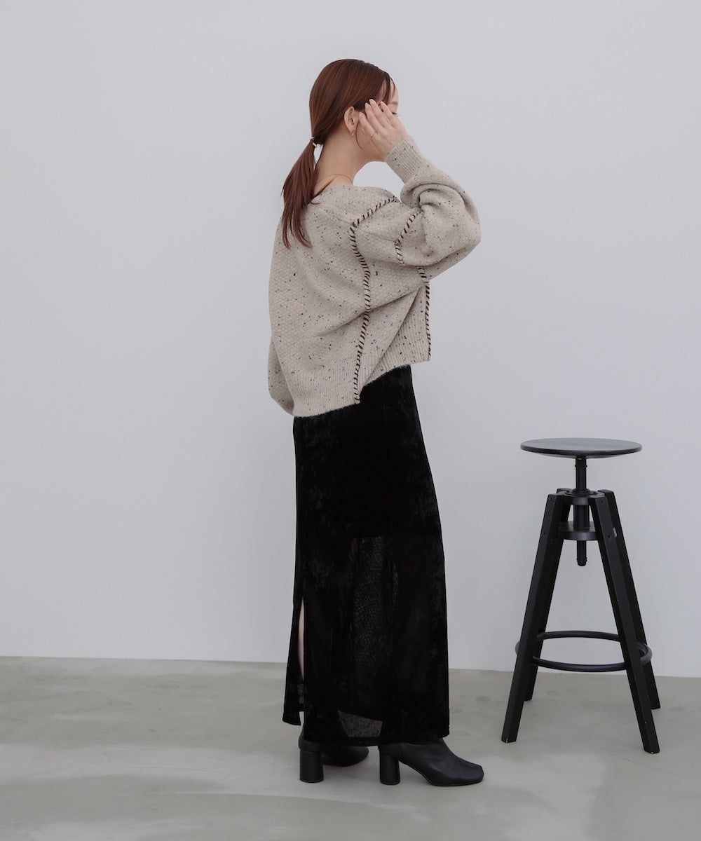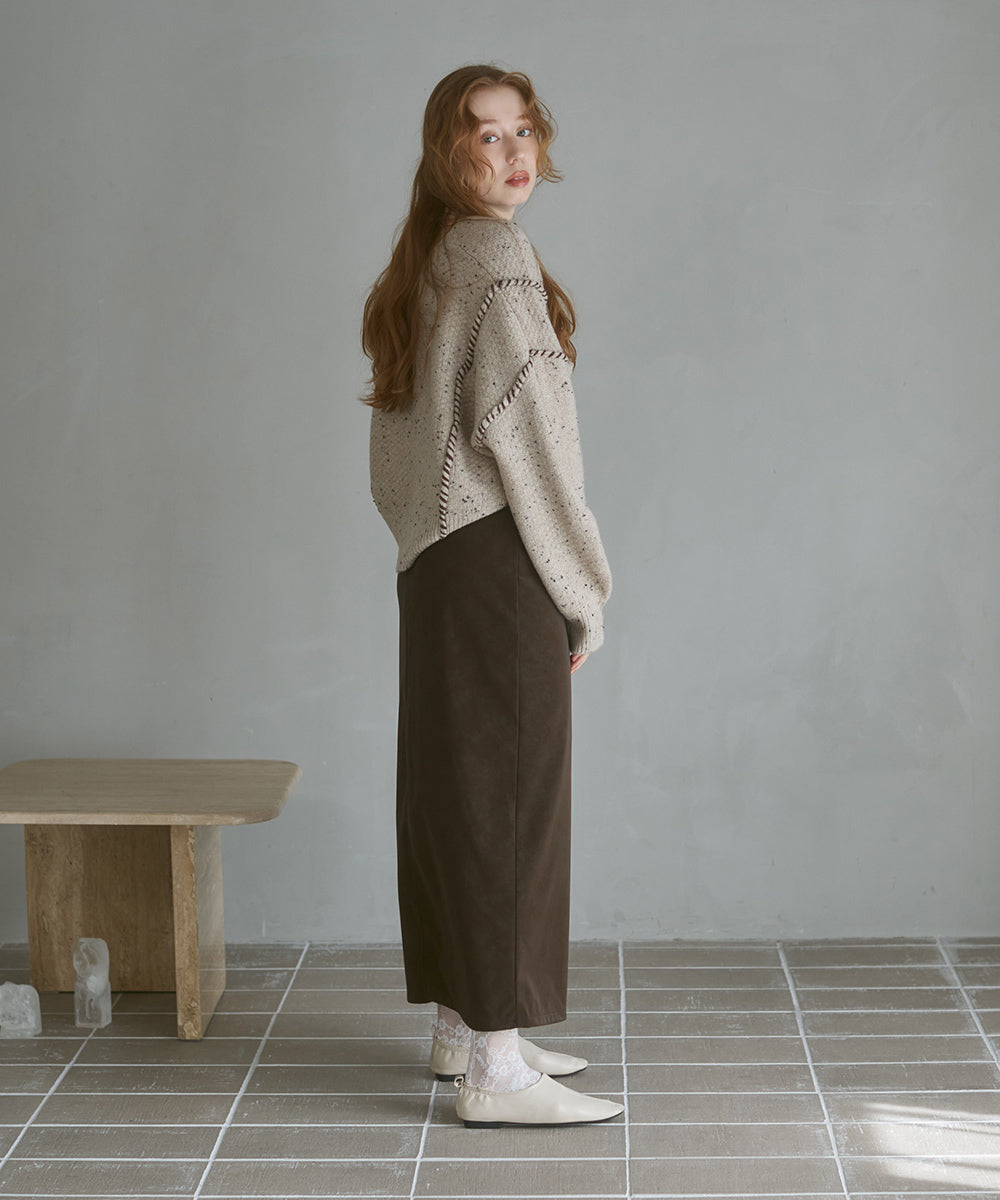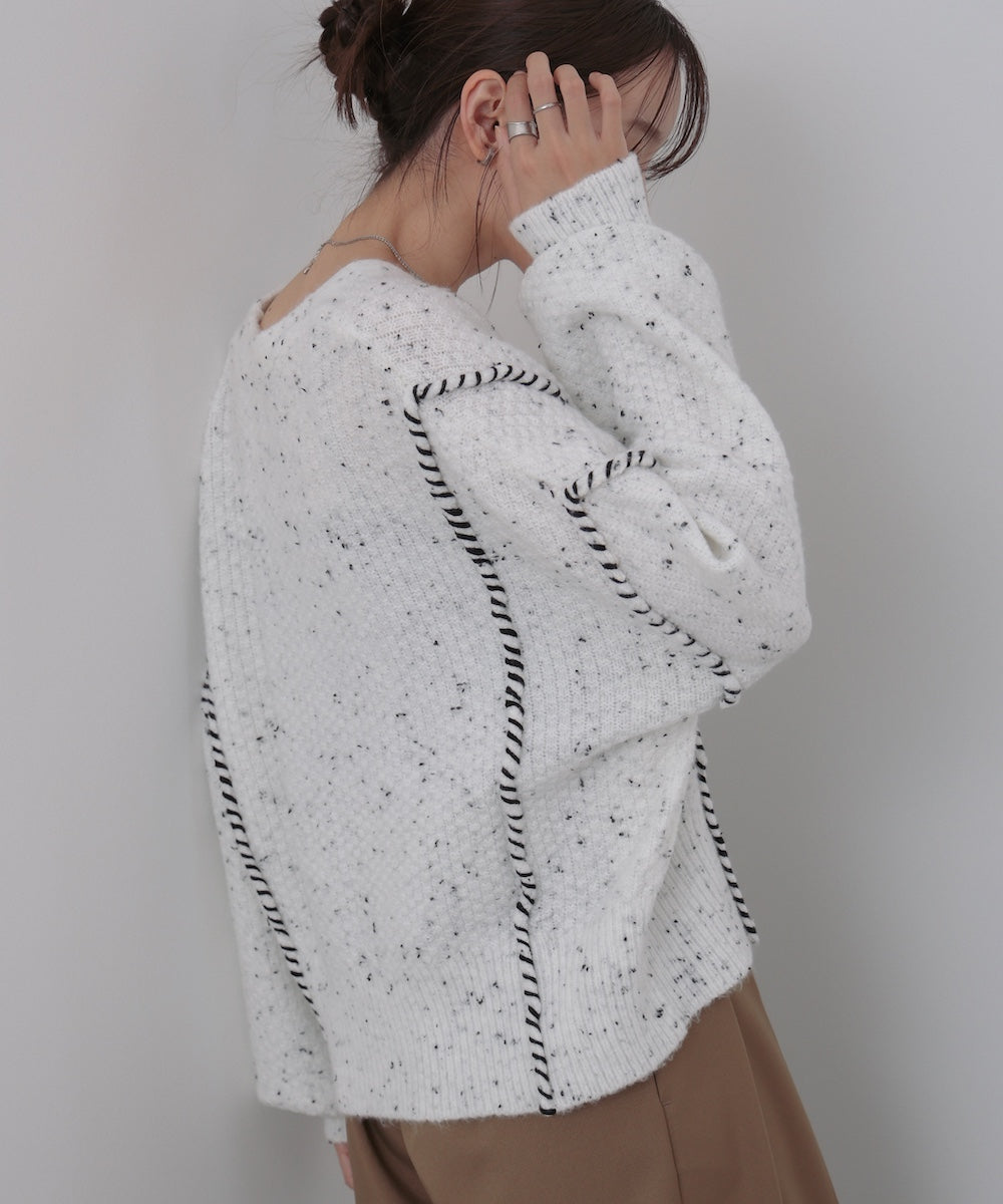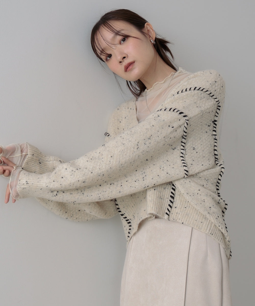 5540012 チョコチップ風ネップ編み上げニットトップス
