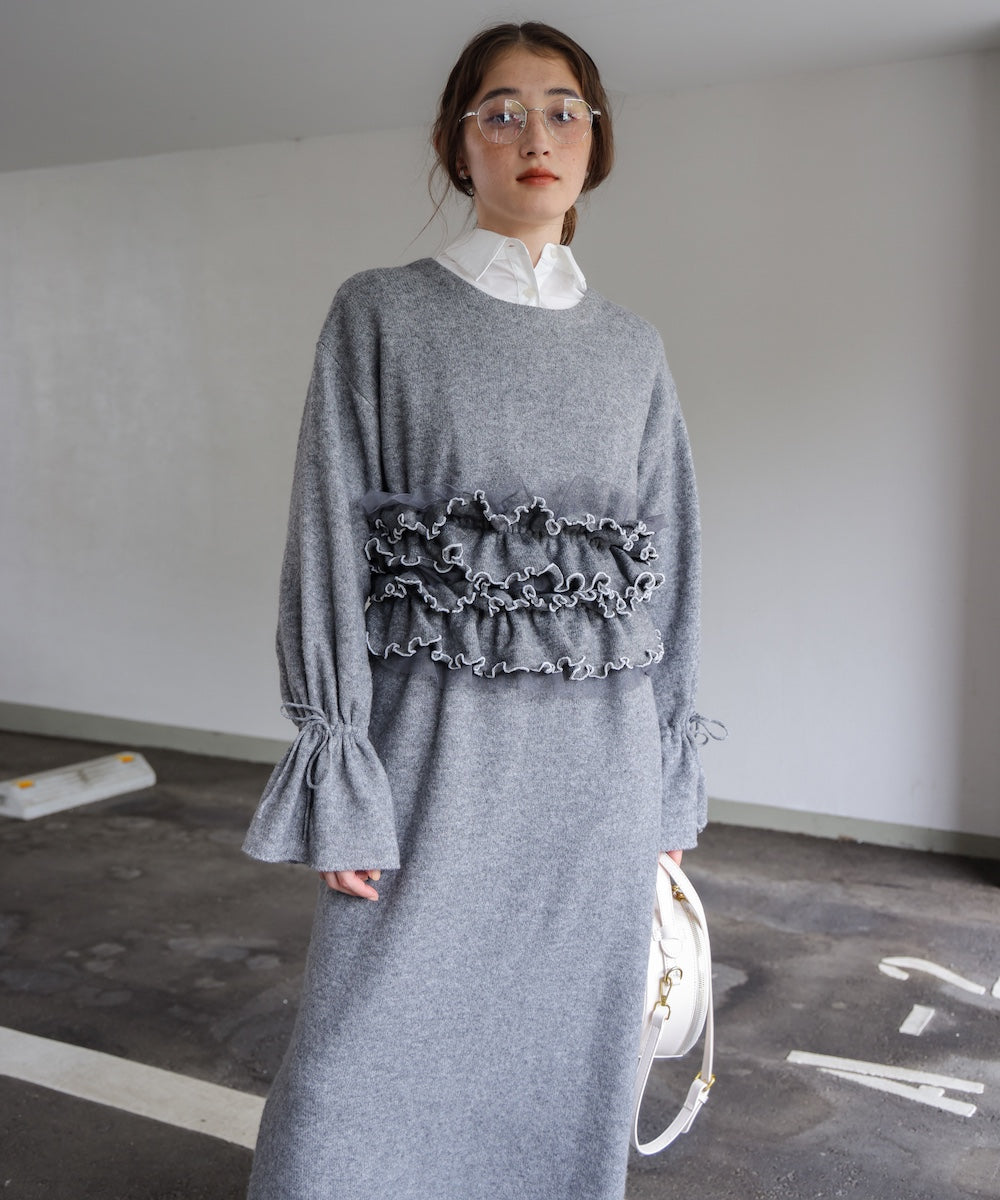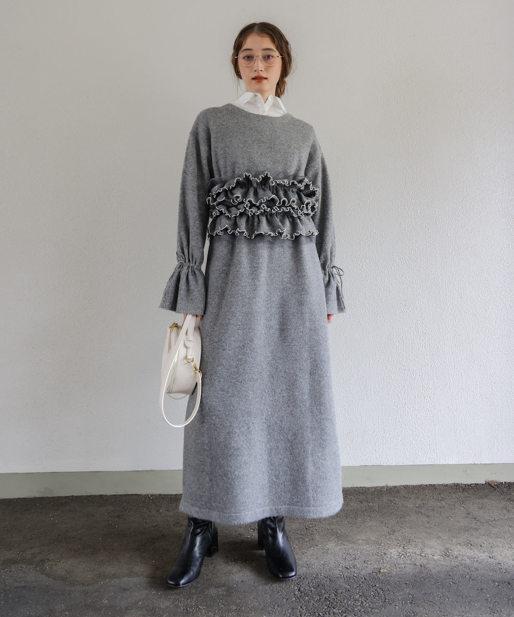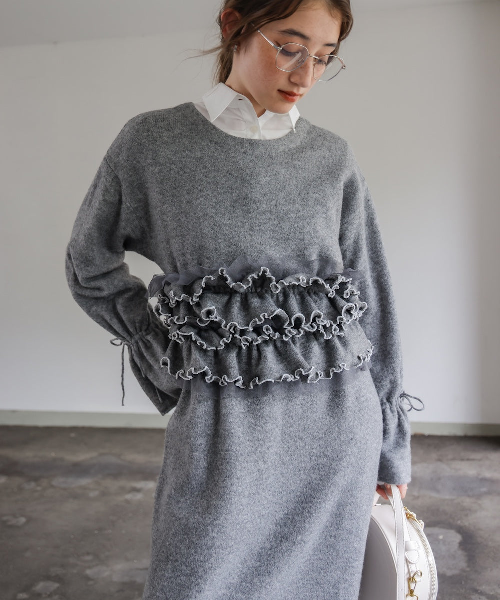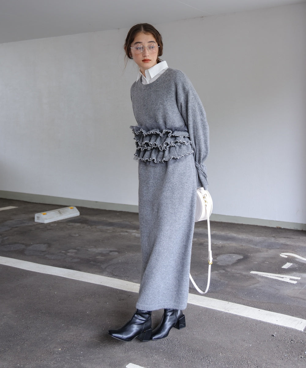【S・M・Lサイズ】アシンメトリーフリルニットワンピース