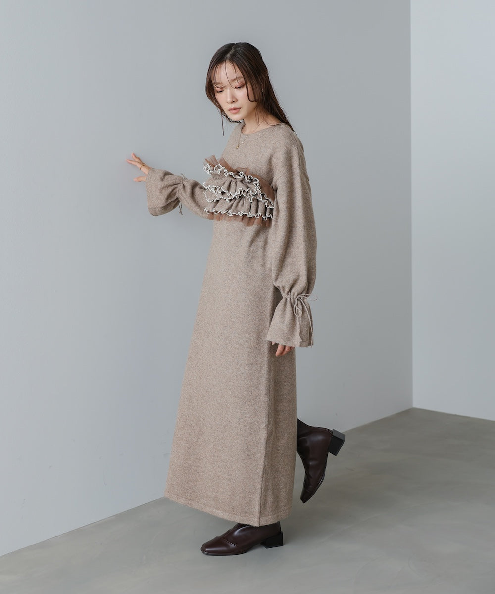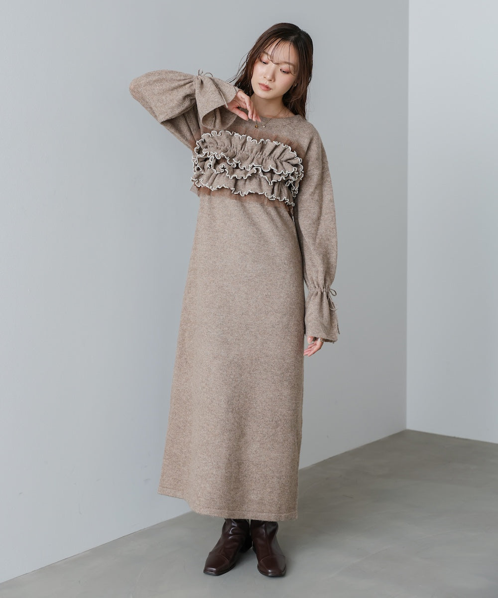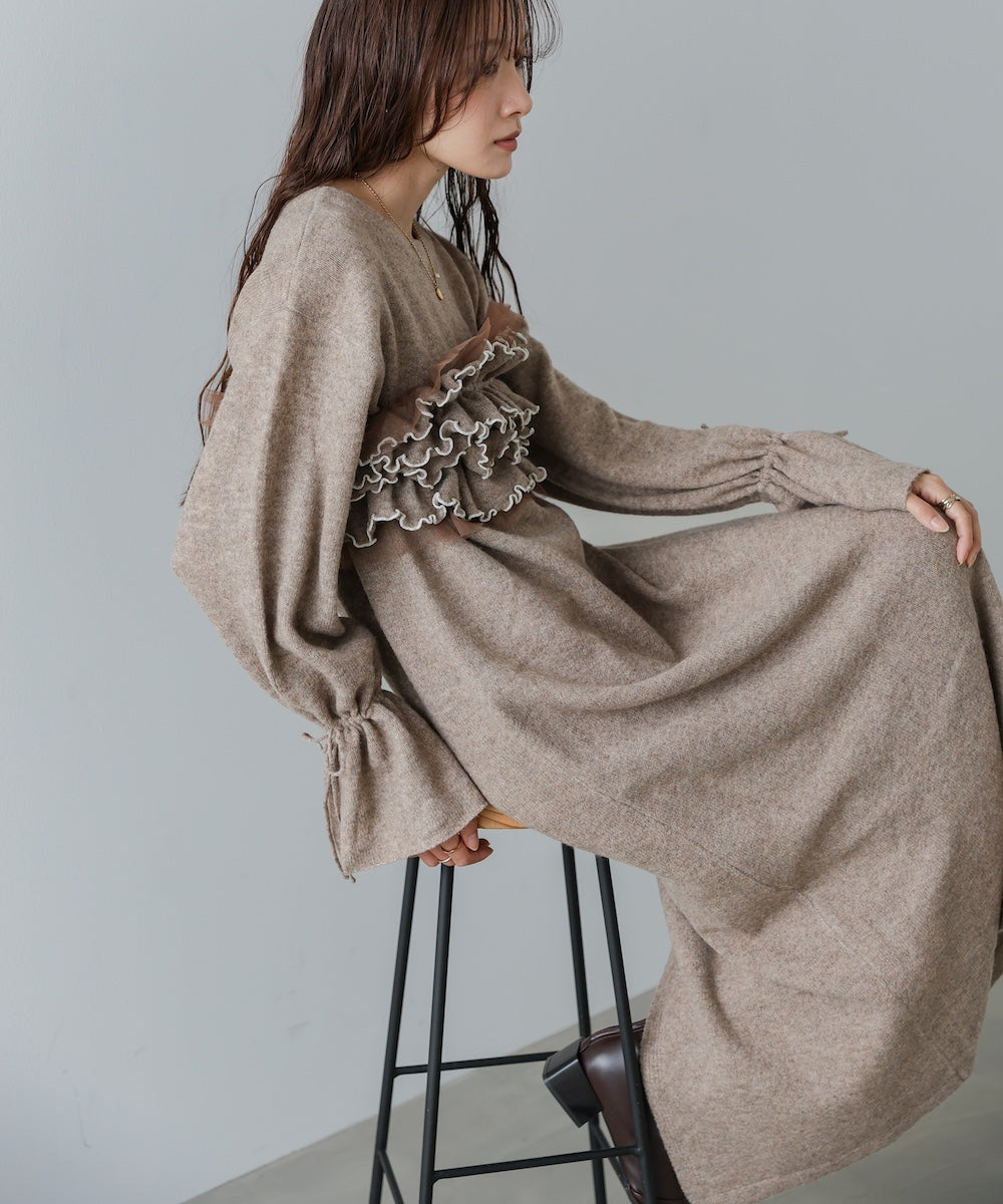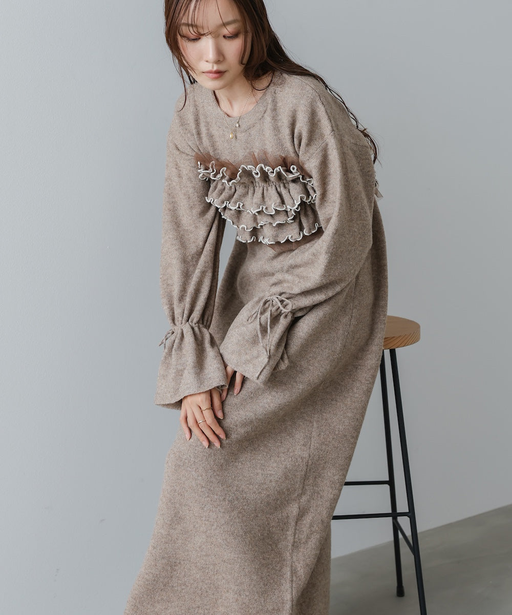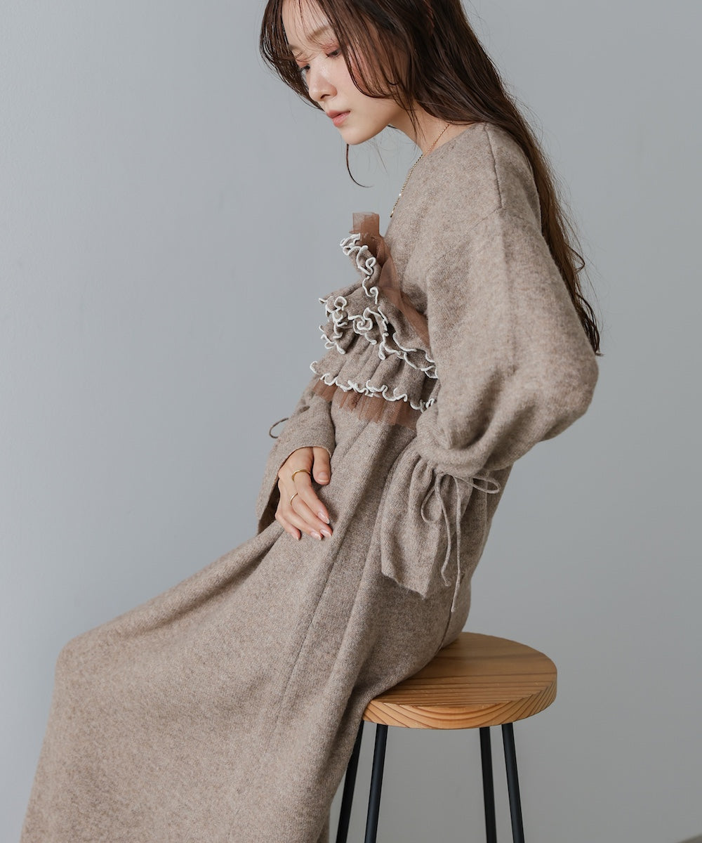 チュール×フリル×ニットの異素材ミックスが目を惹く、ビスチェセットニットワンピース。柔らかなニット素材のワンピースに、フリルデザインのビスチェを重ねたようなセットデザインで、1枚で旬のレイヤードスタイルが完成します。ビスチェはキャミタイプではなく、肩まわりをすっきり見せるフリル仕様。フリルにチュールが重なり、やわらかな華やかさを演出します。袖口にはリボンがあしらわれ、キュッと結ぶことでふんわりと広がるシルエットに。モカ・ベージュ・チャコールの落ち着いたトーンで、可愛らしさの中にも大人の上品さを感じさせる着映えワンピです。