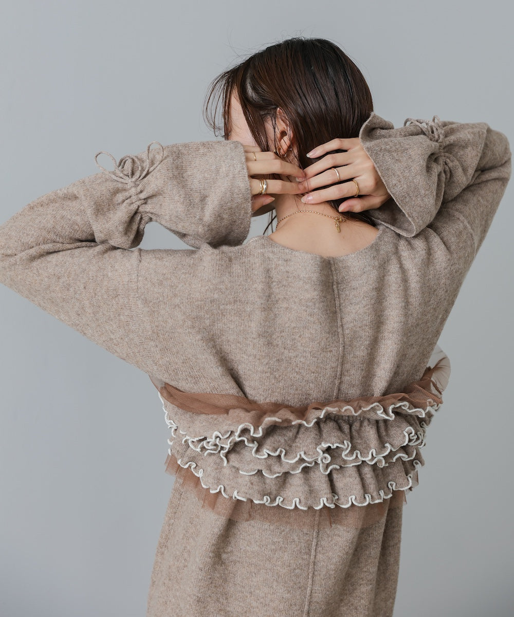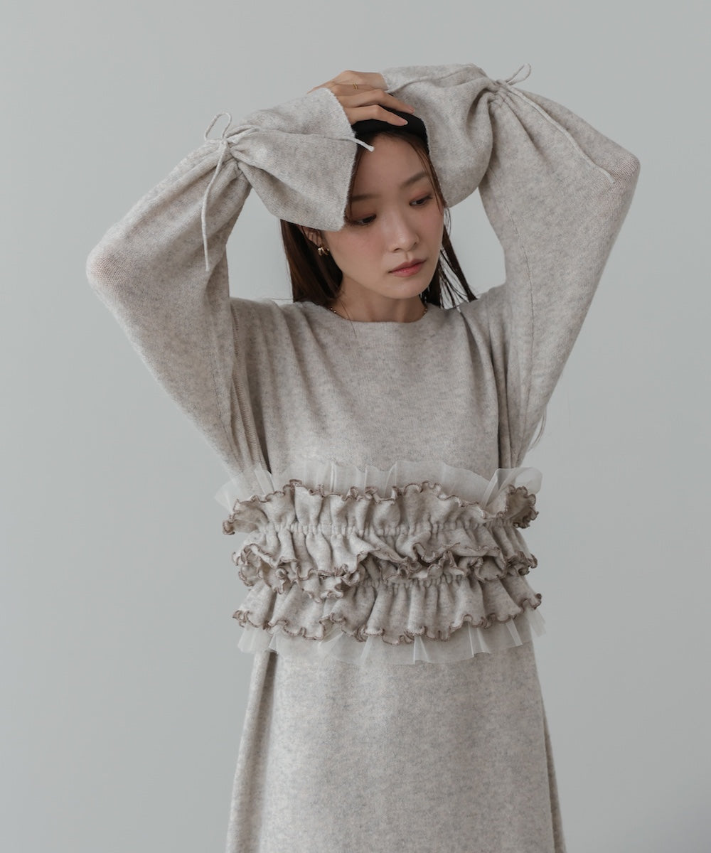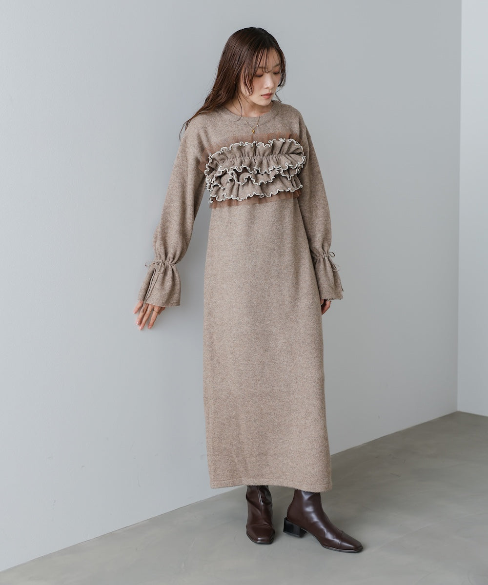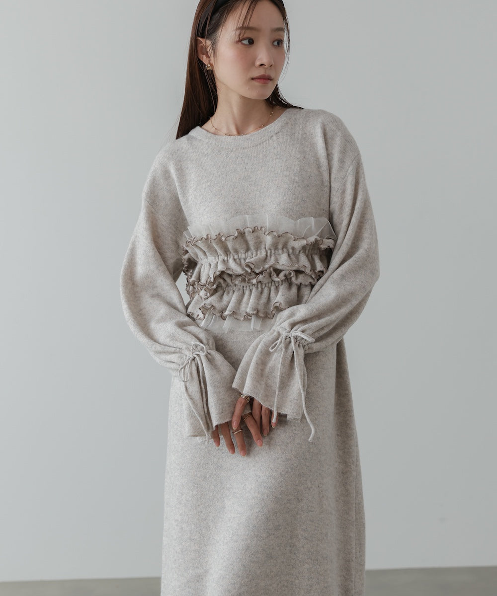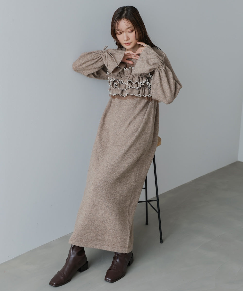 チュール×フリル×ニットの異素材ミックスが目を惹く、ビスチェセットニットワンピース。柔らかなニット素材のワンピースに、フリルデザインのビスチェを重ねたようなセットデザインで、1枚で旬のレイヤードスタイルが完成します。ビスチェはキャミタイプではなく、肩まわりをすっきり見せるフリル仕様。フリルにチュールが重なり、やわらかな華やかさを演出します。袖口にはリボンがあしらわれ、キュッと結ぶことでふんわりと広がるシルエットに。モカ・ベージュ・チャコールの落ち着いたトーンで、可愛らしさの中にも大人の上品さを感じさせる着映えワンピです。