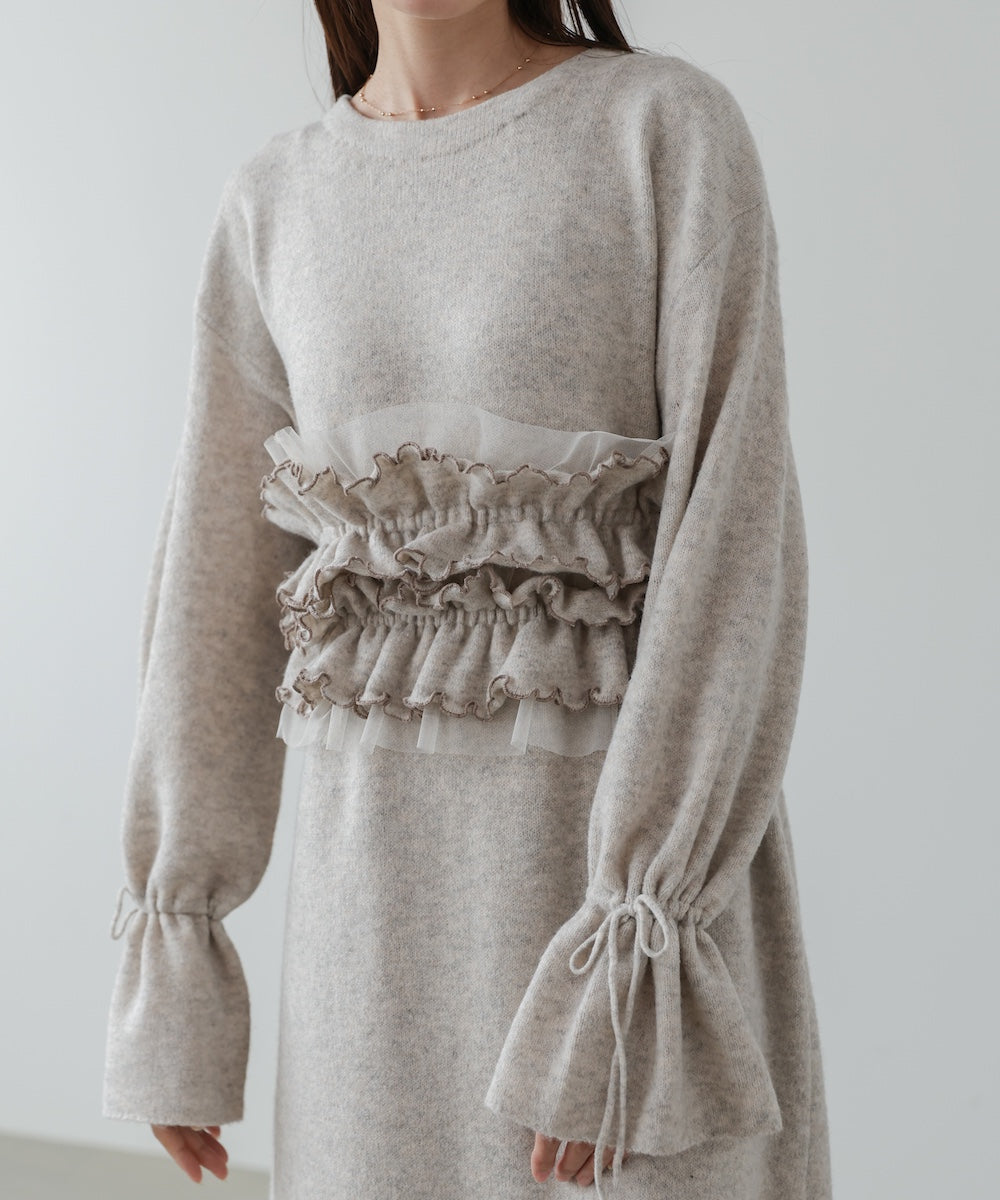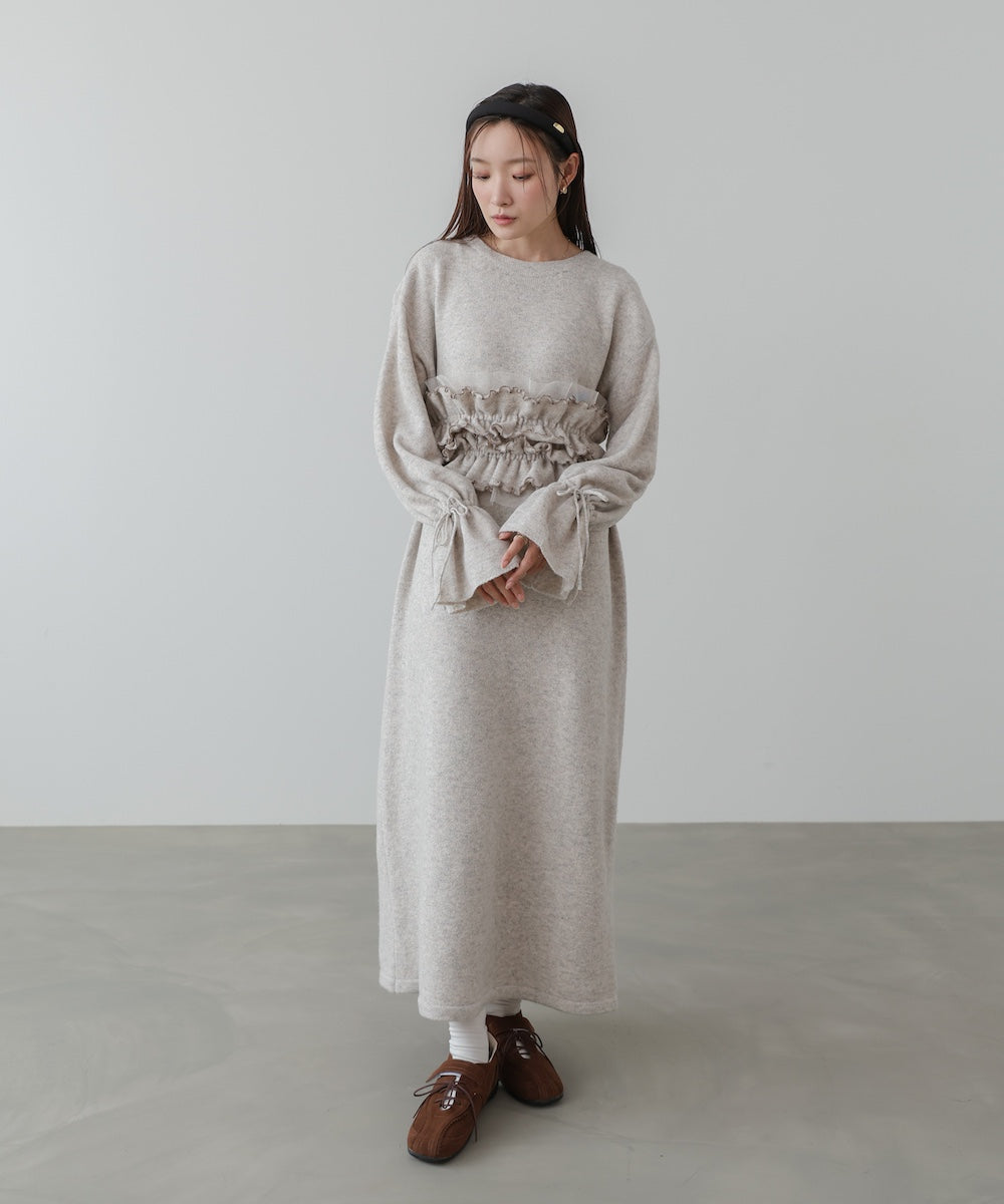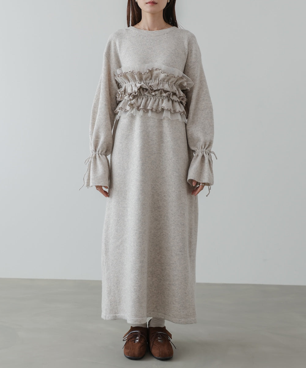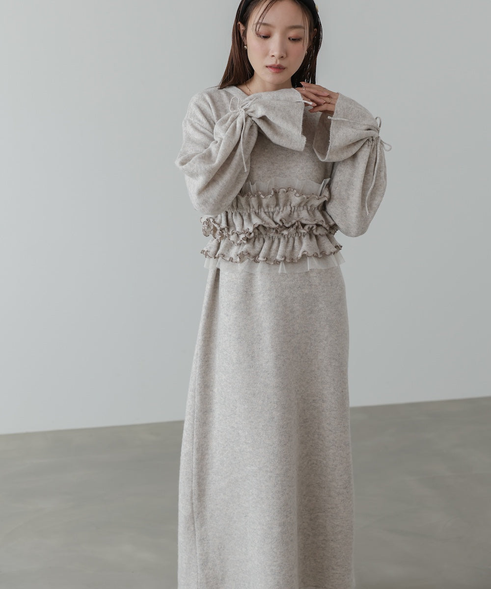 チュール×フリル×ニットの異素材ミックスが目を惹く、ビスチェセットニットワンピース。柔らかなニット素材のワンピースに、フリルデザインのビスチェを重ねたようなセットデザインで、1枚で旬のレイヤードスタイルが完成します。ビスチェはキャミタイプではなく、肩まわりをすっきり見せるフリル仕様。フリルにチュールが重なり、やわらかな華やかさを演出します。袖口にはリボンがあしらわれ、キュッと結ぶことでふんわりと広がるシルエットに。モカ・ベージュ・チャコールの落ち着いたトーンで、可愛らしさの中にも大人の上品さを感じさせる着映えワンピです。
