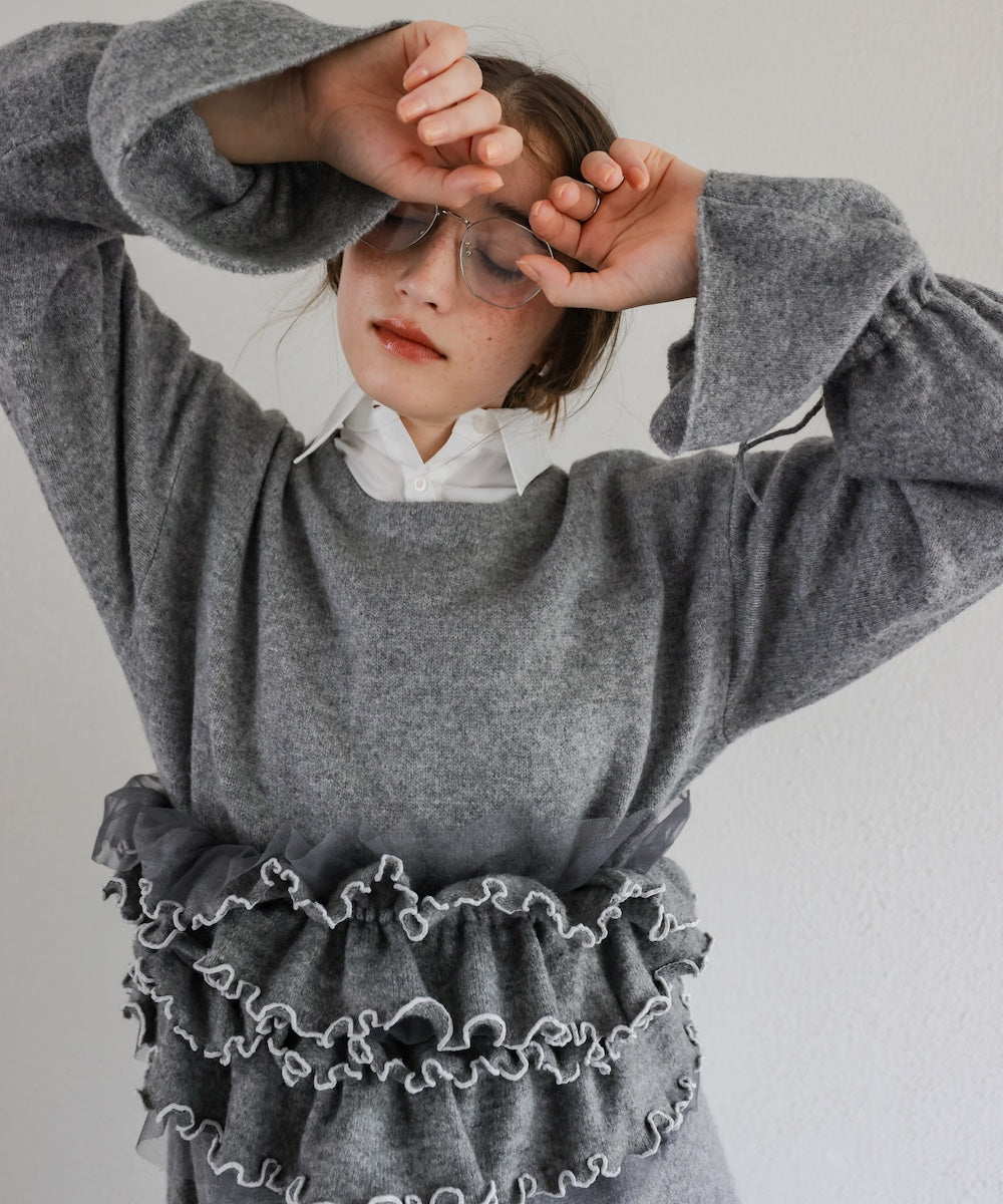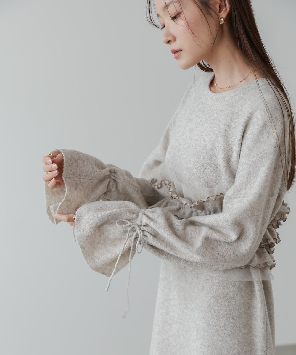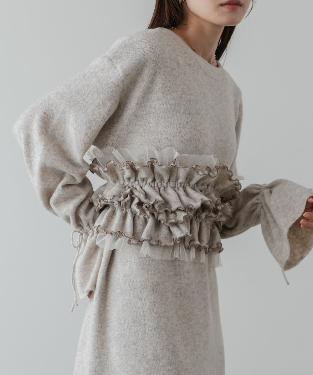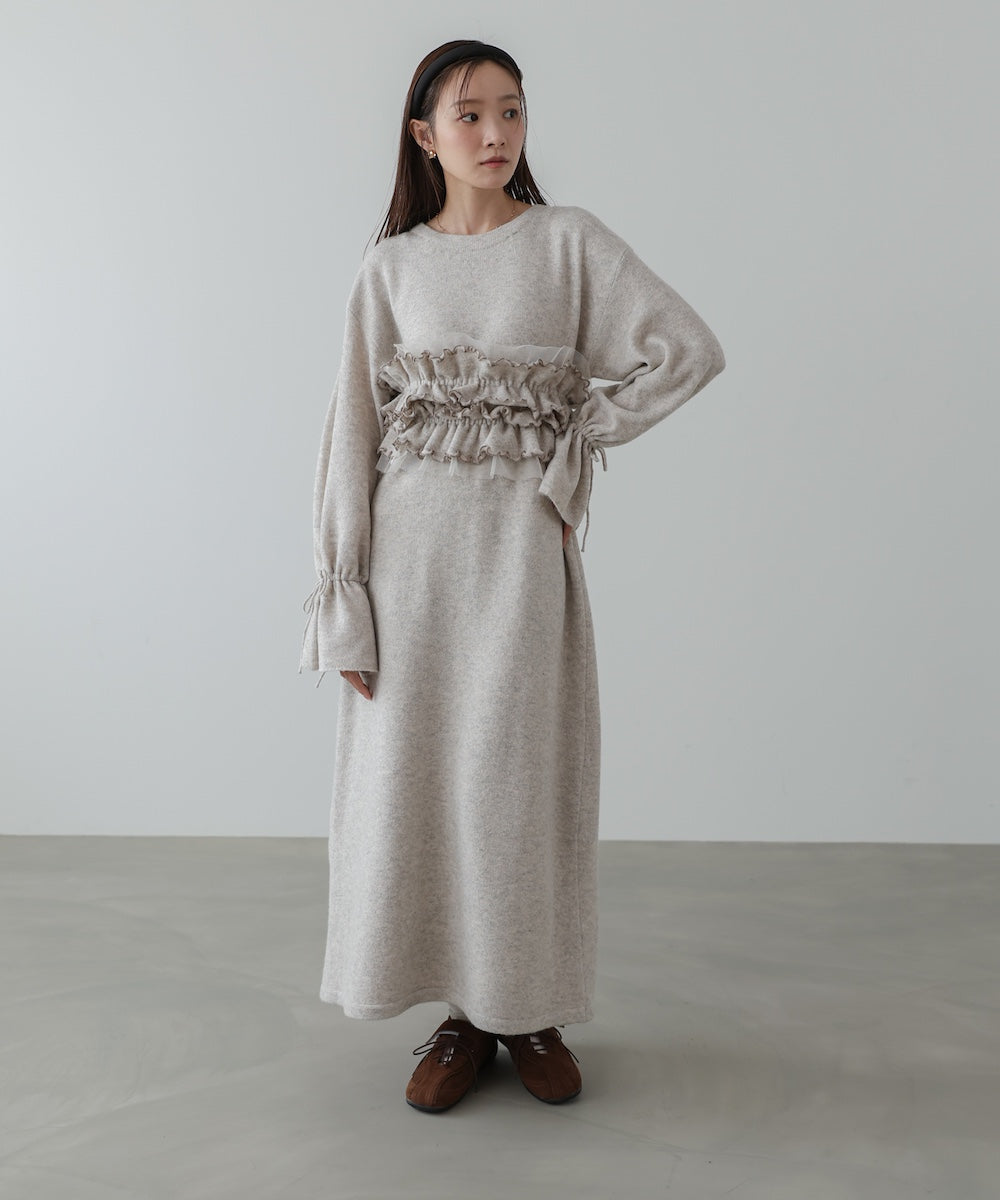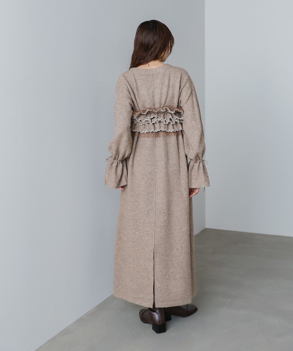 チュール×フリル×ニットの異素材ミックスが目を惹く、ビスチェセットニットワンピース。柔らかなニット素材のワンピースに、フリルデザインのビスチェを重ねたようなセットデザインで、1枚で旬のレイヤードスタイルが完成します。ビスチェはキャミタイプではなく、肩まわりをすっきり見せるフリル仕様。フリルにチュールが重なり、やわらかな華やかさを演出します。袖口にはリボンがあしらわれ、キュッと結ぶことでふんわりと広がるシルエットに。モカ・ベージュ・チャコールの落ち着いたトーンで、可愛らしさの中にも大人の上品さを感じさせる着映えワンピです。