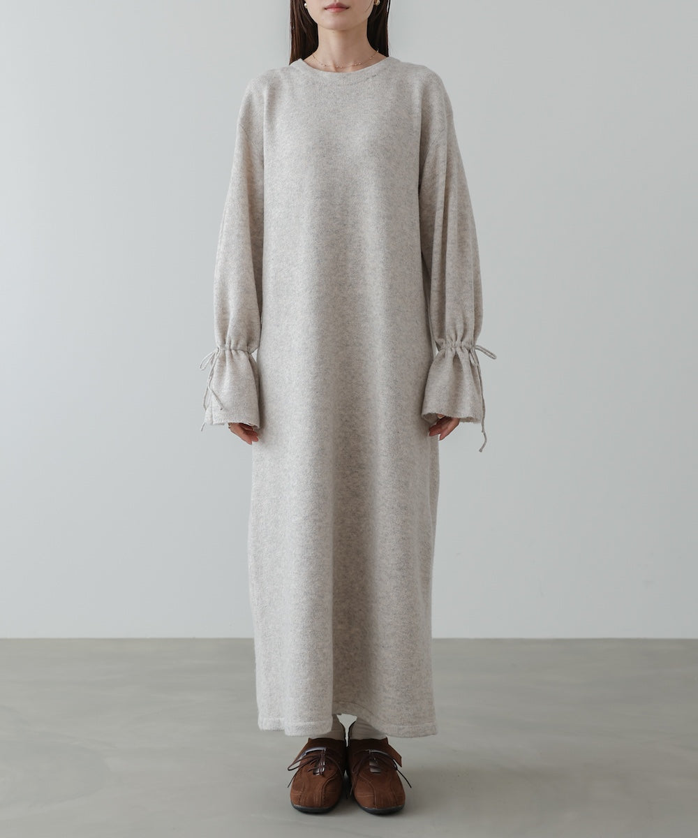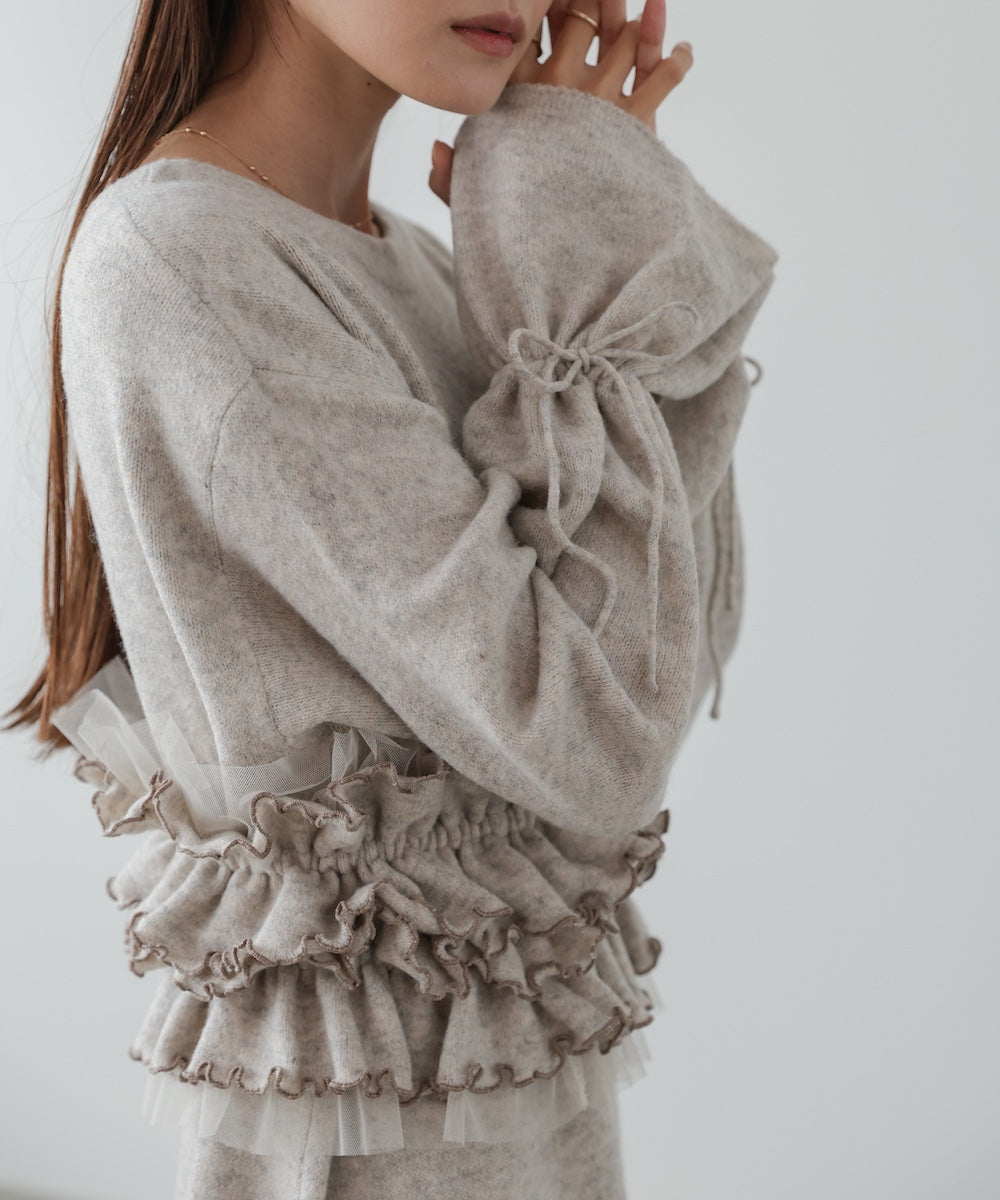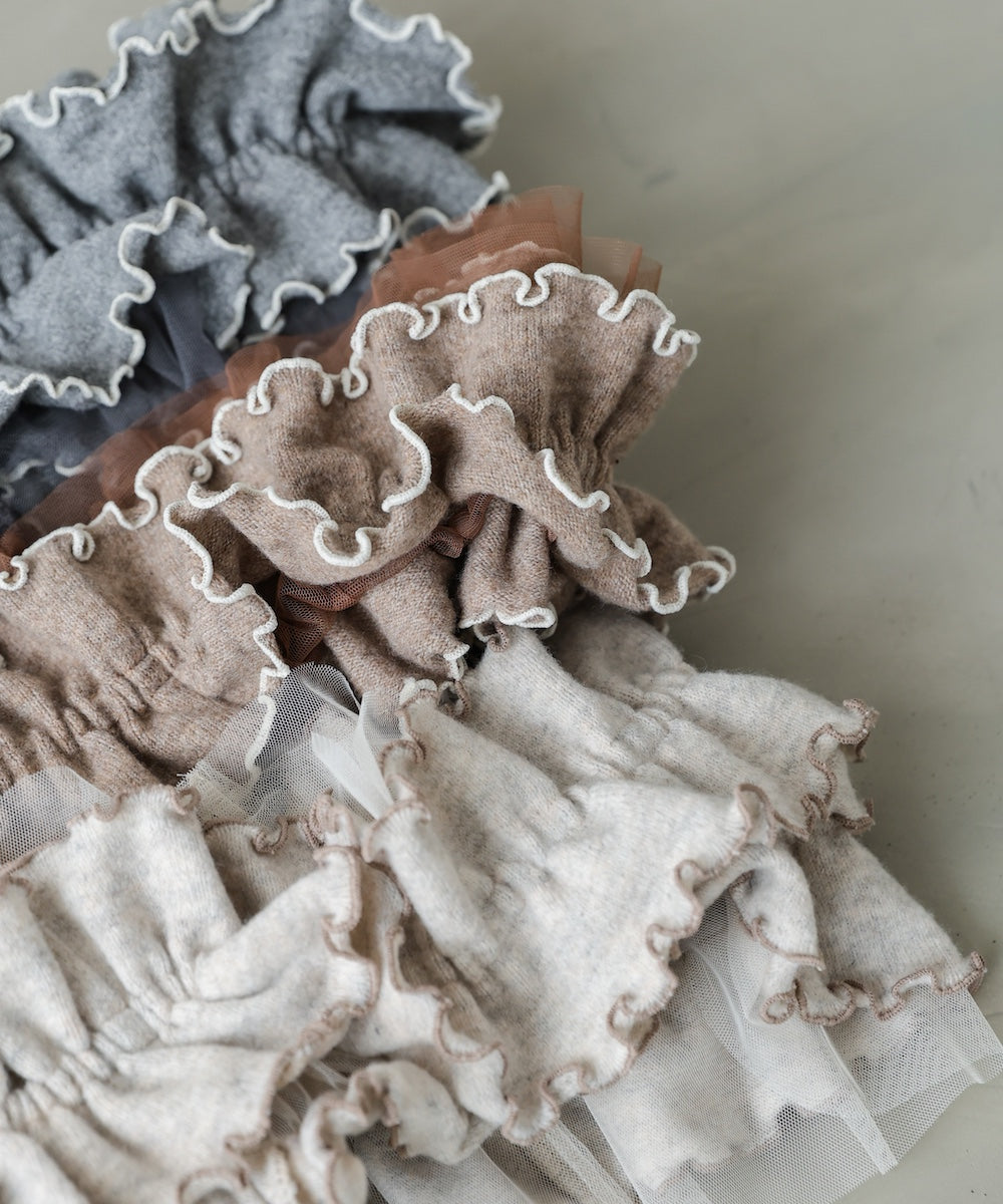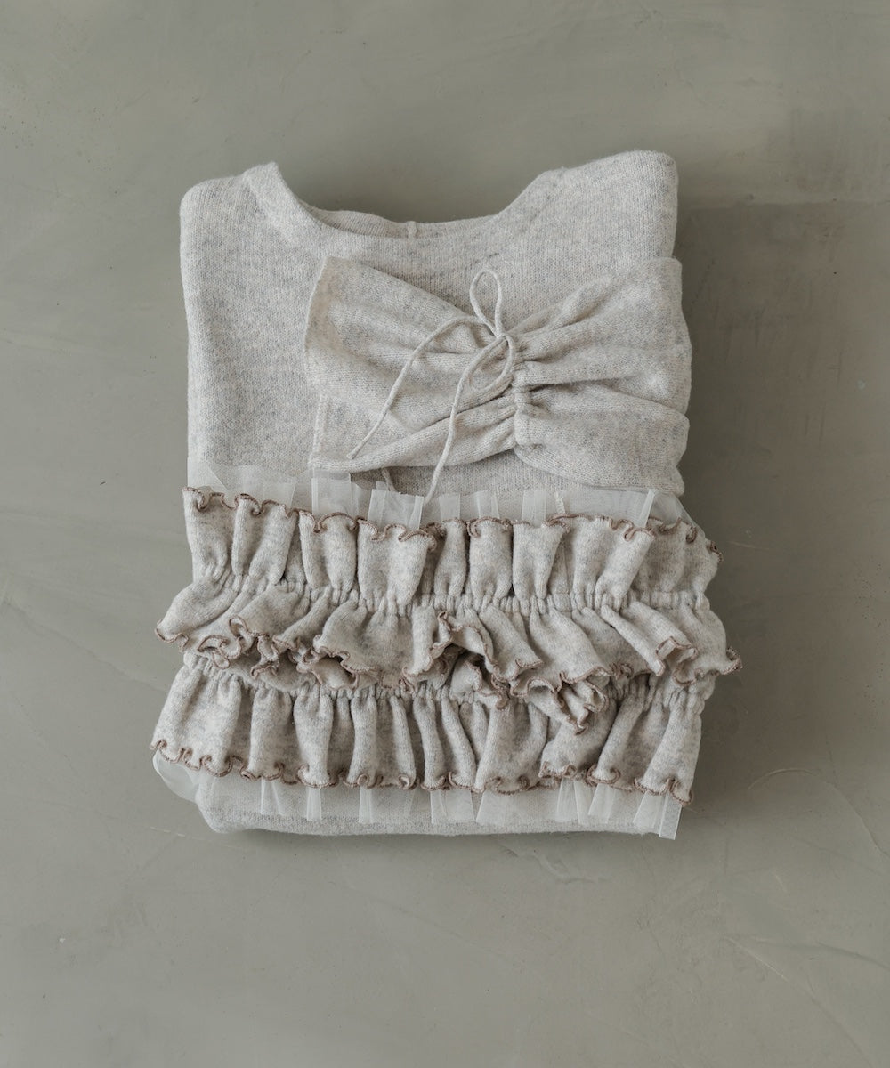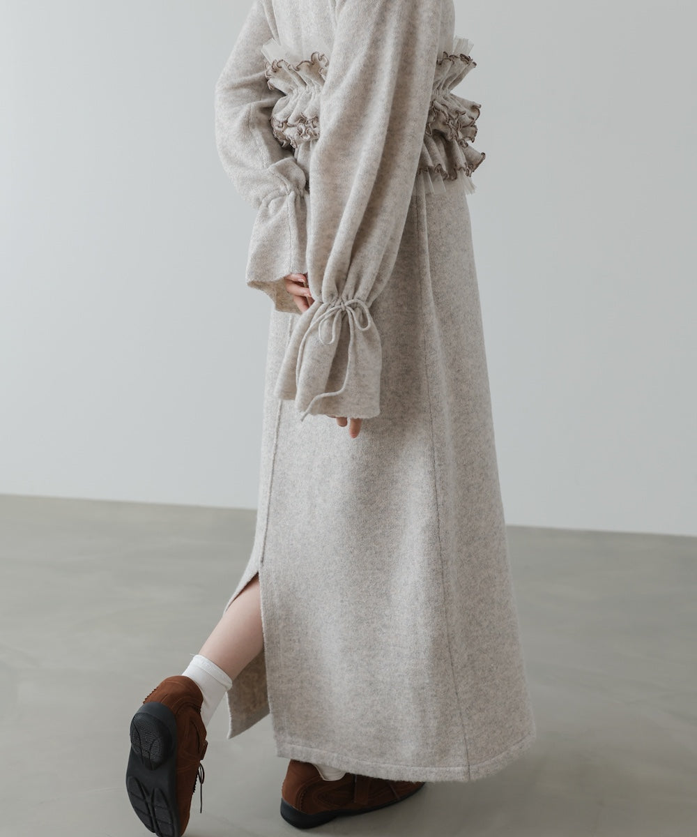 チュール×フリル×ニットの異素材ミックスが目を惹く、ビスチェセットニットワンピース。柔らかなニット素材のワンピースに、フリルデザインのビスチェを重ねたようなセットデザインで、1枚で旬のレイヤードスタイルが完成します。ビスチェはキャミタイプではなく、肩まわりをすっきり見せるフリル仕様。フリルにチュールが重なり、やわらかな華やかさを演出します。袖口にはリボンがあしらわれ、キュッと結ぶことでふんわりと広がるシルエットに。モカ・ベージュ・チャコールの落ち着いたトーンで、可愛らしさの中にも大人の上品さを感じさせる着映えワンピです。