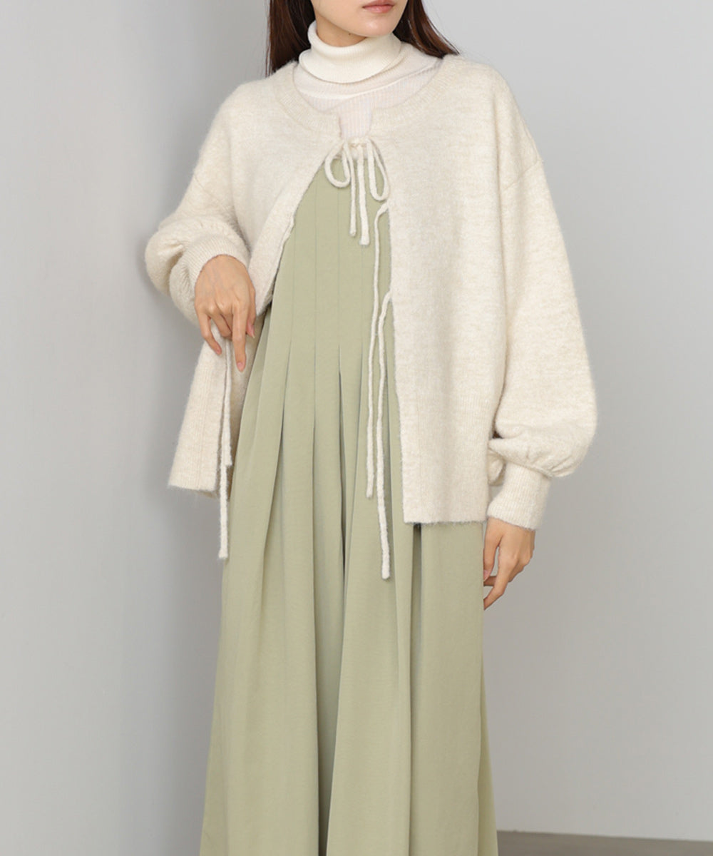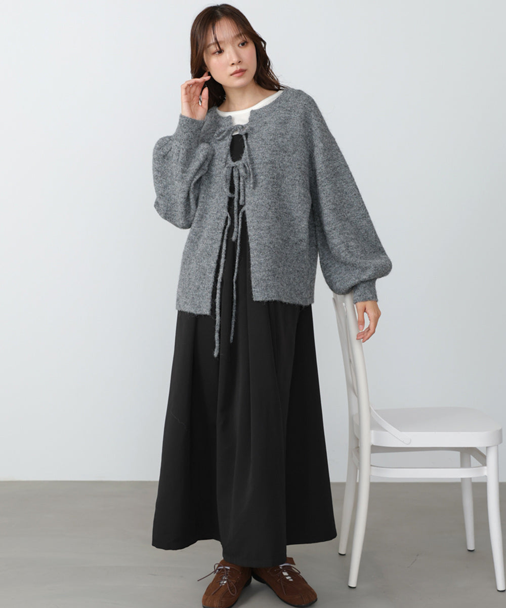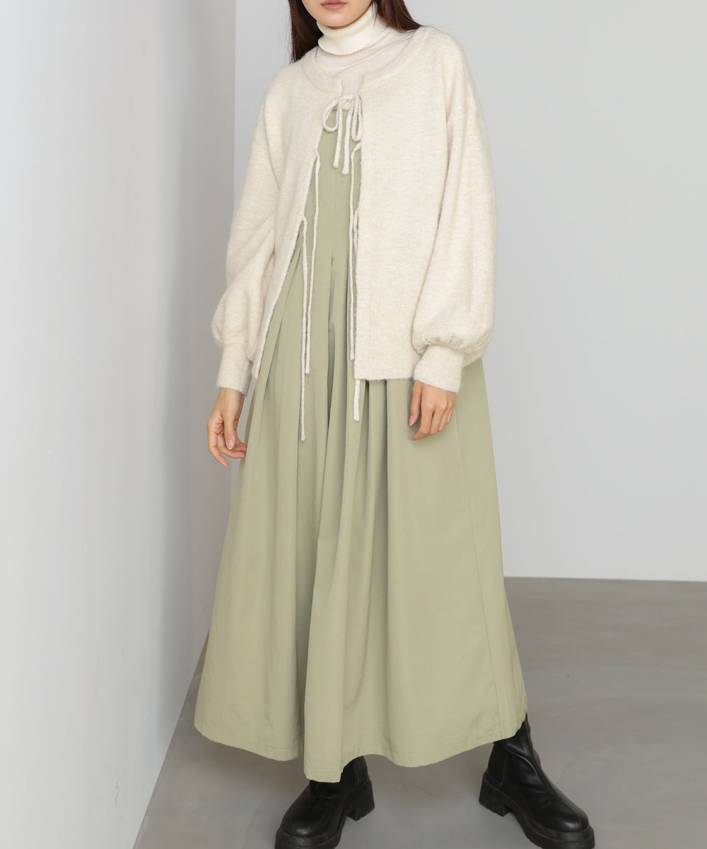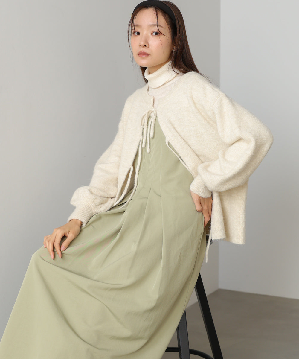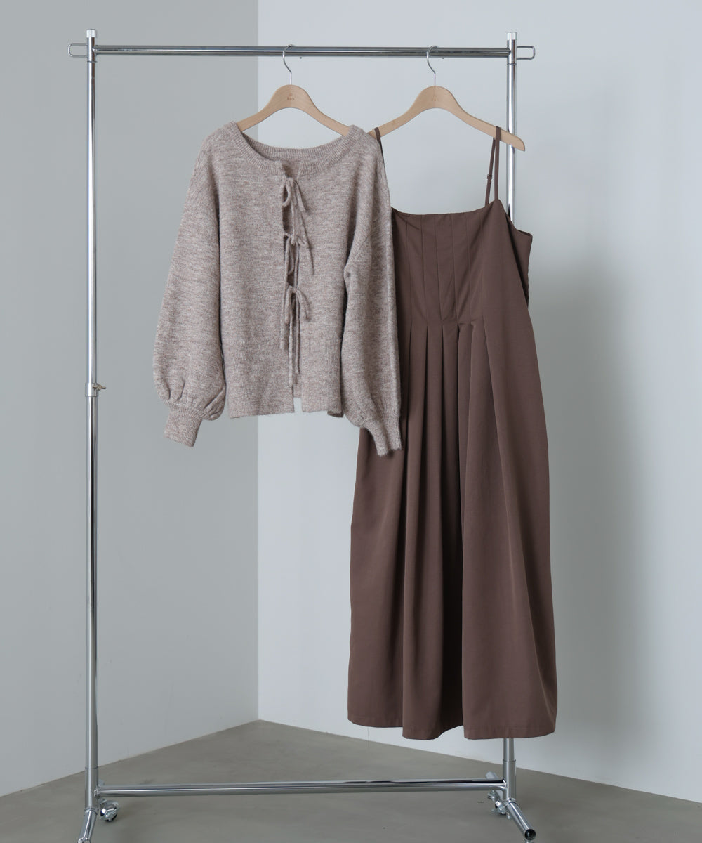 ニットトップスとキャミワンピがセットアイテムで登場しました!ニットトップスはトレンドのリボンがついていてカーディガンにもなる万能アイテムです。キャミワンピースはフレアタイプでしっかりと落ち感がありながらもきれいに広がるシルエットになっています。セットアイテムですが別々でもお使いいただけます♪