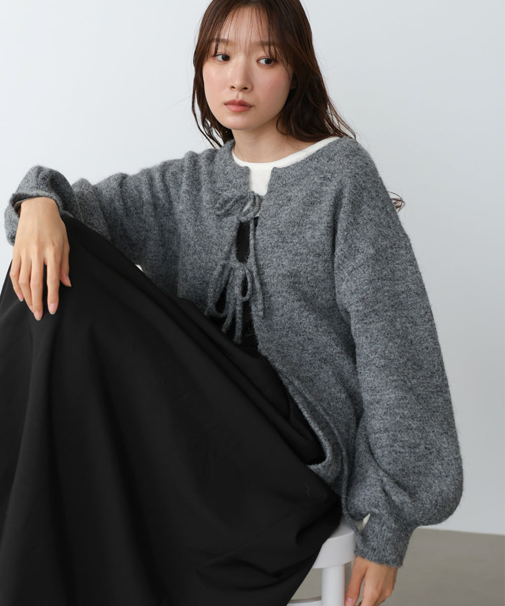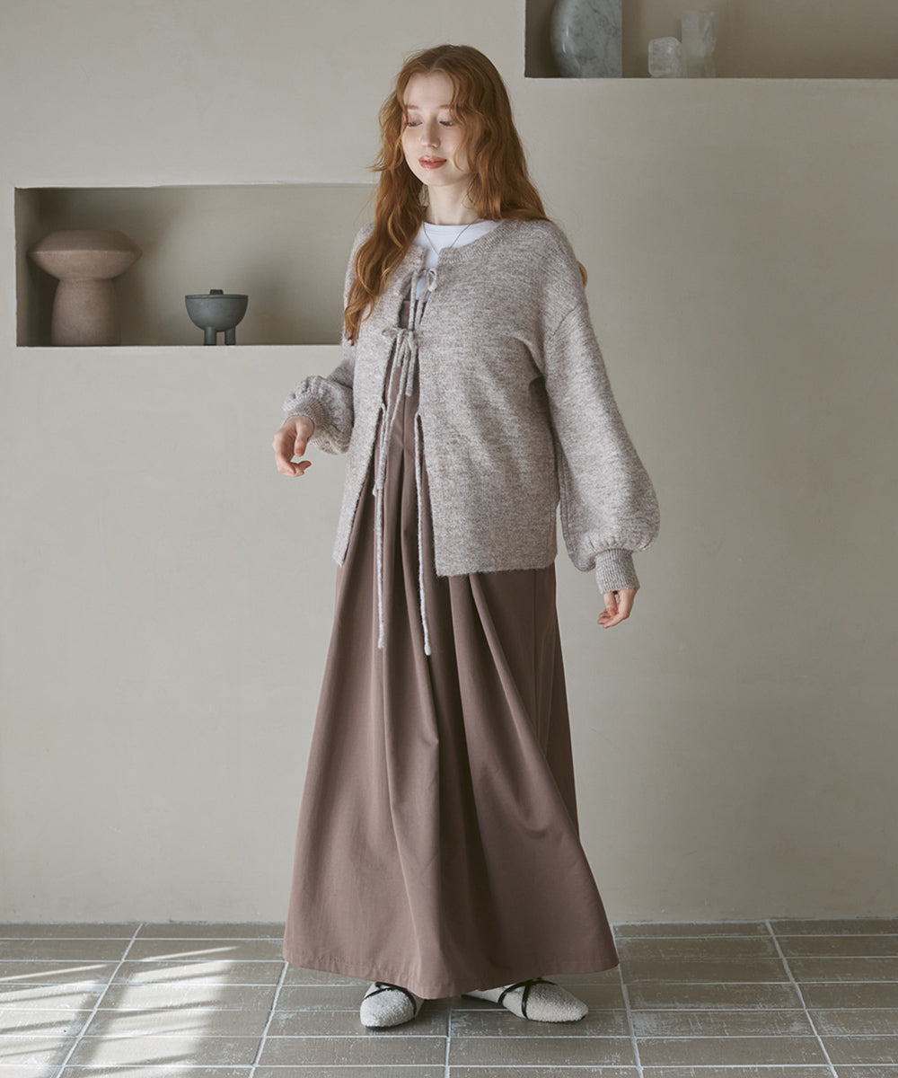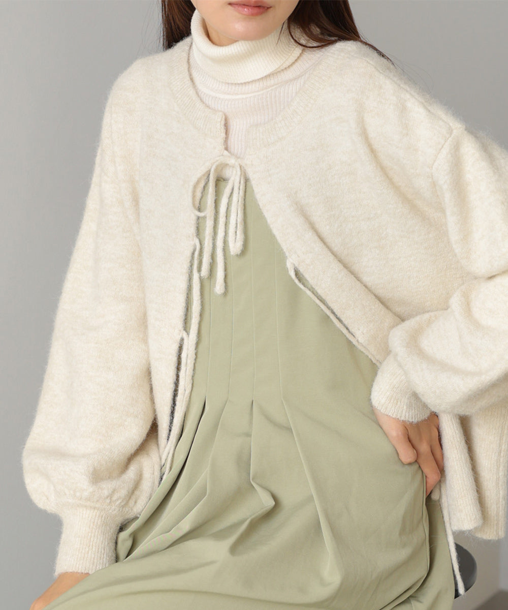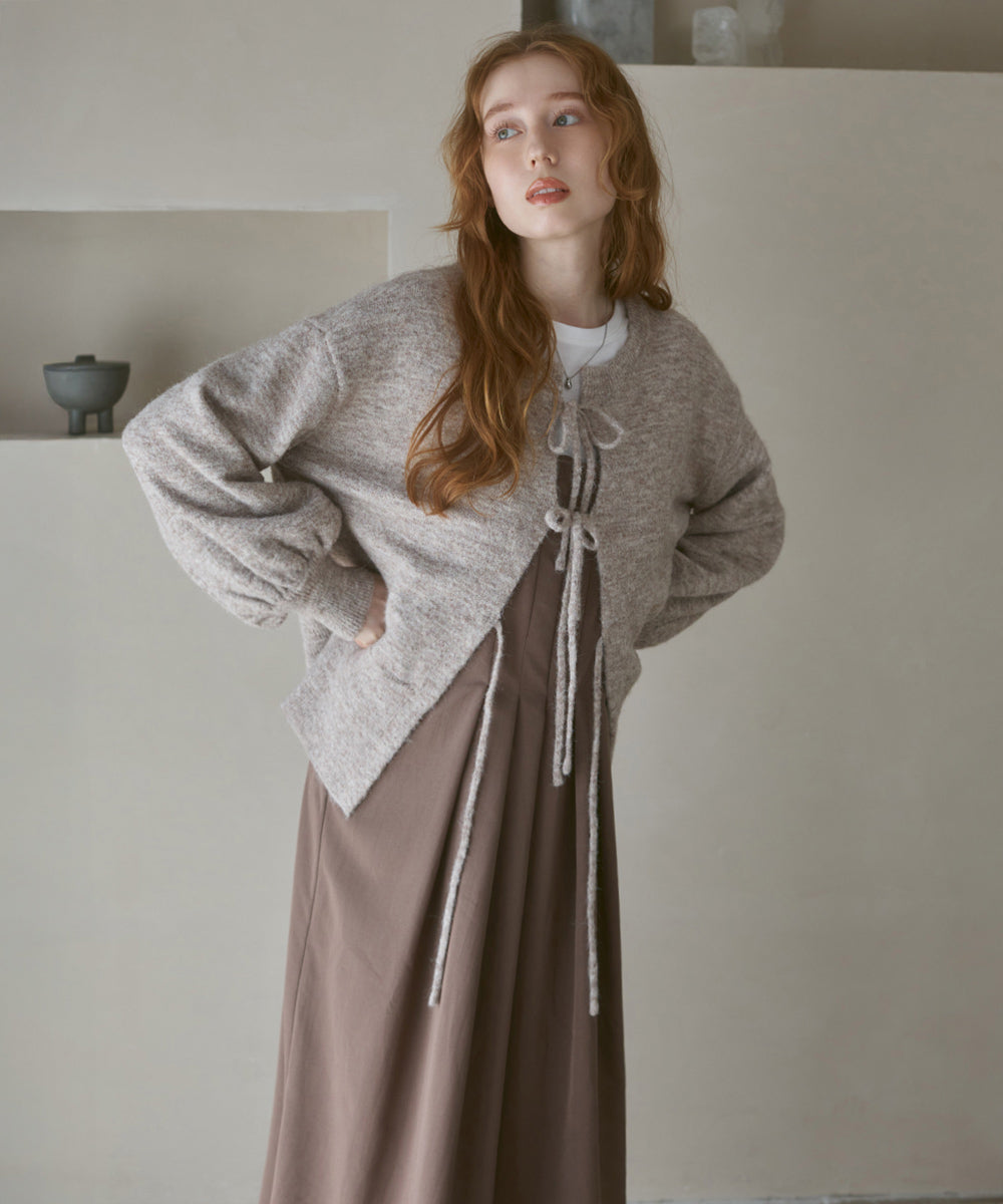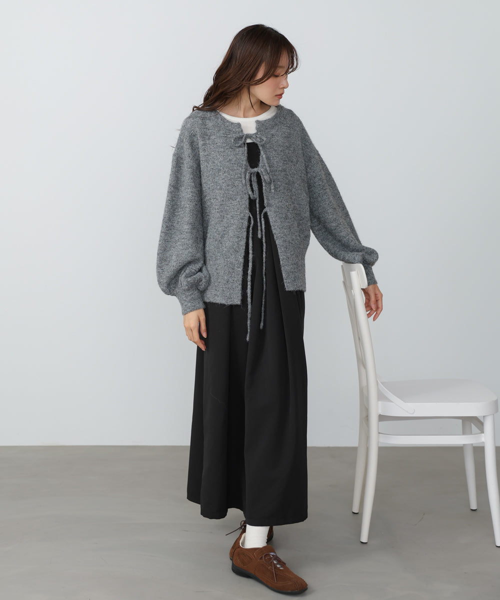 ニットトップスとキャミワンピがセットアイテムで登場しました!ニットトップスはトレンドのリボンがついていてカーディガンにもなる万能アイテムです。キャミワンピースはフレアタイプでしっかりと落ち感がありながらもきれいに広がるシルエットになっています。セットアイテムですが別々でもお使いいただけます♪