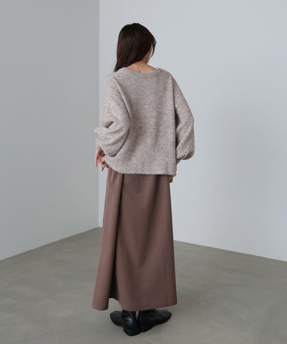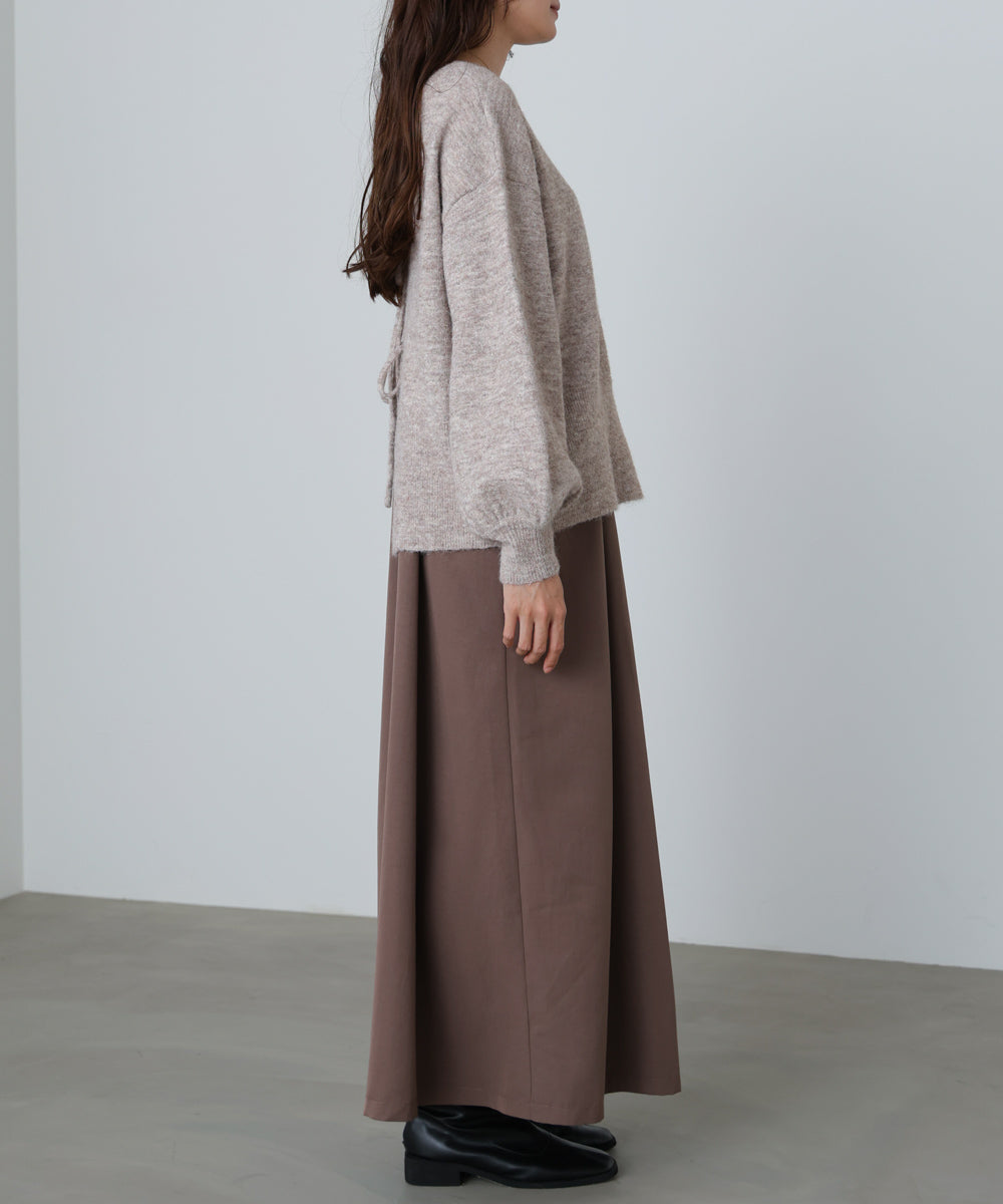 Lサイズを着用しました。しっかりと足首まで丈があったので高身長の方でも丈を気にせず着ていただけます!ニットトップスと分けて使えるので、デニムと合わせて着たいです。