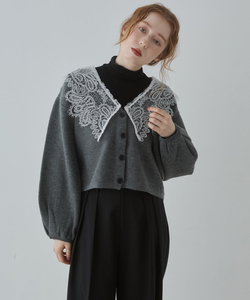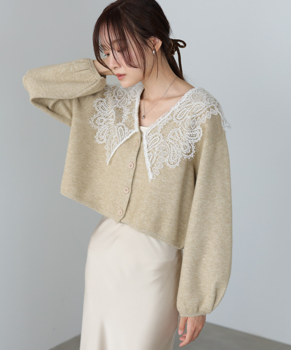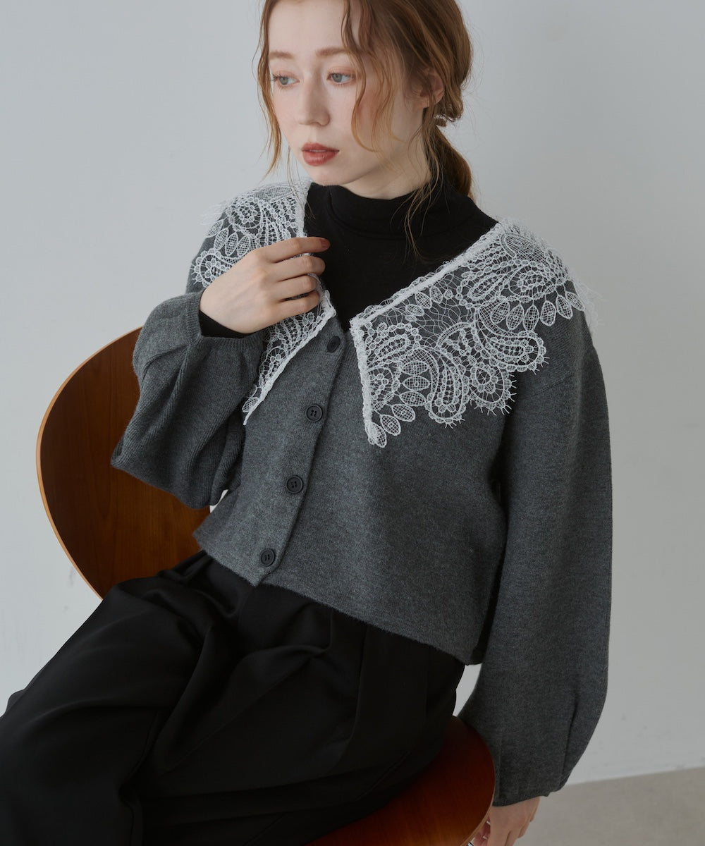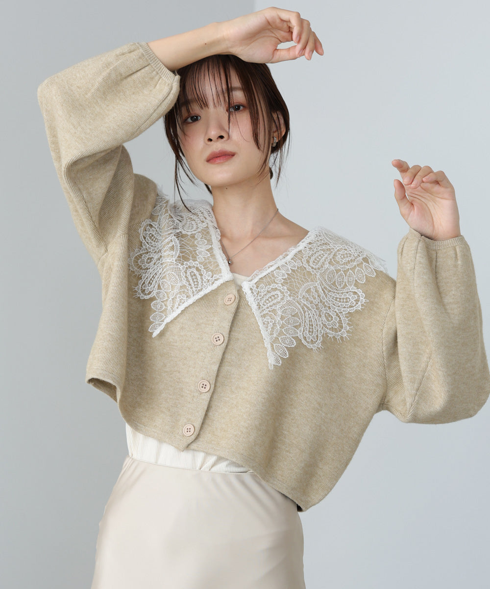 上品なレース衿が顔まわりを華やかに見せてくれるショートニットカーディガン。ふんわりとした質感のニットが秋冬らしいあたたかみを演出し、可愛らしさの中にも大人の余裕を感じる一枚です。クラシカルなボタンが全体を引き締め、甘くなりすぎない上品フェミニンな印象に。休日のお出かけやお仕事帰りのディナーにもぴったりのアイテムです。
