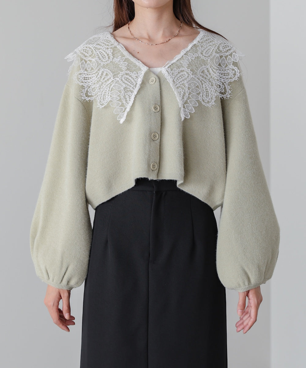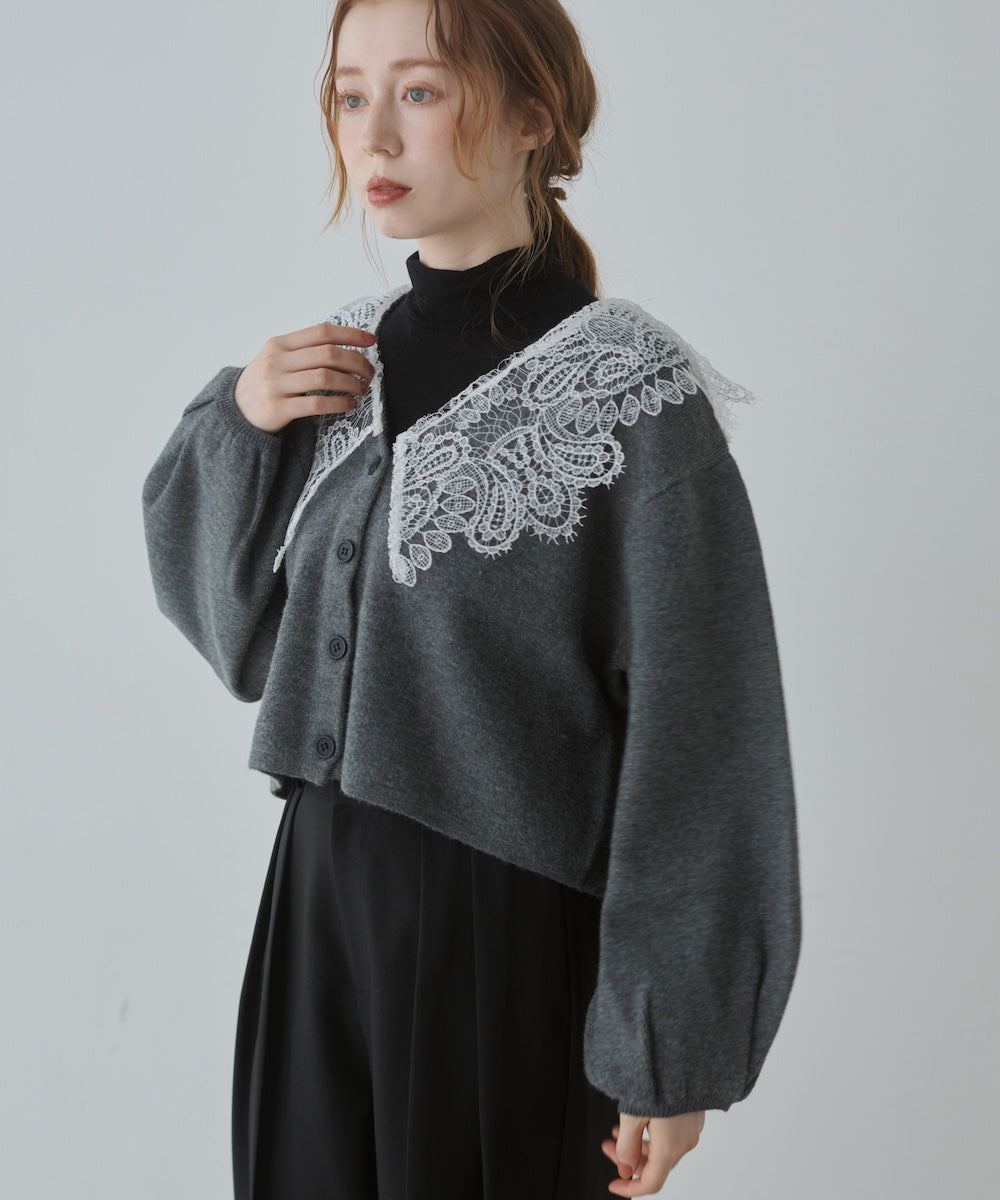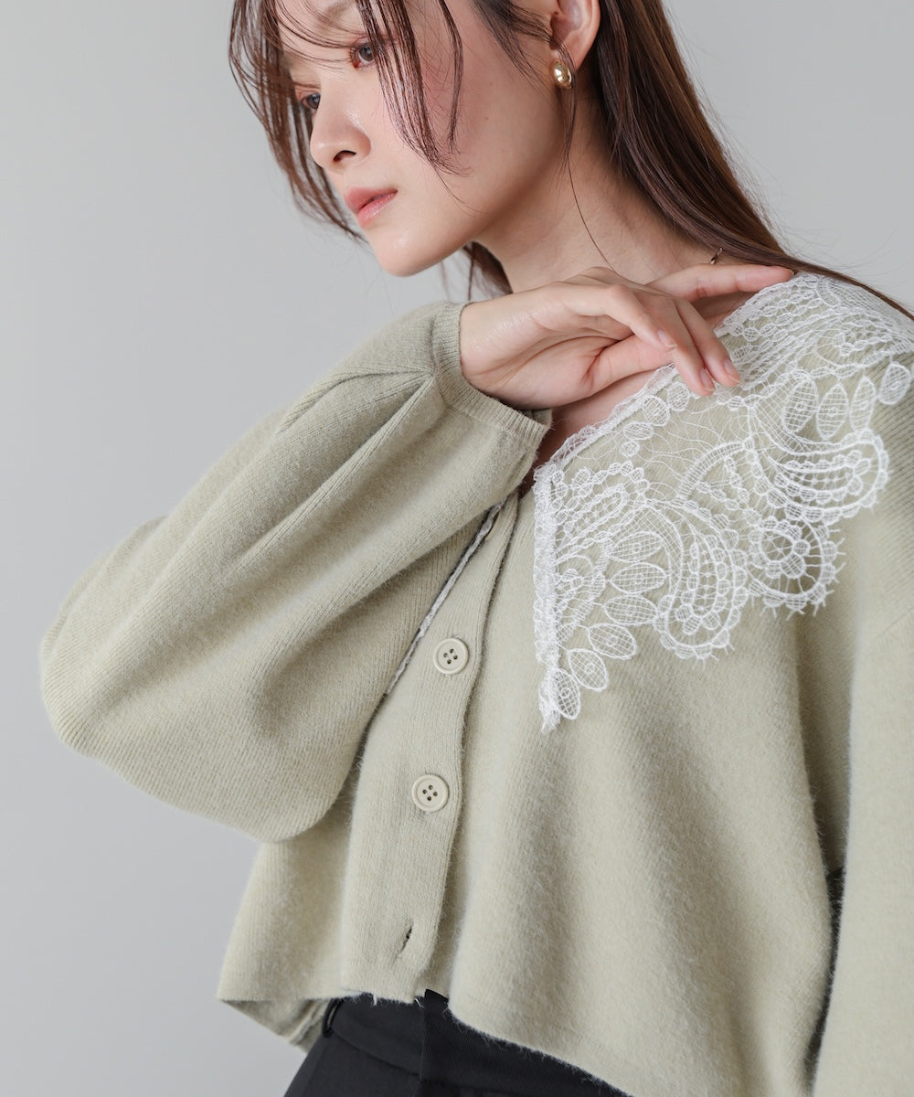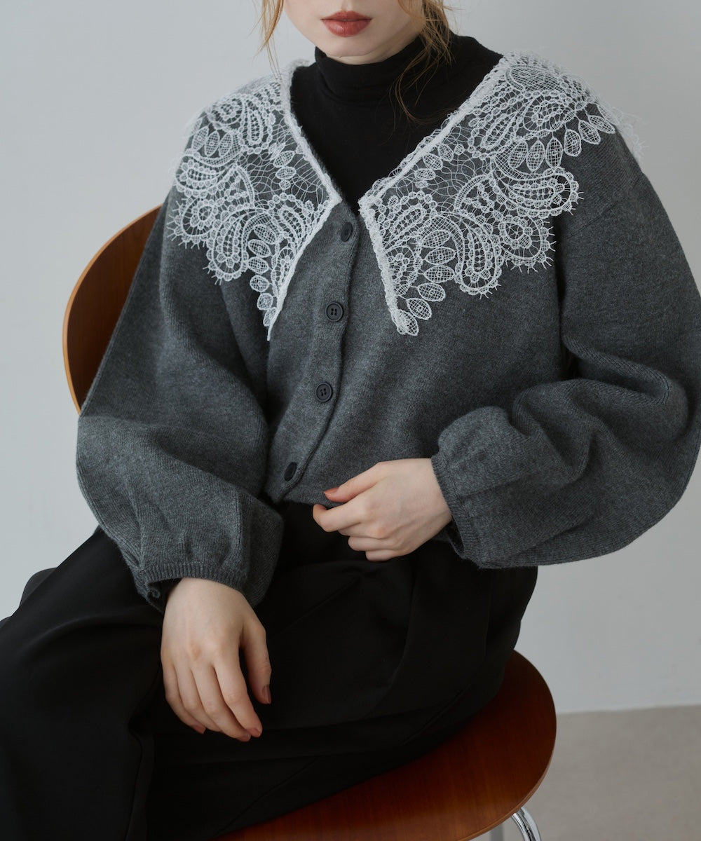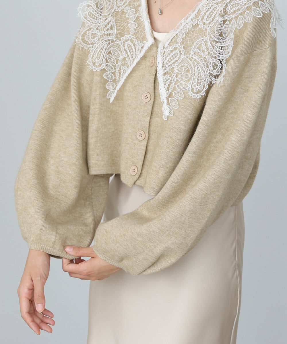 上品なレース衿が顔まわりを華やかに見せてくれるショートニットカーディガン。ふんわりとした質感のニットが秋冬らしいあたたかみを演出し、可愛らしさの中にも大人の余裕を感じる一枚です。クラシカルなボタンが全体を引き締め、甘くなりすぎない上品フェミニンな印象に。休日のお出かけやお仕事帰りのディナーにもぴったりのアイテムです。