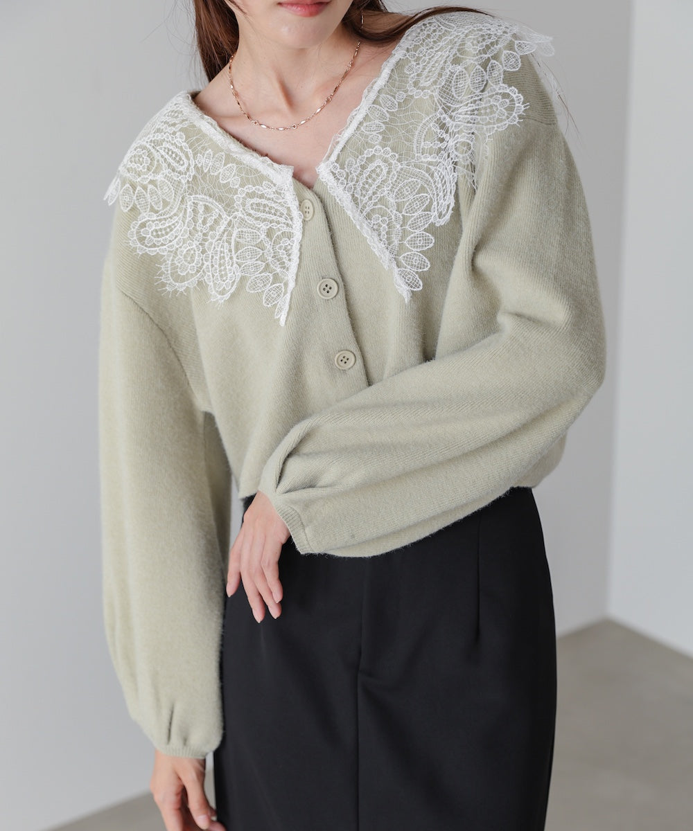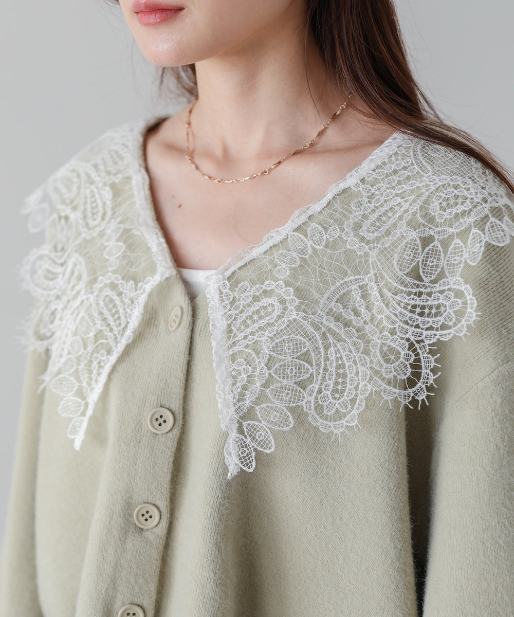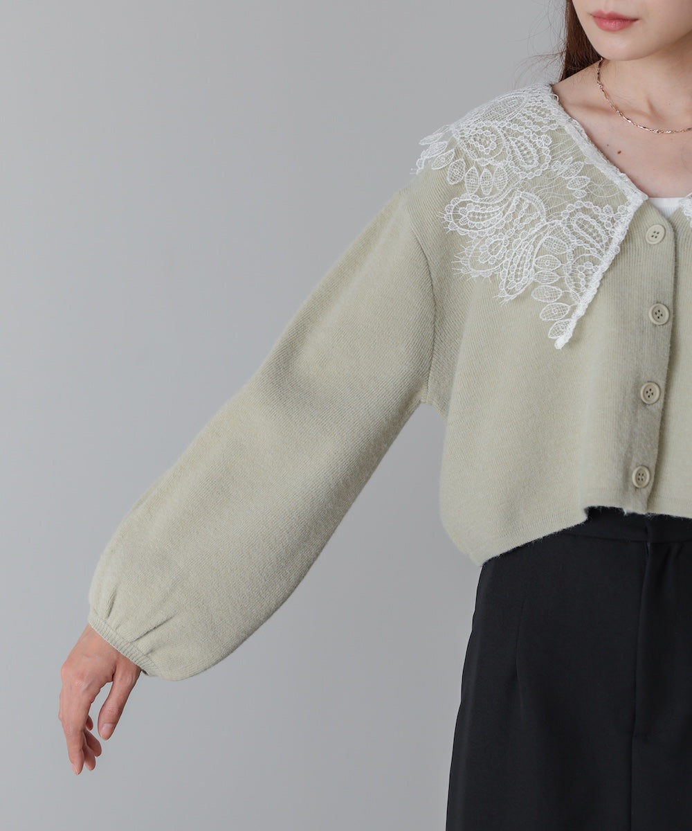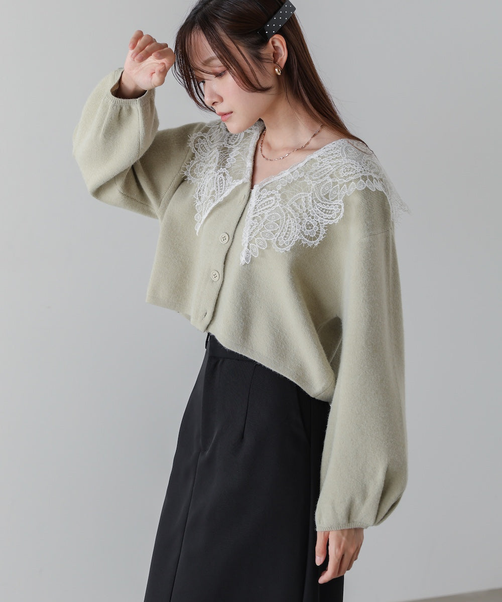上品なレース衿が顔まわりを華やかに見せてくれるショートニットカーディガン。ふんわりとした質感のニットが秋冬らしいあたたかみを演出し、可愛らしさの中にも大人の余裕を感じる一枚です。クラシカルなボタンが全体を引き締め、甘くなりすぎない上品フェミニンな印象に。休日のお出かけやお仕事帰りのディナーにもぴったりのアイテムです。