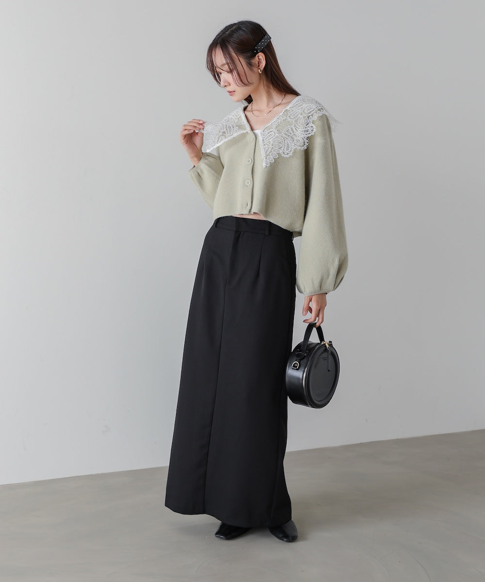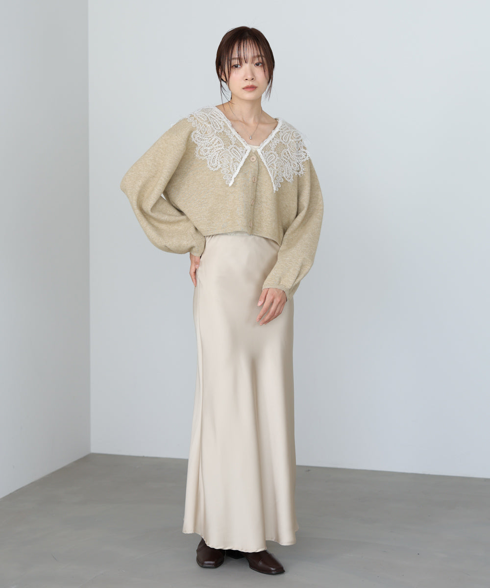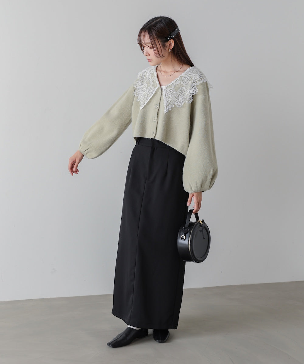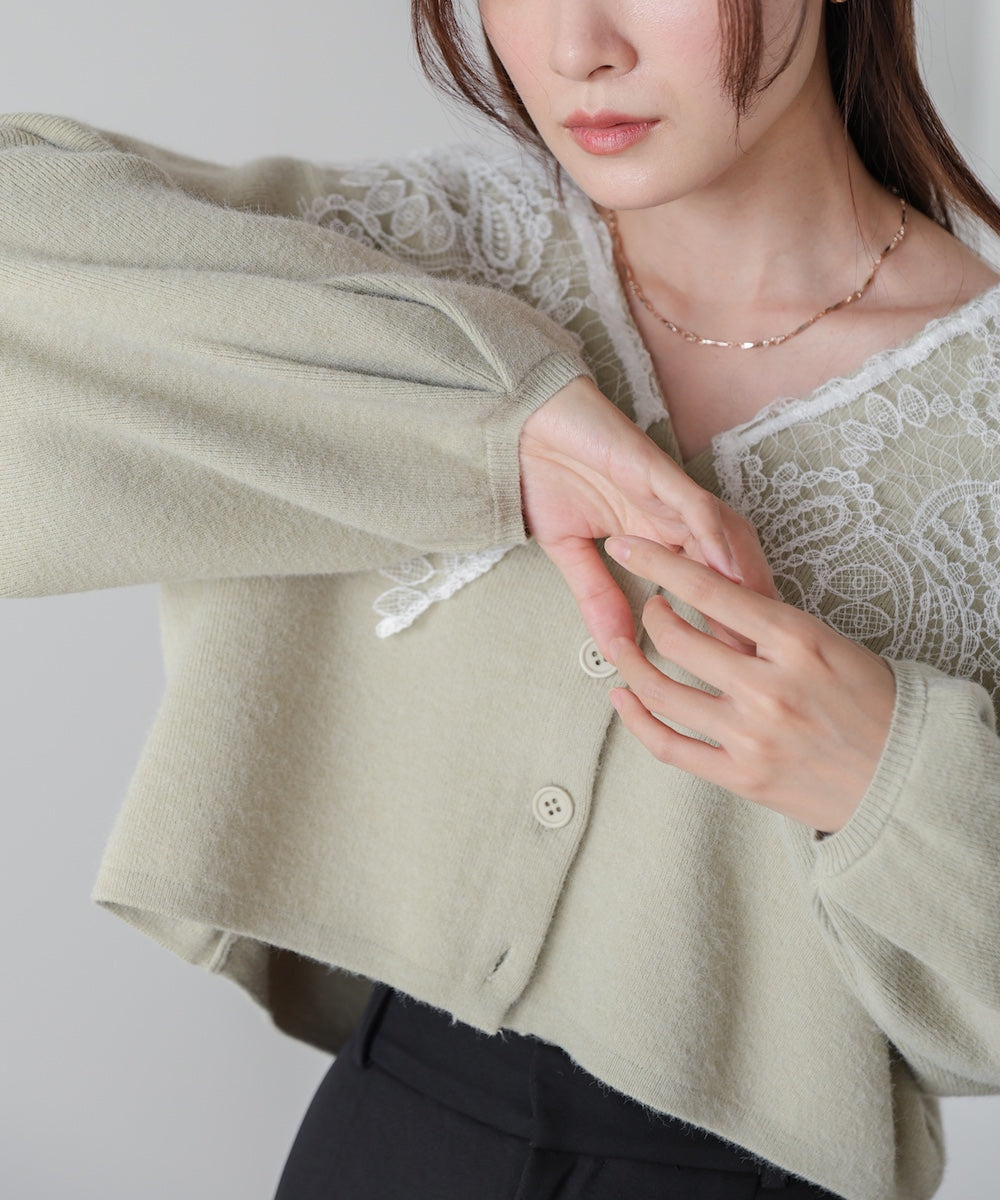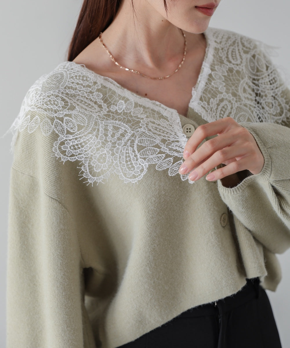 上品なレース衿が顔まわりを華やかに見せてくれるショートニットカーディガン。ふんわりとした質感のニットが秋冬らしいあたたかみを演出し、可愛らしさの中にも大人の余裕を感じる一枚です。クラシカルなボタンが全体を引き締め、甘くなりすぎない上品フェミニンな印象に。休日のお出かけやお仕事帰りのディナーにもぴったりのアイテムです。