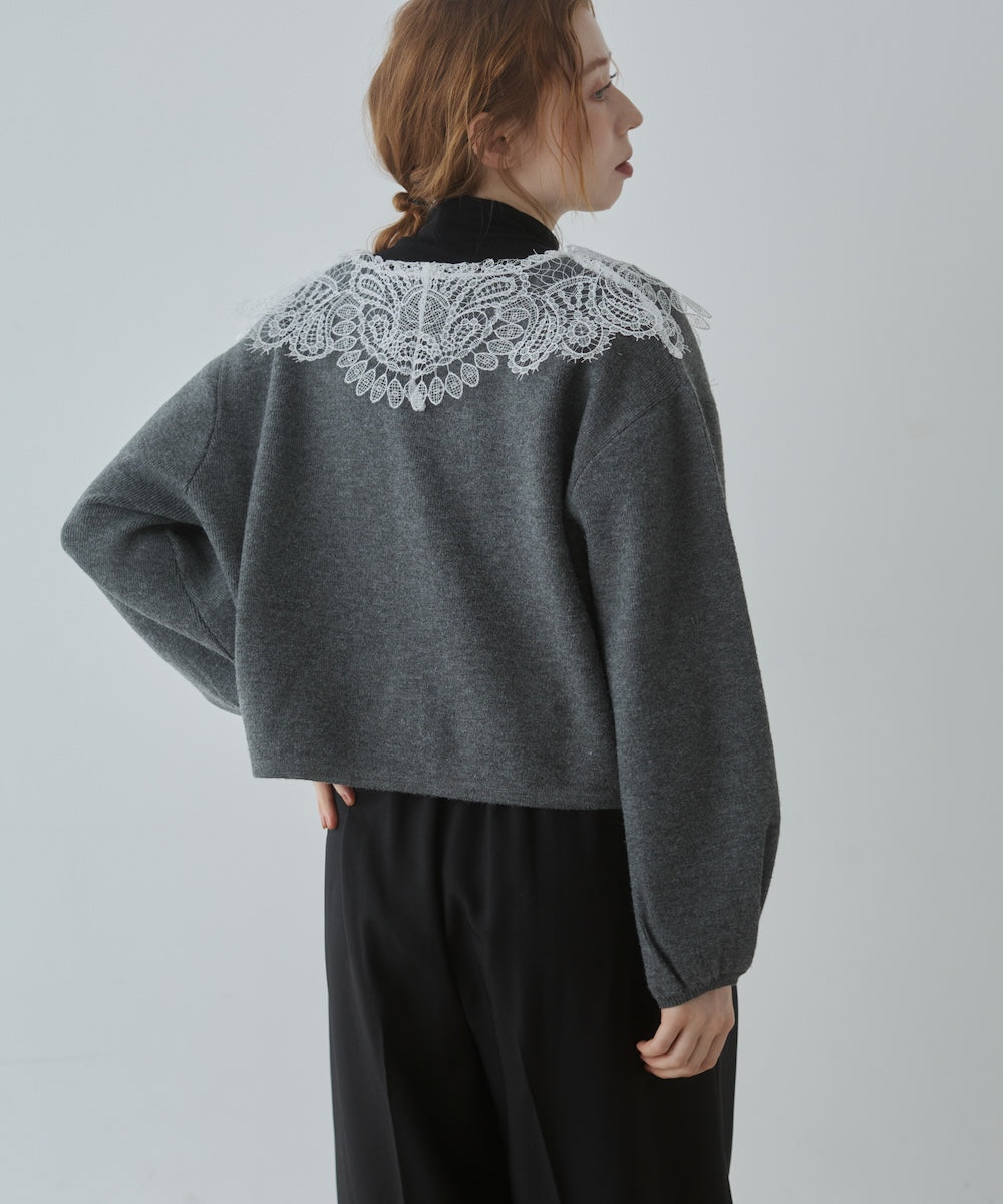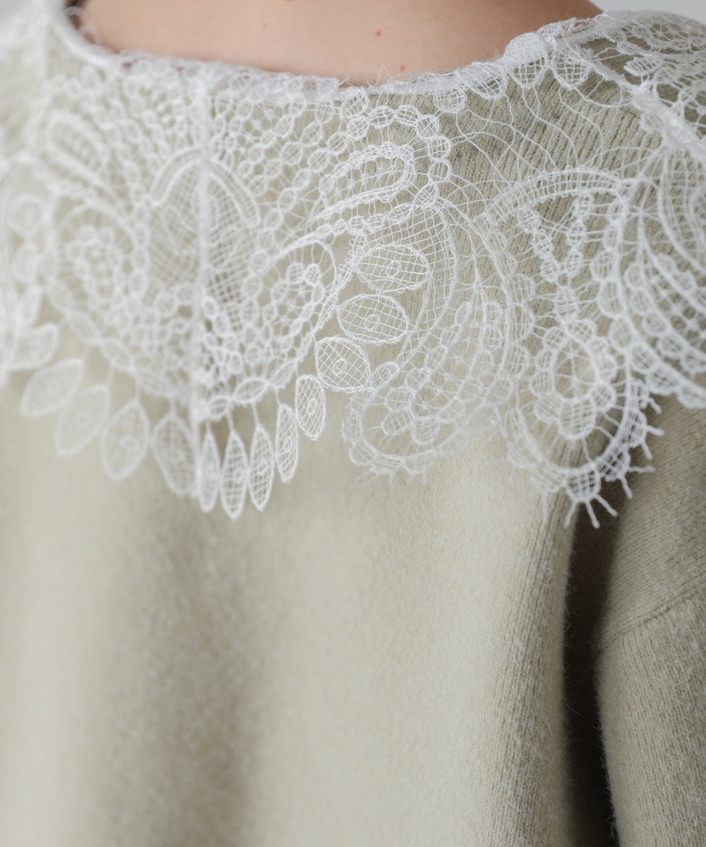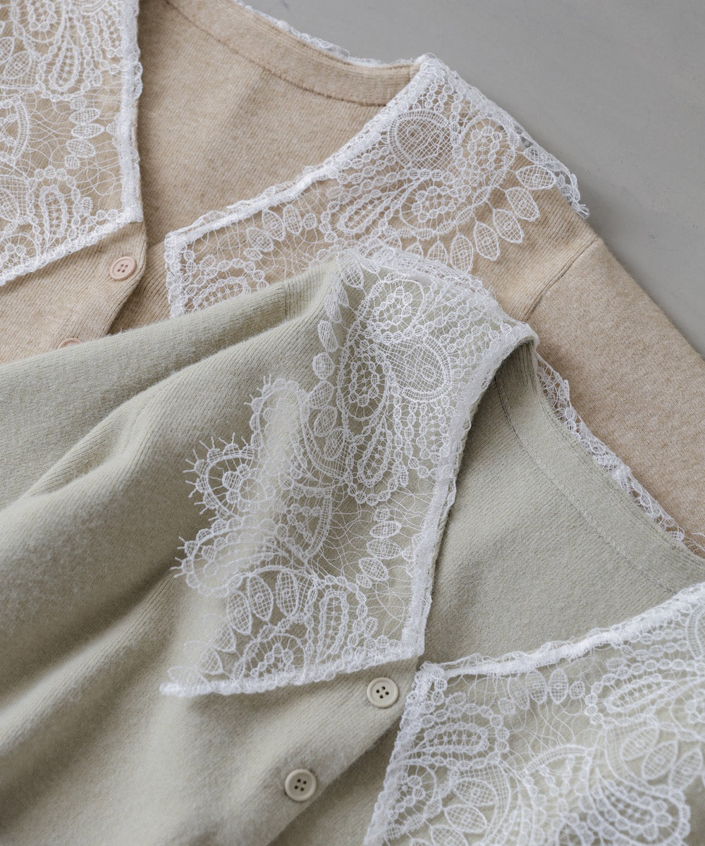 ニット部分はアクリル・ポリエステル・ナイロンをバランスよくブレンドした、軽やかで柔らかな風合い。ふっくらとした編み地が保温性を高め、秋冬シーズンも快適な着心地です。衿元のレースはポリエステル100%で繊細ながらもハリがあり、シルエットを美しくキープします。