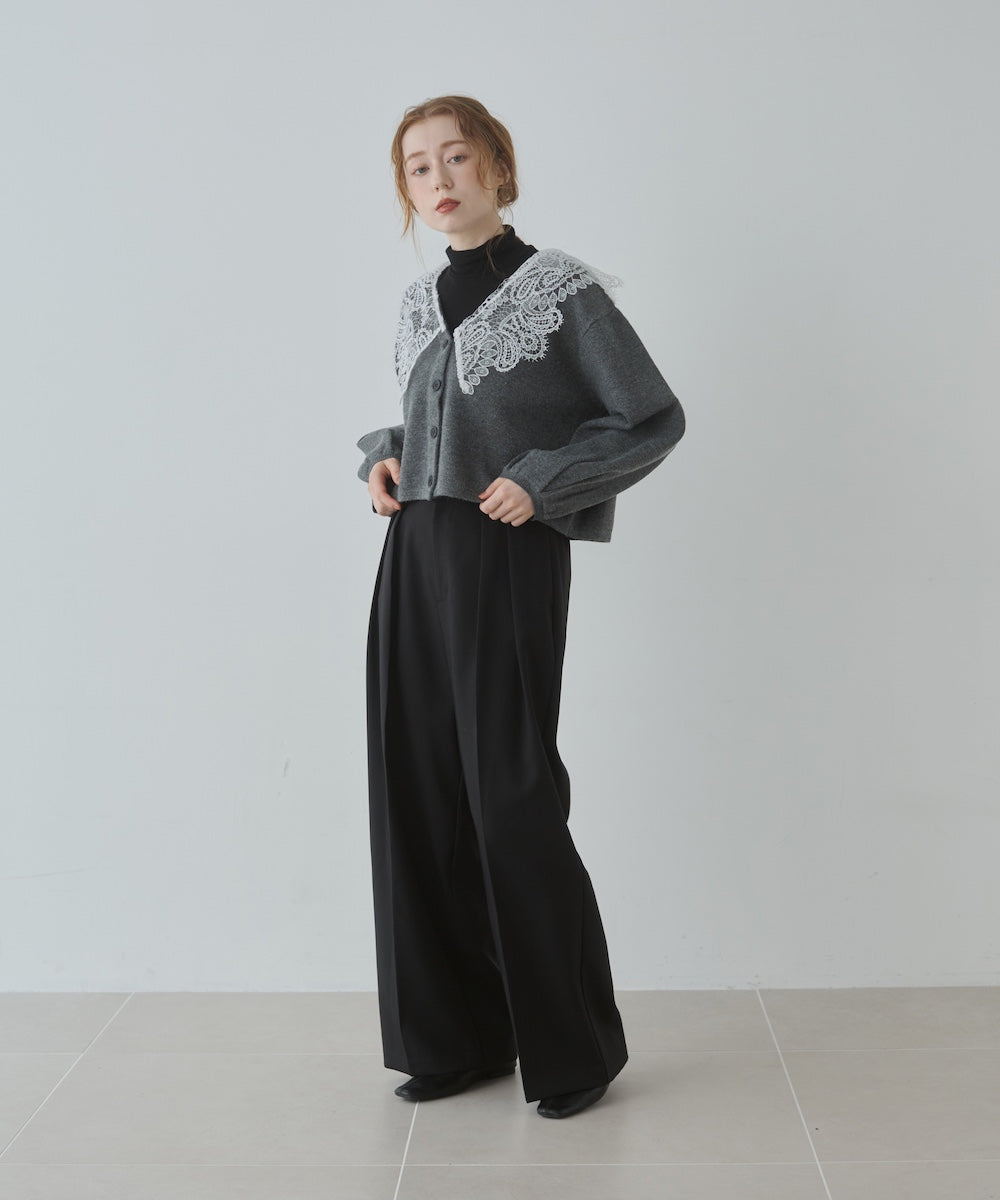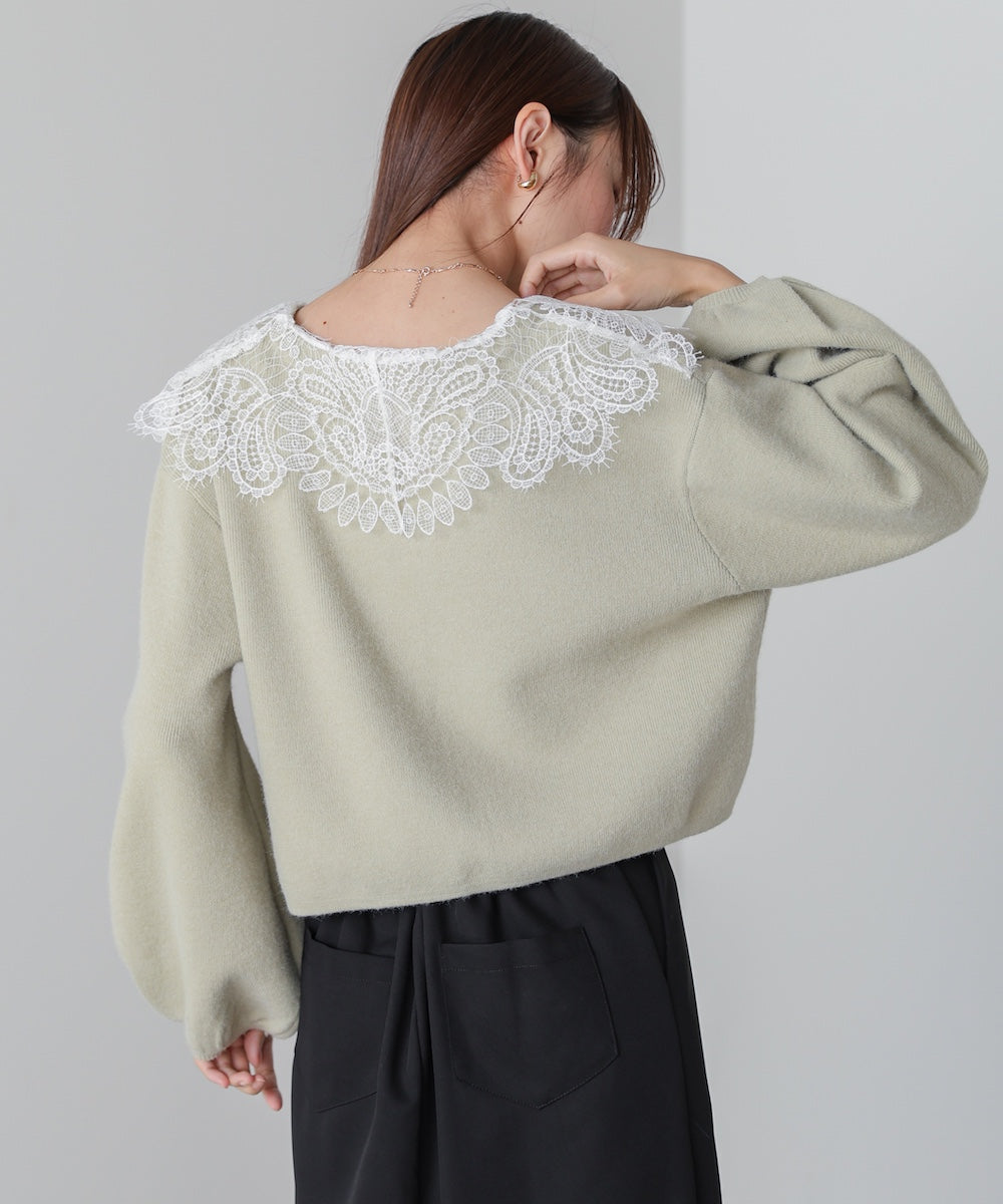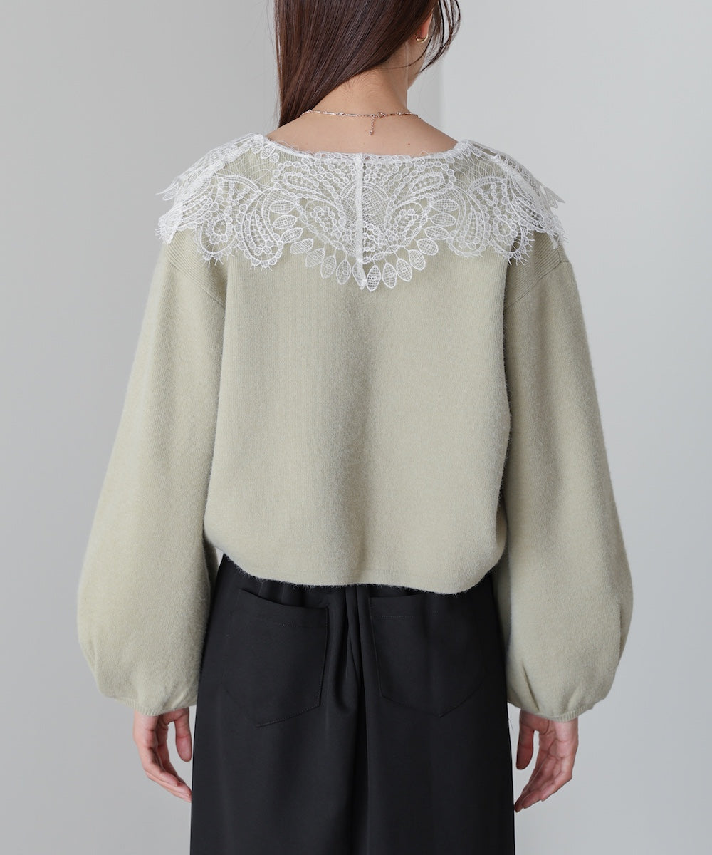 ニット部分はアクリル・ポリエステル・ナイロンをバランスよくブレンドした、軽やかで柔らかな風合い。ふっくらとした編み地が保温性を高め、秋冬シーズンも快適な着心地です。衿元のレースはポリエステル100%で繊細ながらもハリがあり、シルエットを美しくキープします。
