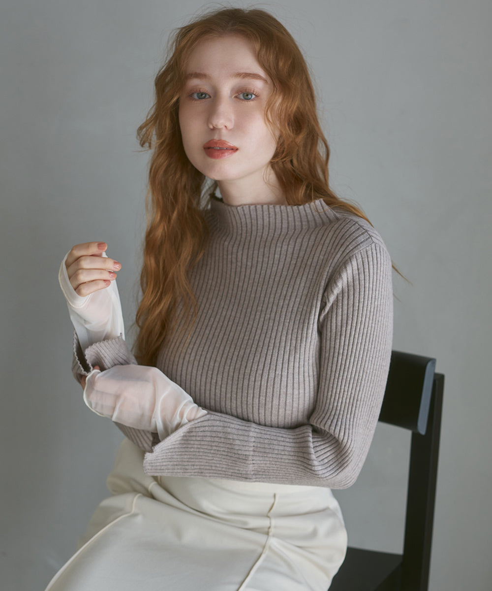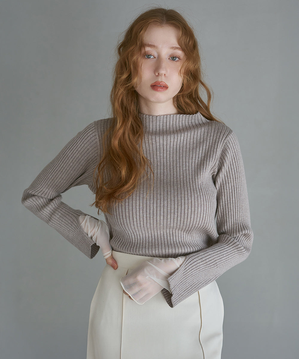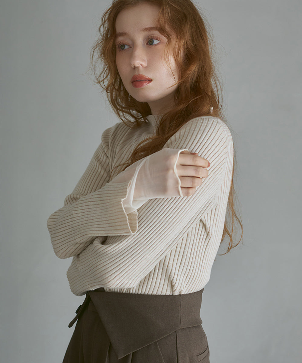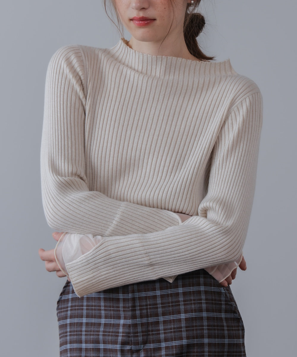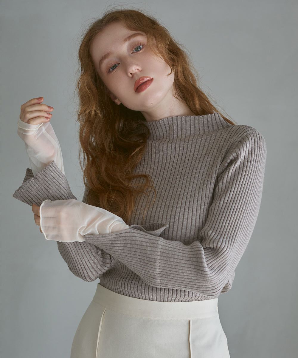 繊細なチュールを重ねた袖デザインが印象的なチュールレイヤードリブニット。リブ編みのすっきりとしたシルエットに、ふんわりと重なるチュールが女性らしい抜け感をプラス。首元はボートネックとハイネックの2種類から選べるので、シーンやスタイルに合わせて印象を変えられるのも魅力です。程よい厚みのあるニット素材にチュールを組み合わせ、華やかさと着心地の良さを両立。デイリーから特別なお出かけまで、幅広く活躍してくれる大人フェミニンな一枚です。