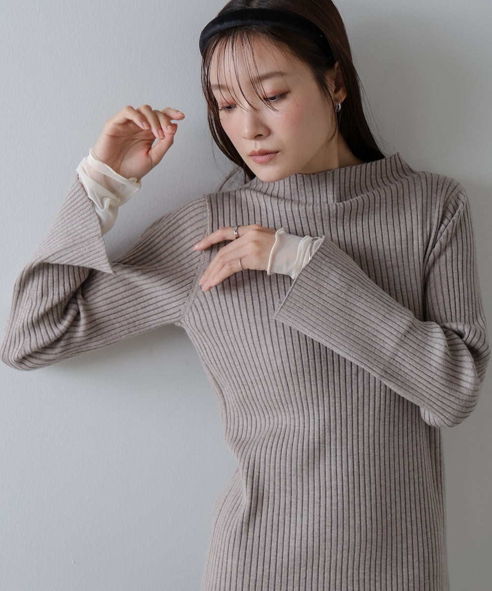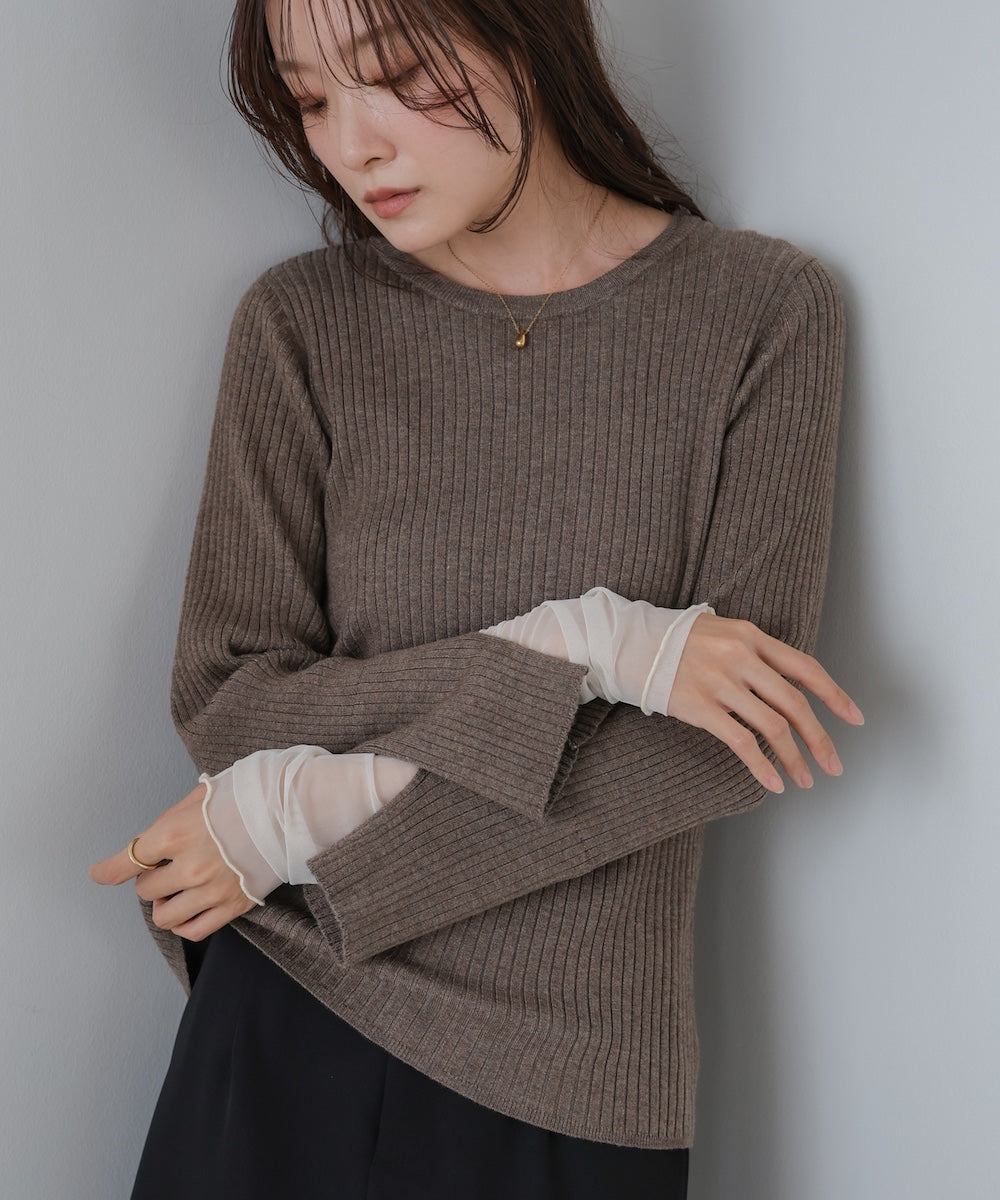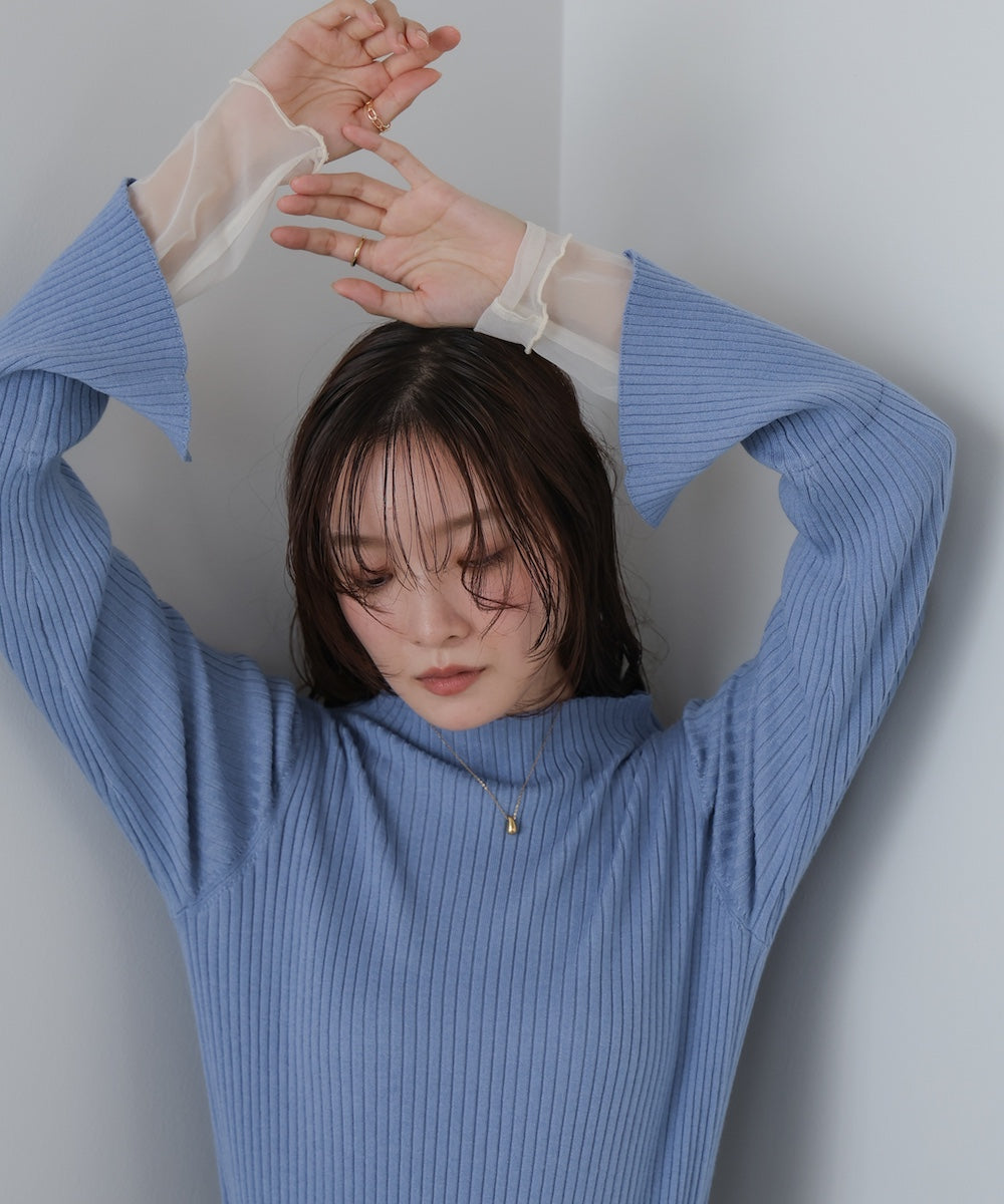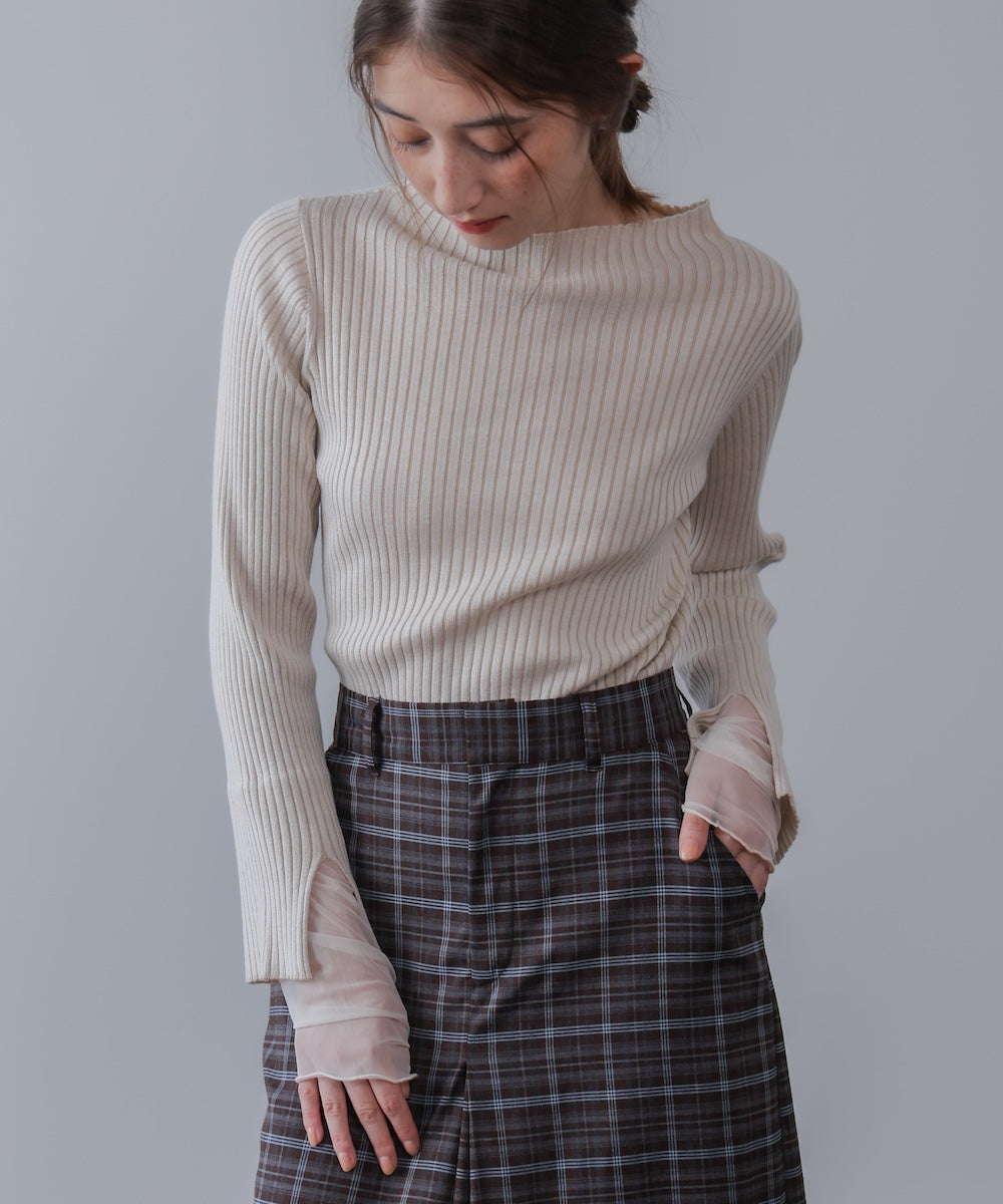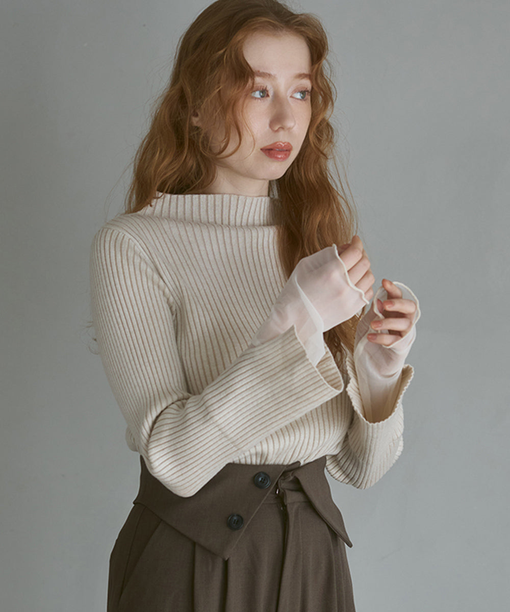 繊細なチュールを重ねた袖デザインが印象的なチュールレイヤードリブニット。リブ編みのすっきりとしたシルエットに、ふんわりと重なるチュールが女性らしい抜け感をプラス。首元はボートネックとハイネックの2種類から選べるので、シーンやスタイルに合わせて印象を変えられるのも魅力です。程よい厚みのあるニット素材にチュールを組み合わせ、華やかさと着心地の良さを両立。デイリーから特別なお出かけまで、幅広く活躍してくれる大人フェミニンな一枚です。