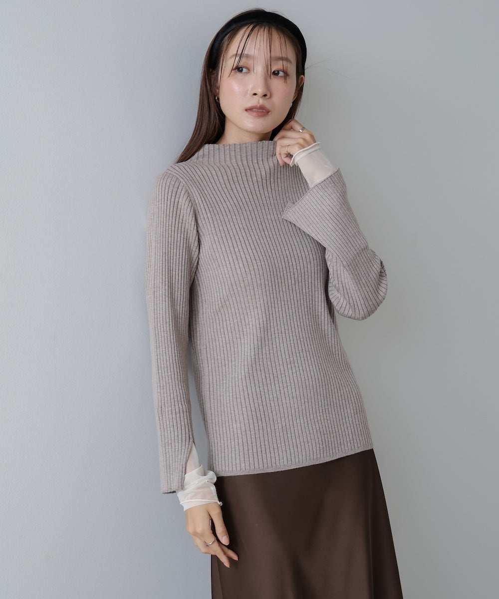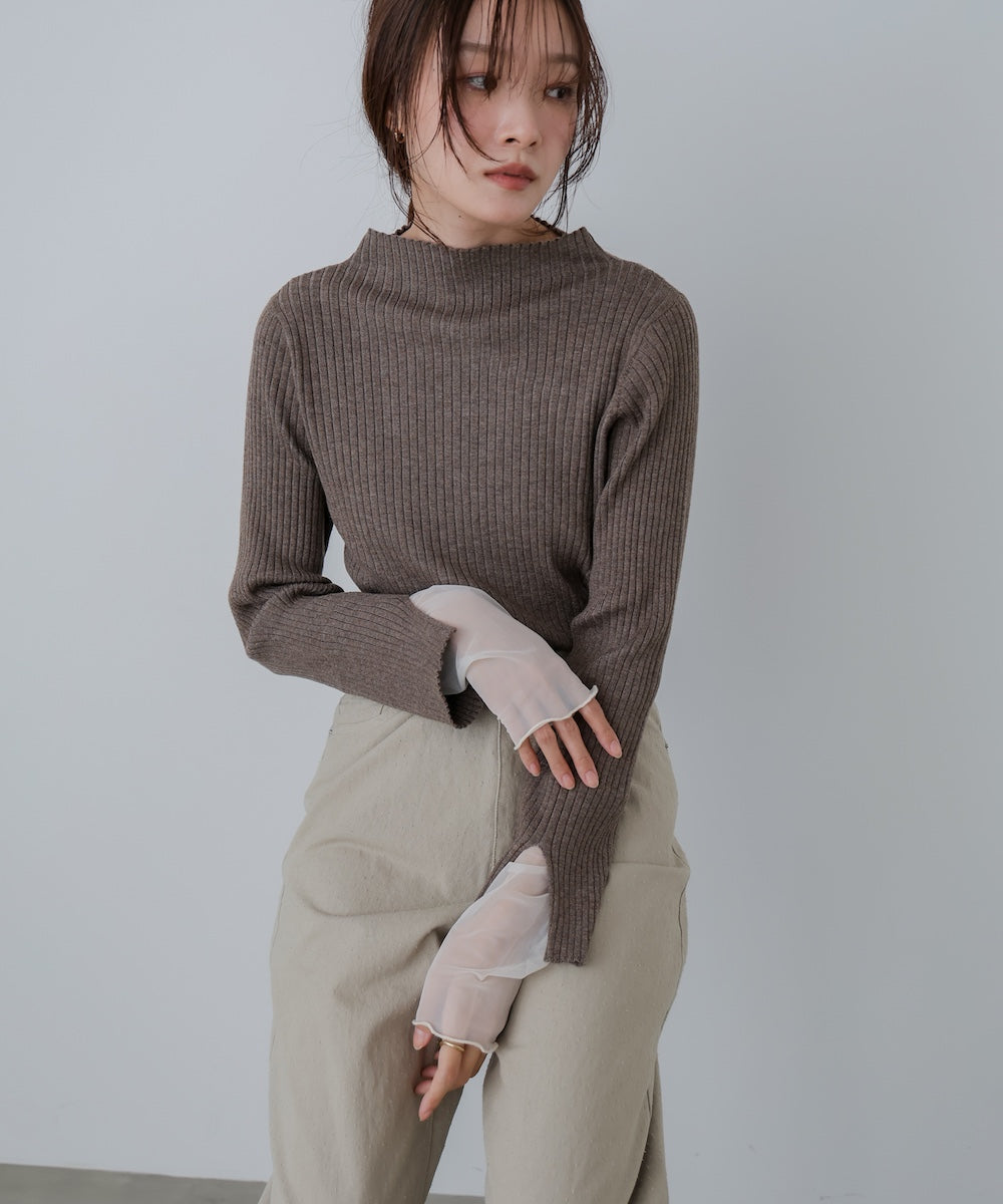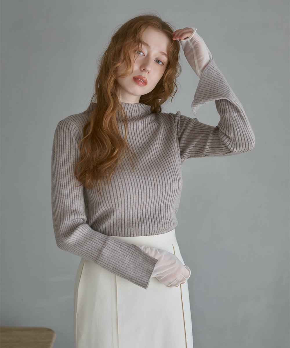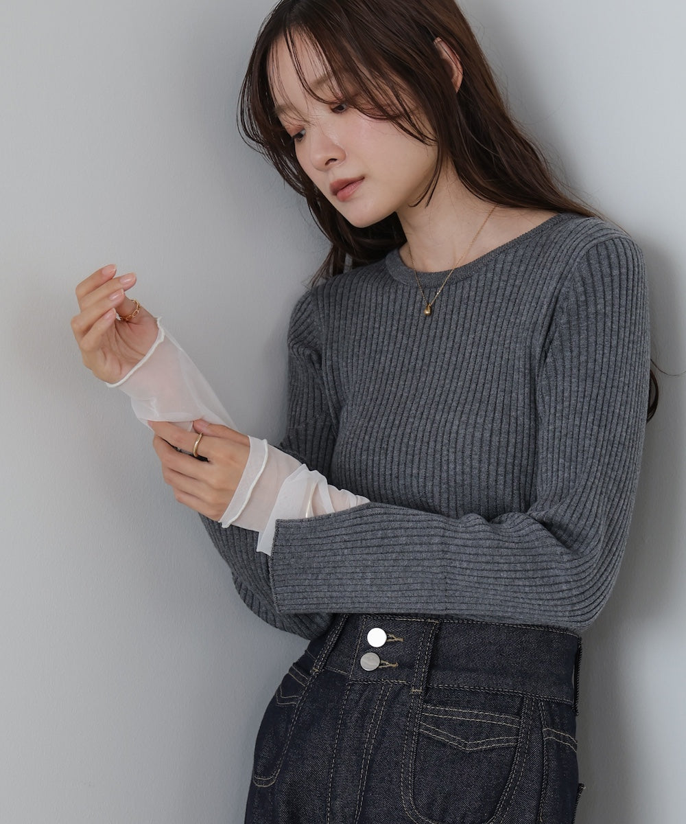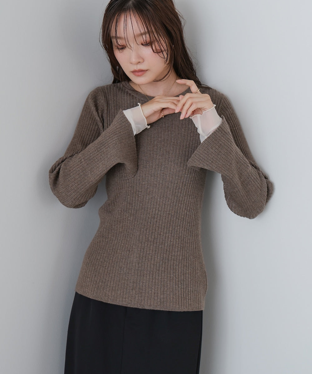 繊細なチュールを重ねた袖デザインが印象的なチュールレイヤードリブニット。リブ編みのすっきりとしたシルエットに、ふんわりと重なるチュールが女性らしい抜け感をプラス。首元はボートネックとハイネックの2種類から選べるので、シーンやスタイルに合わせて印象を変えられるのも魅力です。程よい厚みのあるニット素材にチュールを組み合わせ、華やかさと着心地の良さを両立。デイリーから特別なお出かけまで、幅広く活躍してくれる大人フェミニンな一枚です。