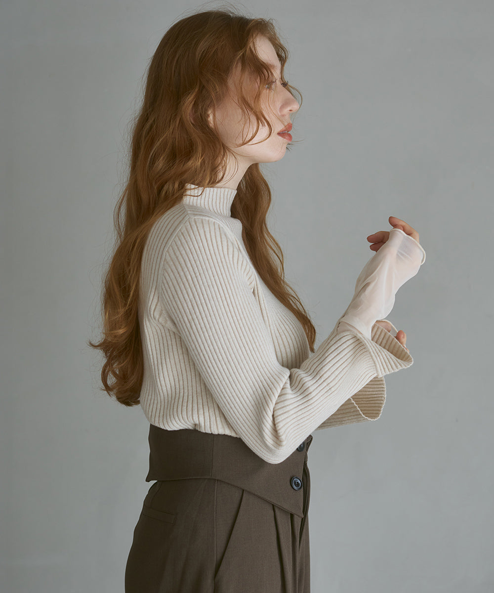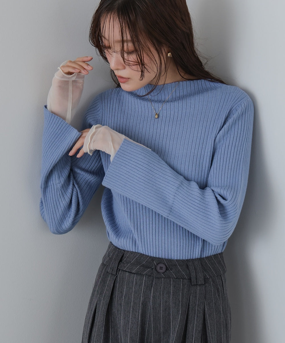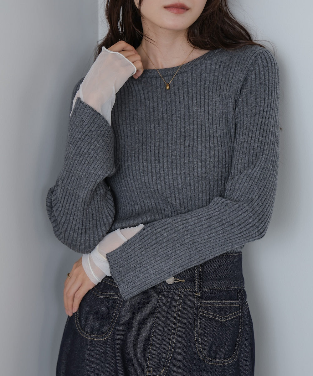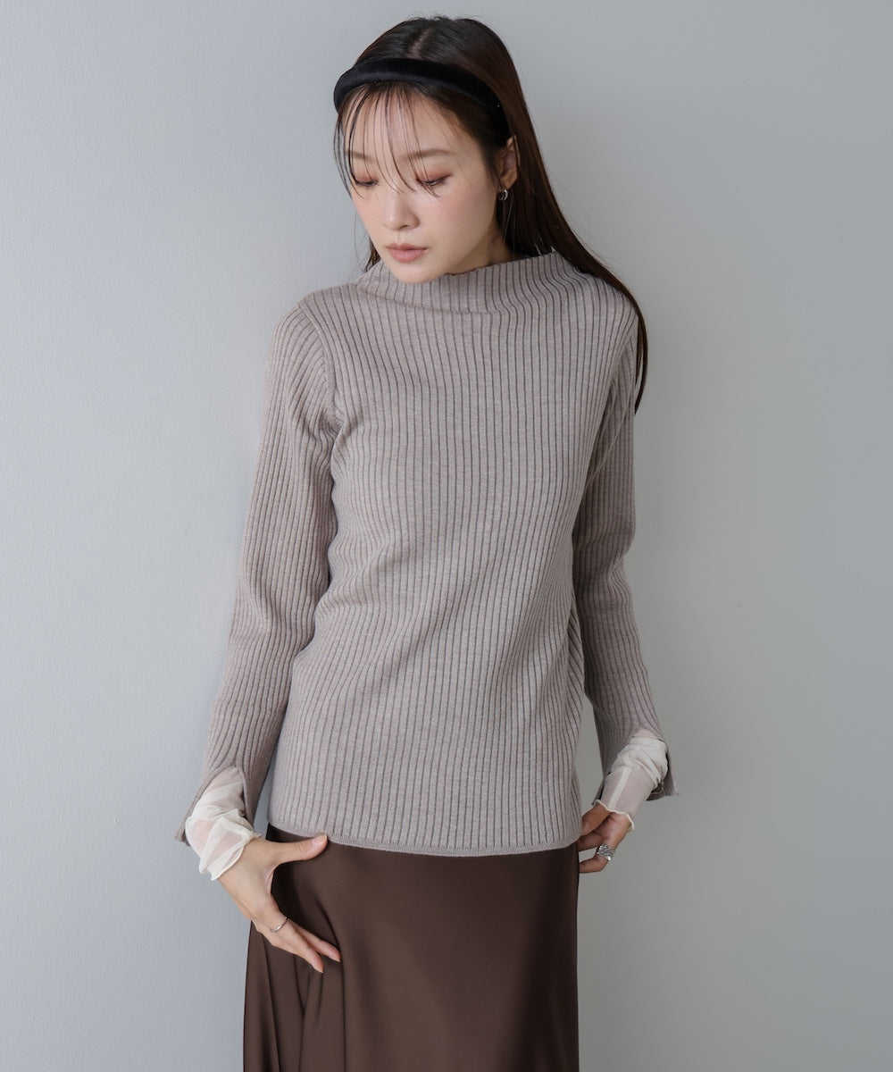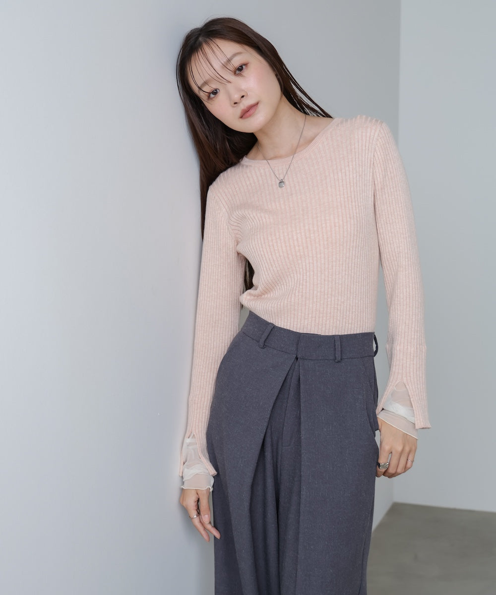 繊細なチュールを重ねた袖デザインが印象的なチュールレイヤードリブニット。リブ編みのすっきりとしたシルエットに、ふんわりと重なるチュールが女性らしい抜け感をプラス。首元はボートネックとハイネックの2種類から選べるので、シーンやスタイルに合わせて印象を変えられるのも魅力です。程よい厚みのあるニット素材にチュールを組み合わせ、華やかさと着心地の良さを両立。デイリーから特別なお出かけまで、幅広く活躍してくれる大人フェミニンな一枚です。
