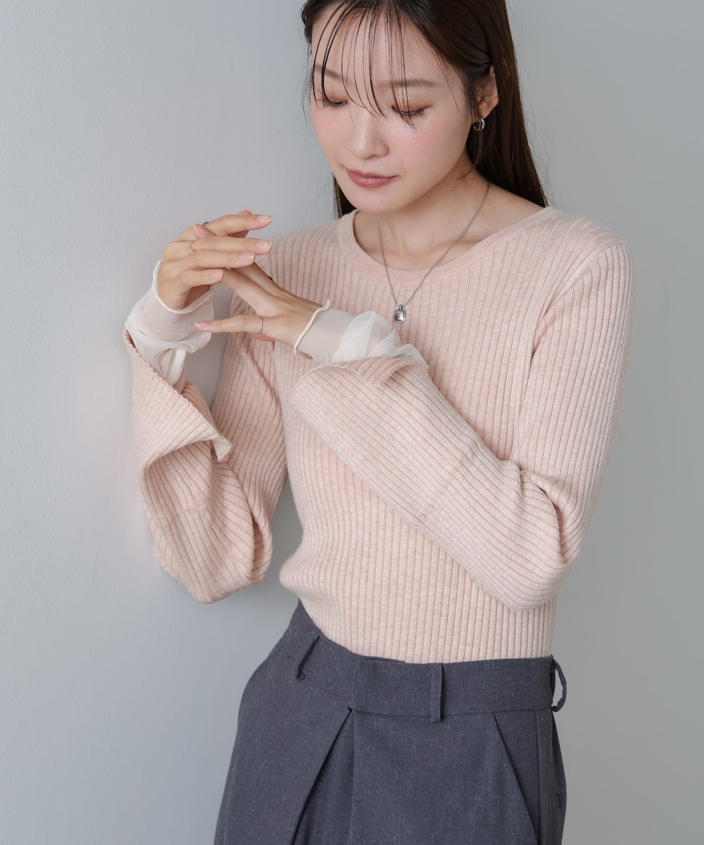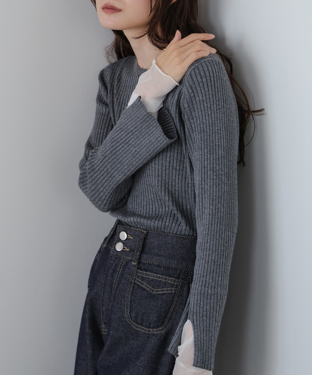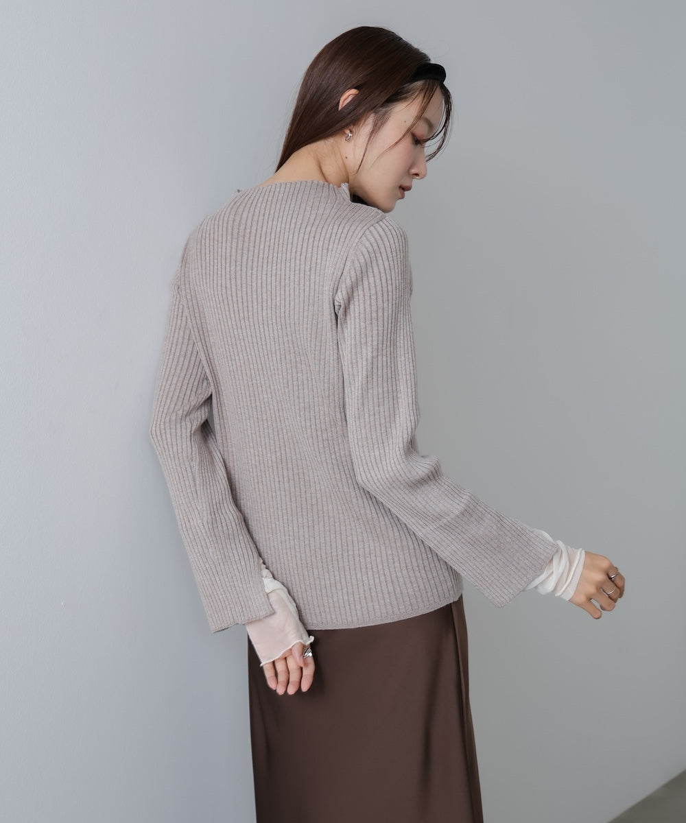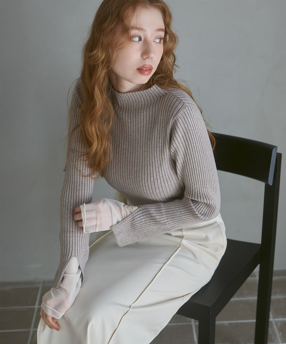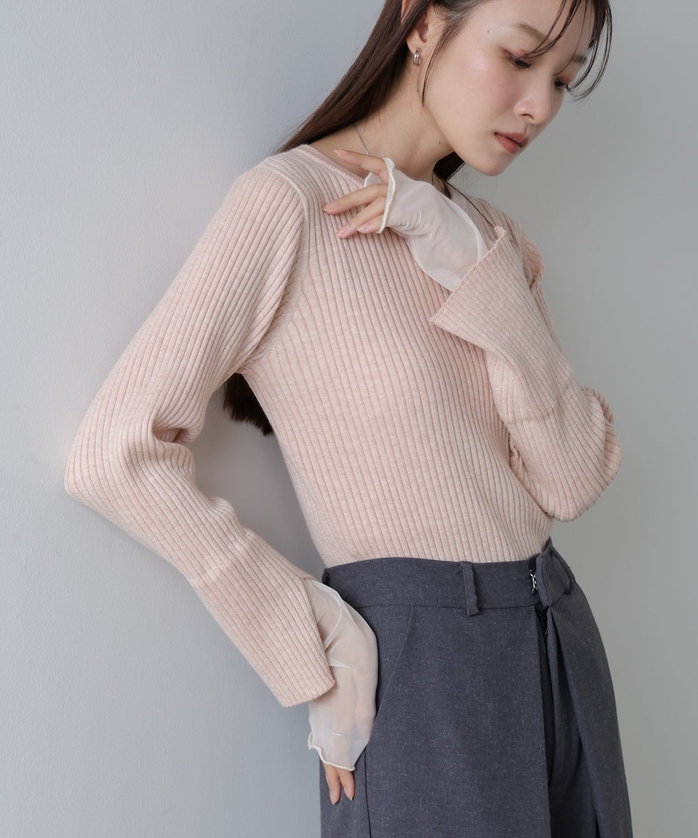 繊細なチュールを重ねた袖デザインが印象的なチュールレイヤードリブニット。リブ編みのすっきりとしたシルエットに、ふんわりと重なるチュールが女性らしい抜け感をプラス。首元はボートネックとハイネックの2種類から選べるので、シーンやスタイルに合わせて印象を変えられるのも魅力です。程よい厚みのあるニット素材にチュールを組み合わせ、華やかさと着心地の良さを両立。デイリーから特別なお出かけまで、幅広く活躍してくれる大人フェミニンな一枚です。