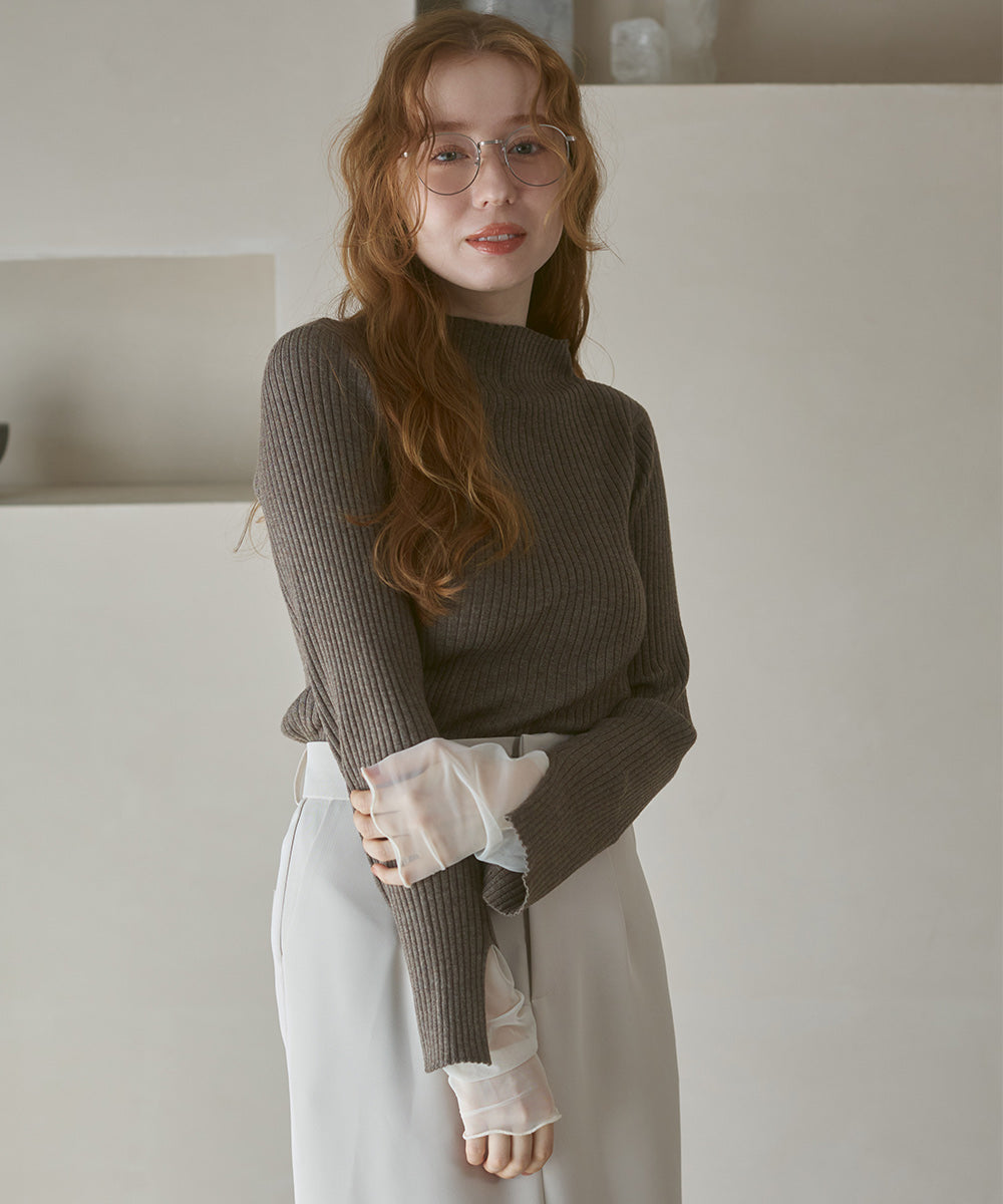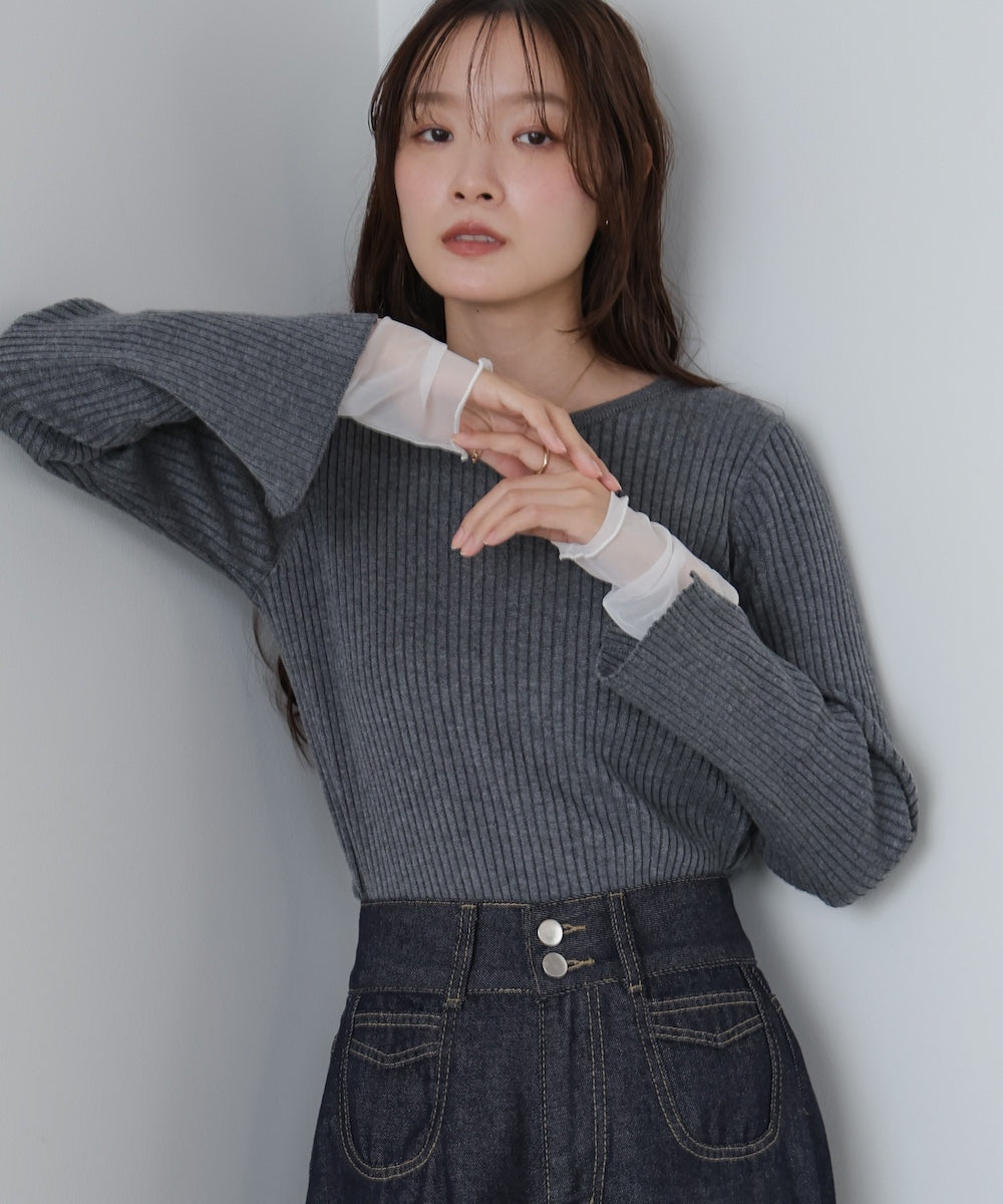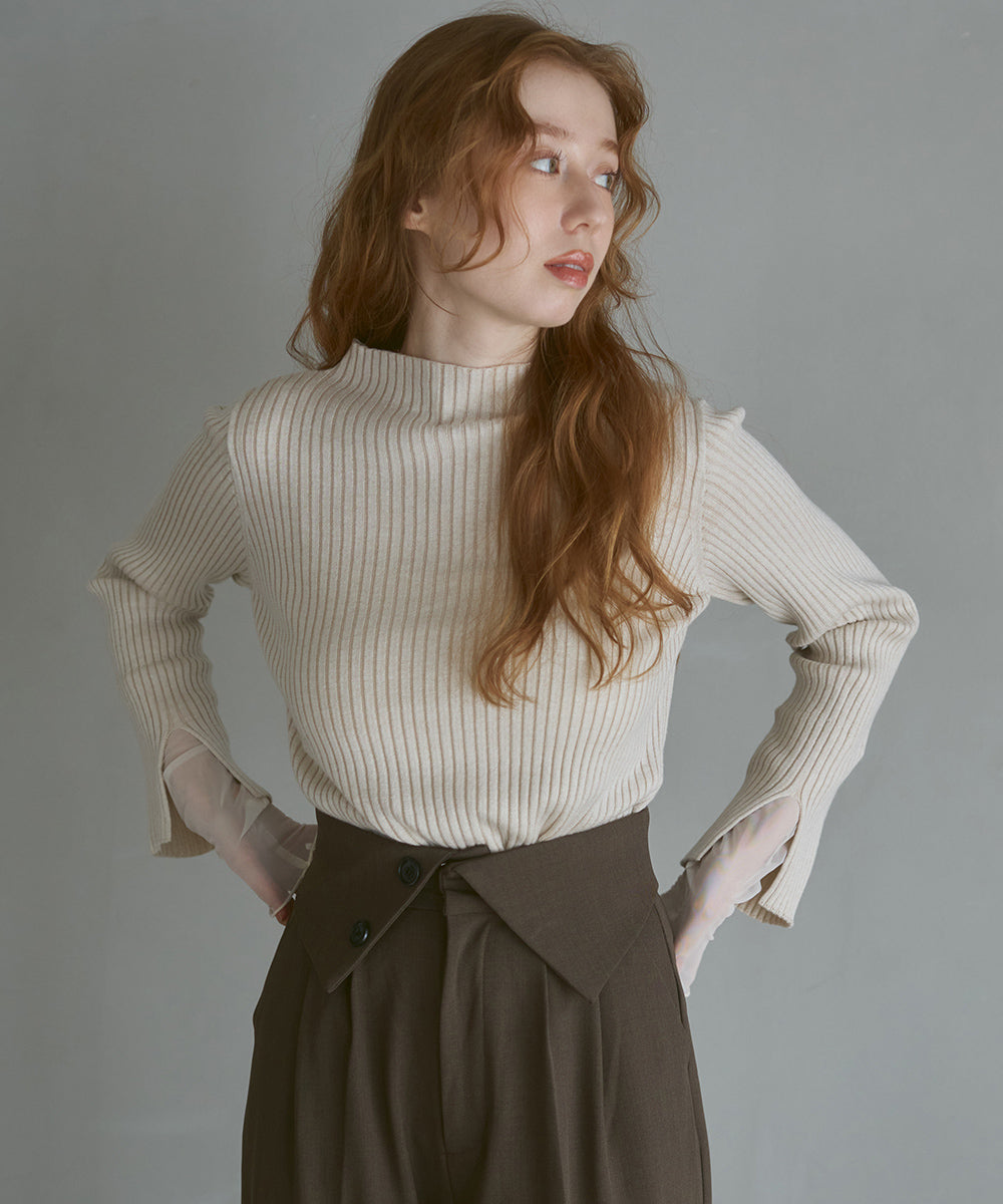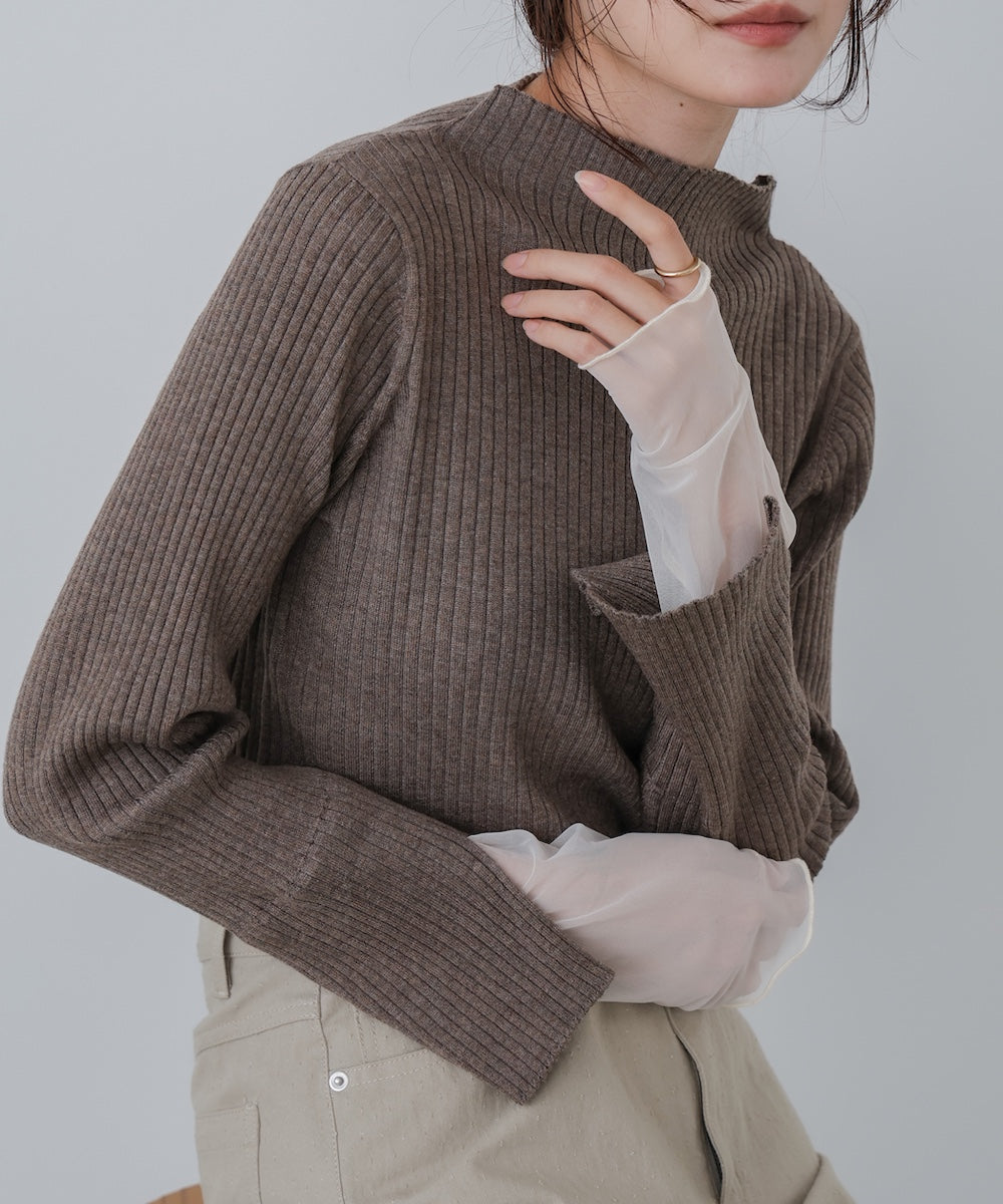 繊細なチュールを重ねた袖デザインが印象的なチュールレイヤードリブニット。リブ編みのすっきりとしたシルエットに、ふんわりと重なるチュールが女性らしい抜け感をプラス。首元はボートネックとハイネックの2種類から選べるので、シーンやスタイルに合わせて印象を変えられるのも魅力です。程よい厚みのあるニット素材にチュールを組み合わせ、華やかさと着心地の良さを両立。デイリーから特別なお出かけまで、幅広く活躍してくれる大人フェミニンな一枚です。