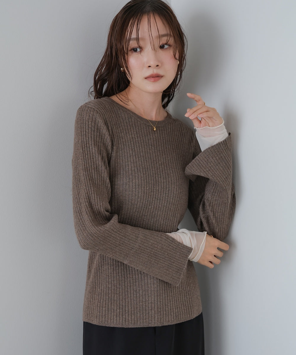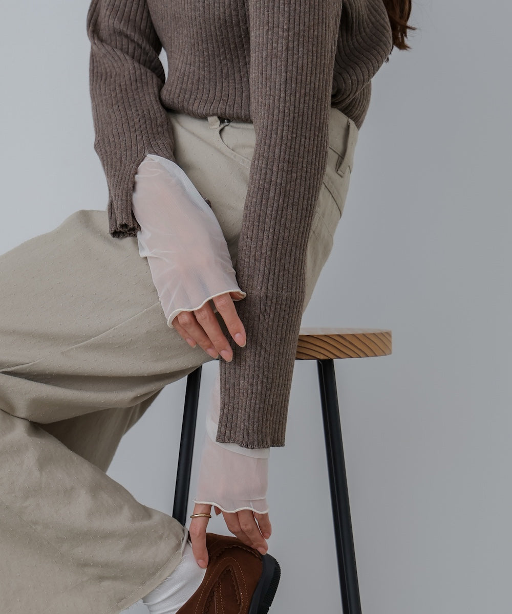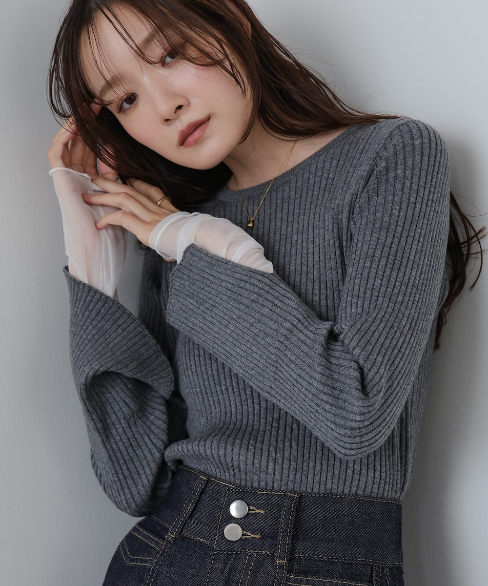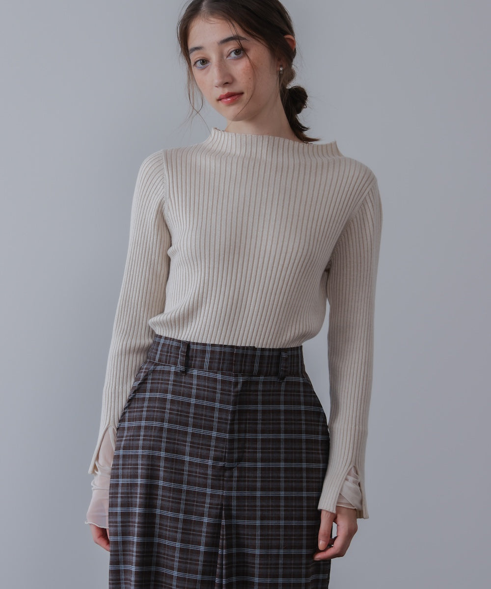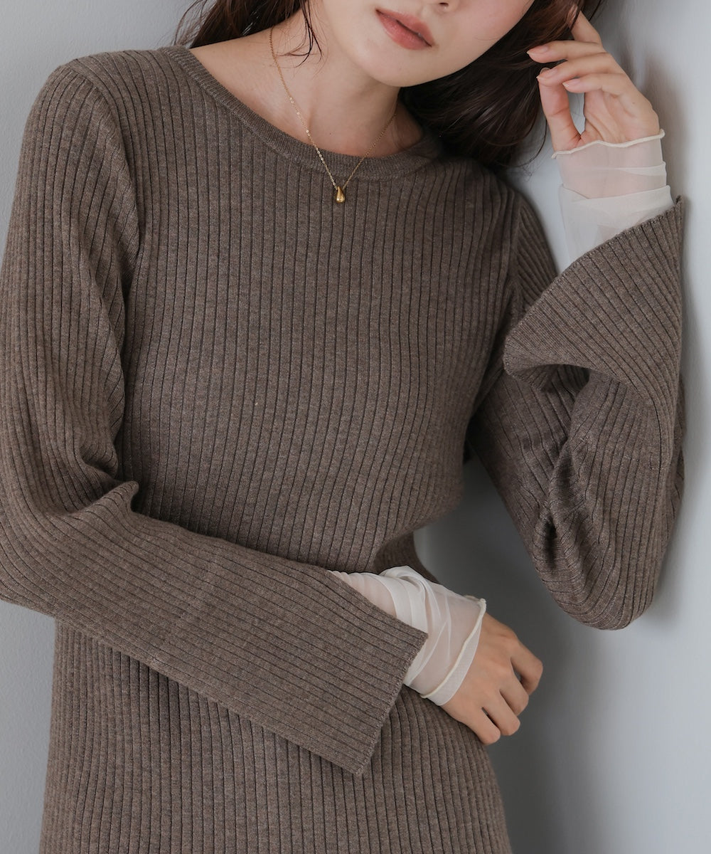 繊細なチュールを重ねた袖デザインが印象的なチュールレイヤードリブニット。リブ編みのすっきりとしたシルエットに、ふんわりと重なるチュールが女性らしい抜け感をプラス。首元はボートネックとハイネックの2種類から選べるので、シーンやスタイルに合わせて印象を変えられるのも魅力です。程よい厚みのあるニット素材にチュールを組み合わせ、華やかさと着心地の良さを両立。デイリーから特別なお出かけまで、幅広く活躍してくれる大人フェミニンな一枚です。