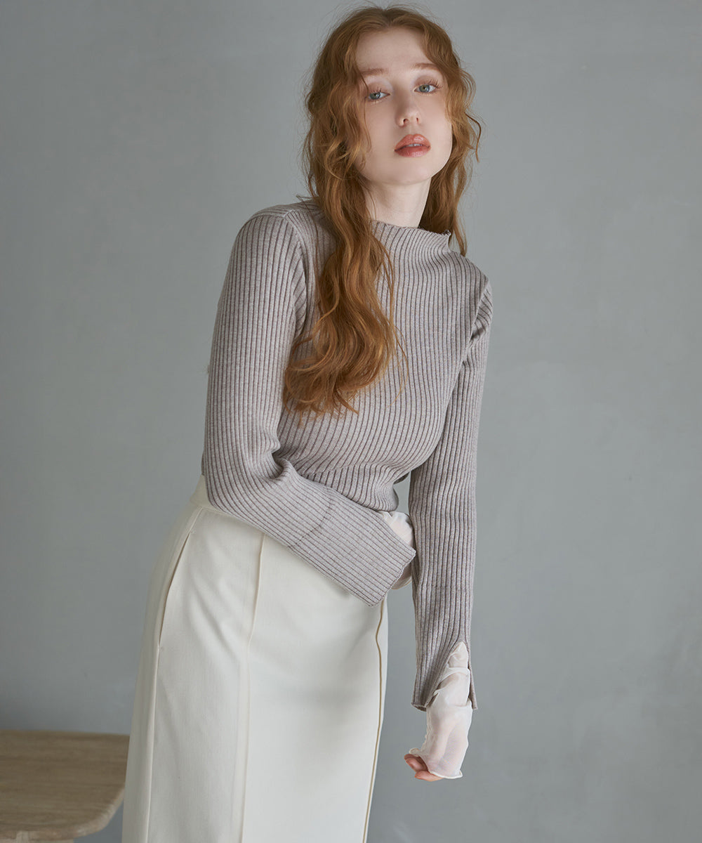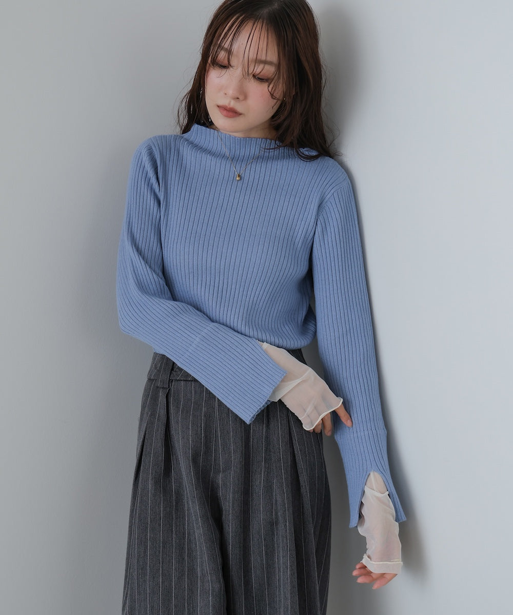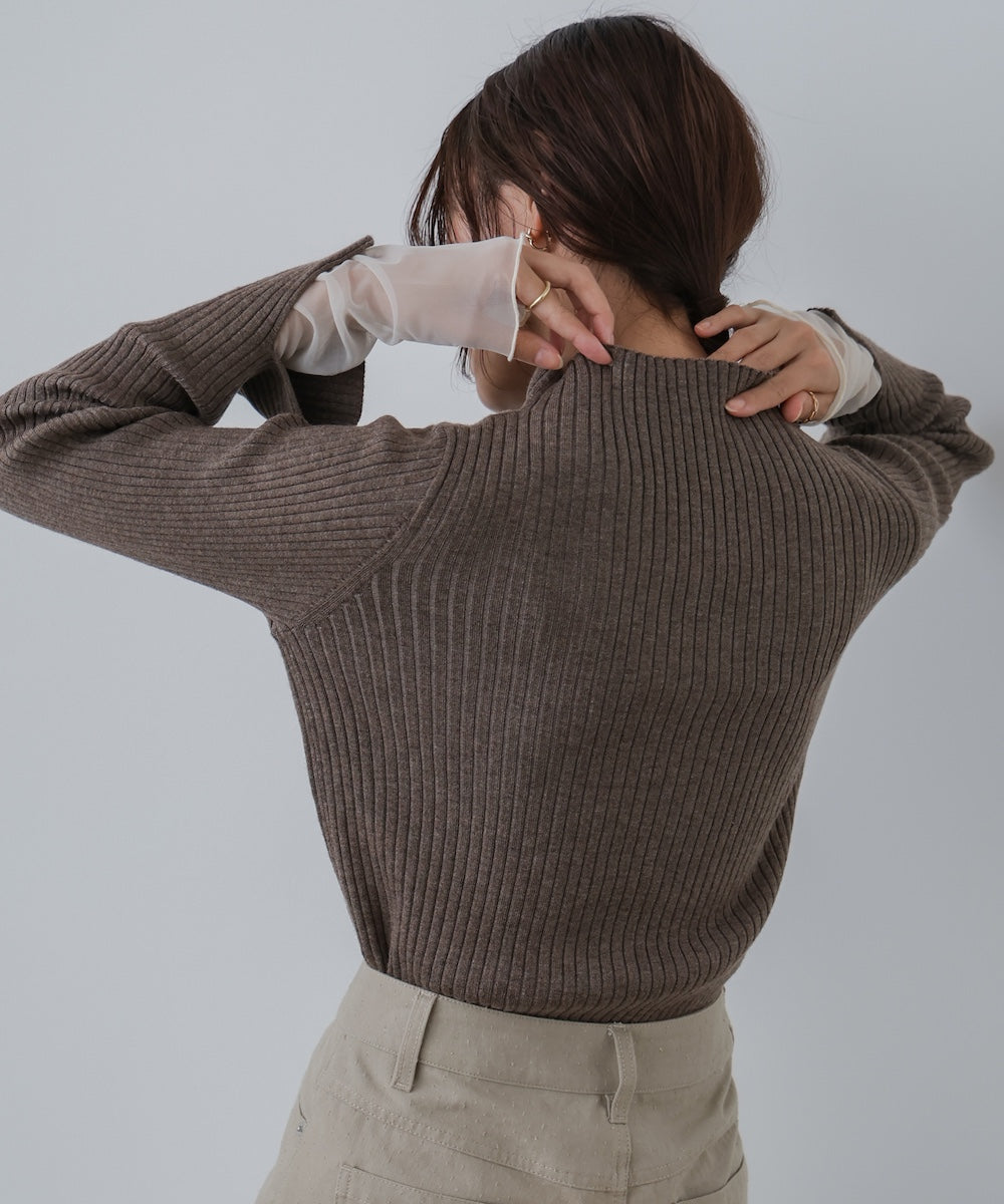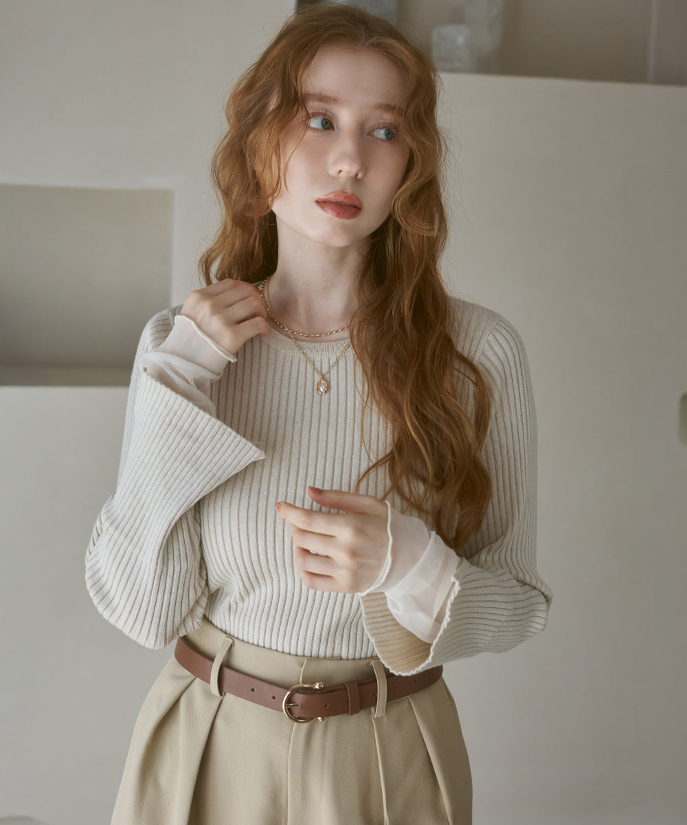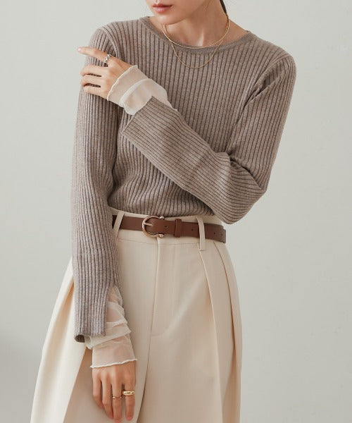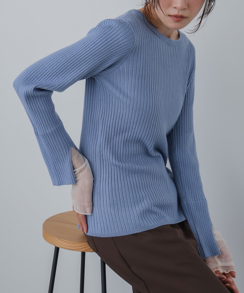 繊細なチュールを重ねた袖デザインが印象的なチュールレイヤードリブニット。リブ編みのすっきりとしたシルエットに、ふんわりと重なるチュールが女性らしい抜け感をプラス。首元はボートネックとハイネックの2種類から選べるので、シーンやスタイルに合わせて印象を変えられるのも魅力です。程よい厚みのあるニット素材にチュールを組み合わせ、華やかさと着心地の良さを両立。デイリーから特別なお出かけまで、幅広く活躍してくれる大人フェミニンな一枚です。