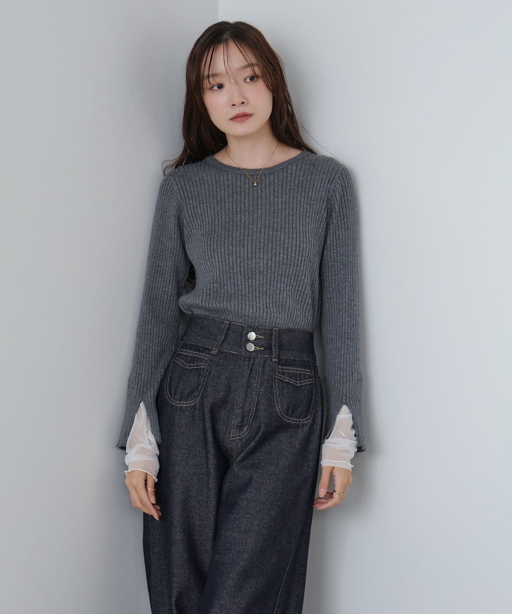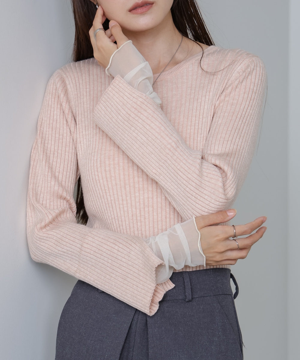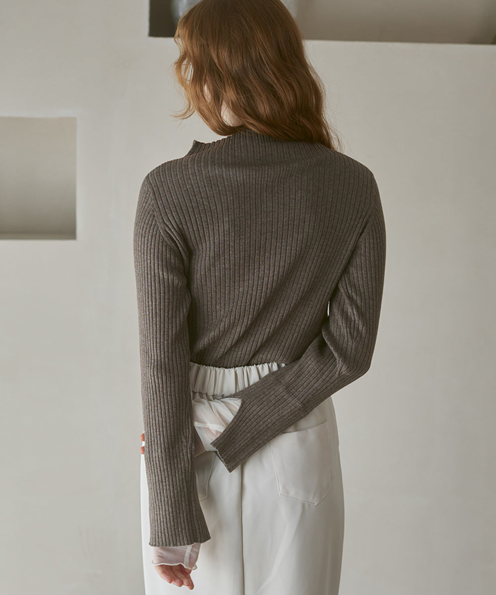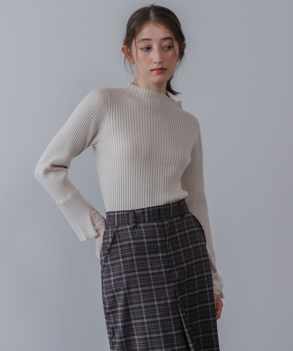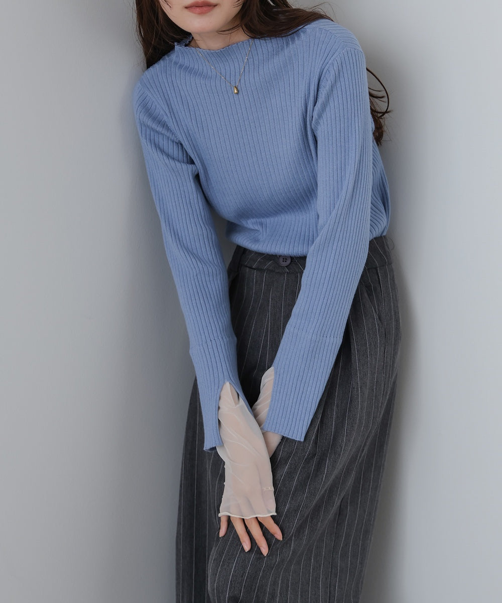繊細なチュールを重ねた袖デザインが印象的なチュールレイヤードリブニット。リブ編みのすっきりとしたシルエットに、ふんわりと重なるチュールが女性らしい抜け感をプラス。首元はボートネックとハイネックの2種類から選べるので、シーンやスタイルに合わせて印象を変えられるのも魅力です。程よい厚みのあるニット素材にチュールを組み合わせ、華やかさと着心地の良さを両立。デイリーから特別なお出かけまで、幅広く活躍してくれる大人フェミニンな一枚です。