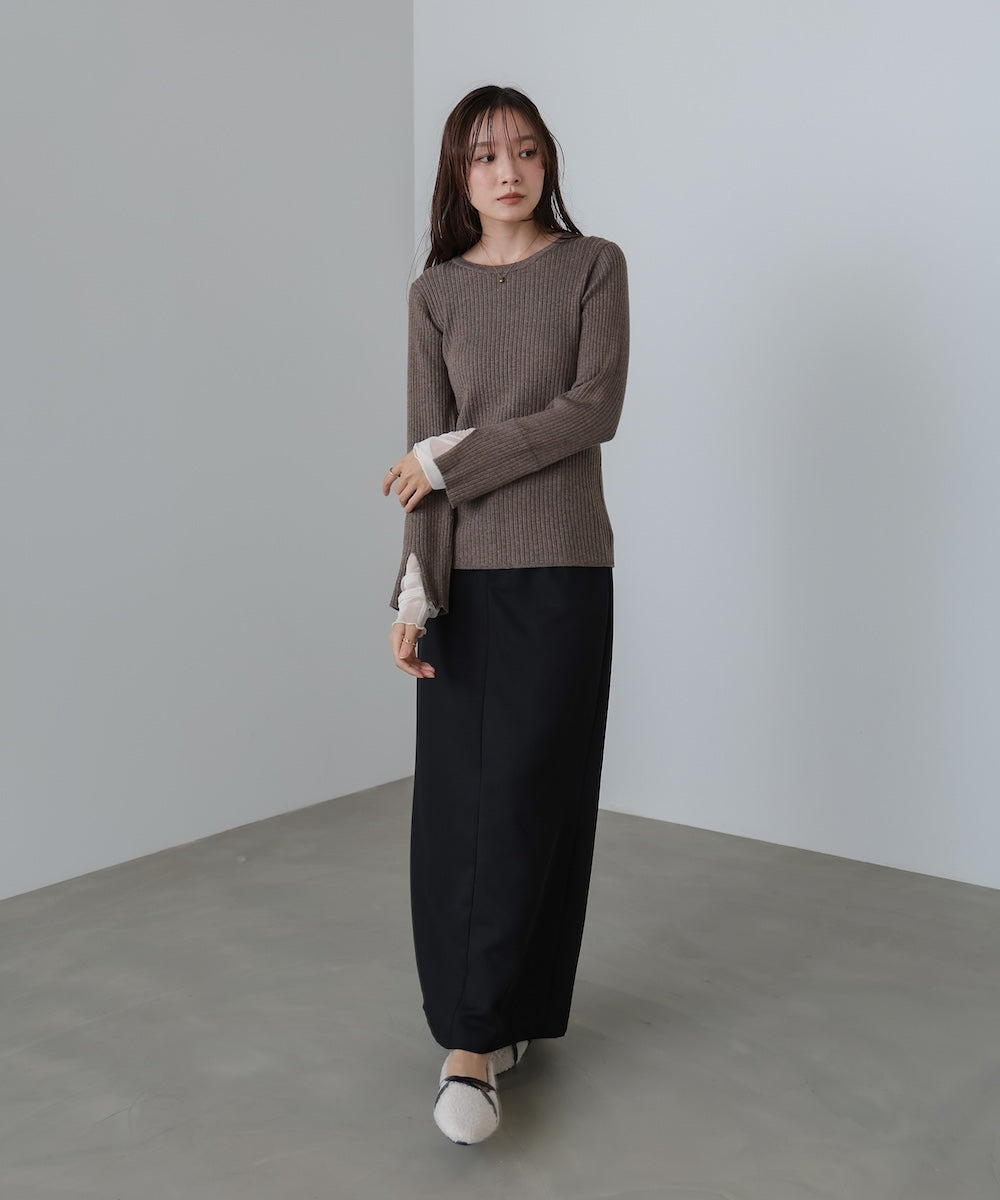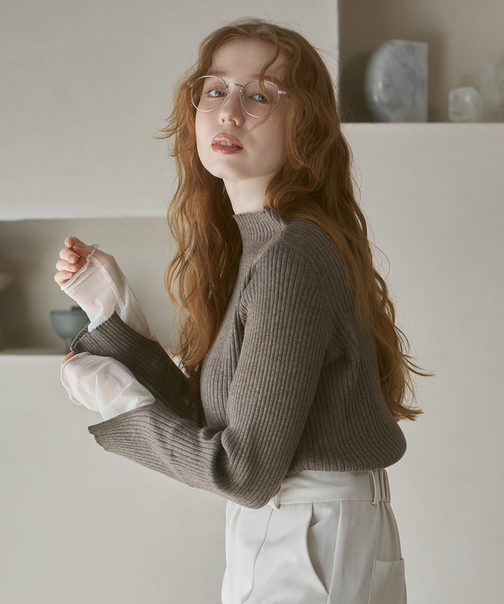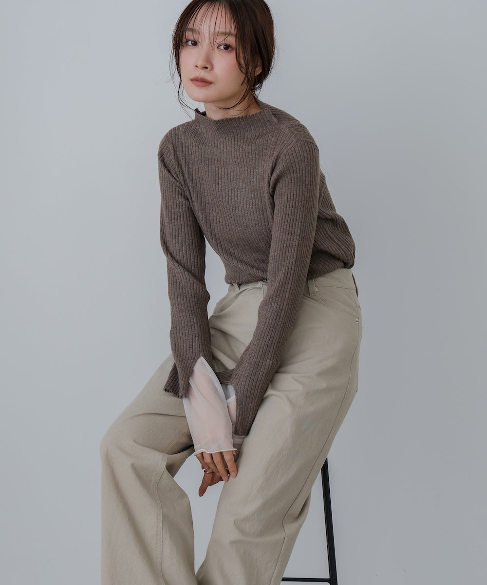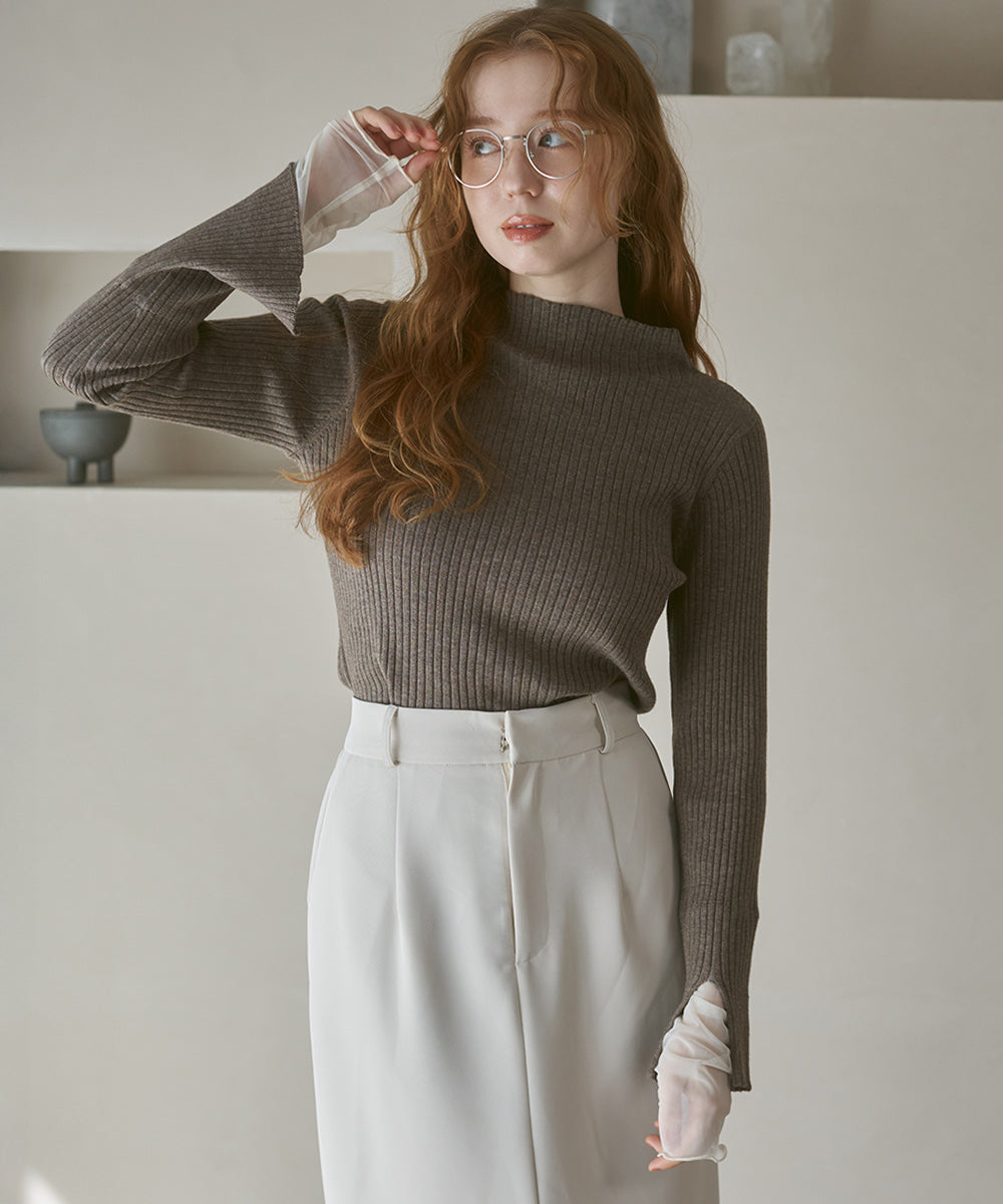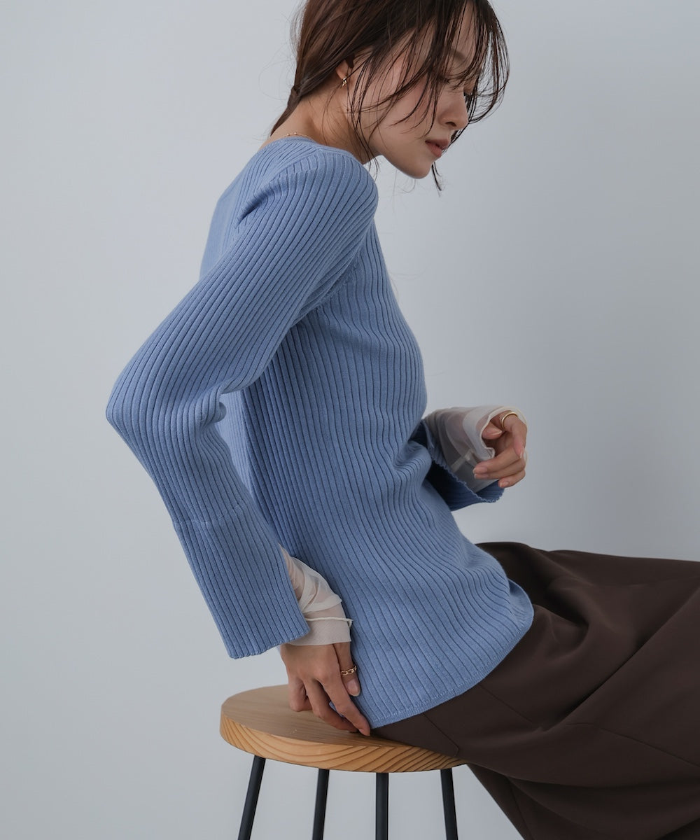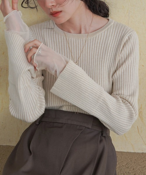 繊細なチュールを重ねた袖デザインが印象的なチュールレイヤードリブニット。リブ編みのすっきりとしたシルエットに、ふんわりと重なるチュールが女性らしい抜け感をプラス。首元はボートネックとハイネックの2種類から選べるので、シーンやスタイルに合わせて印象を変えられるのも魅力です。程よい厚みのあるニット素材にチュールを組み合わせ、華やかさと着心地の良さを両立。デイリーから特別なお出かけまで、幅広く活躍してくれる大人フェミニンな一枚です。