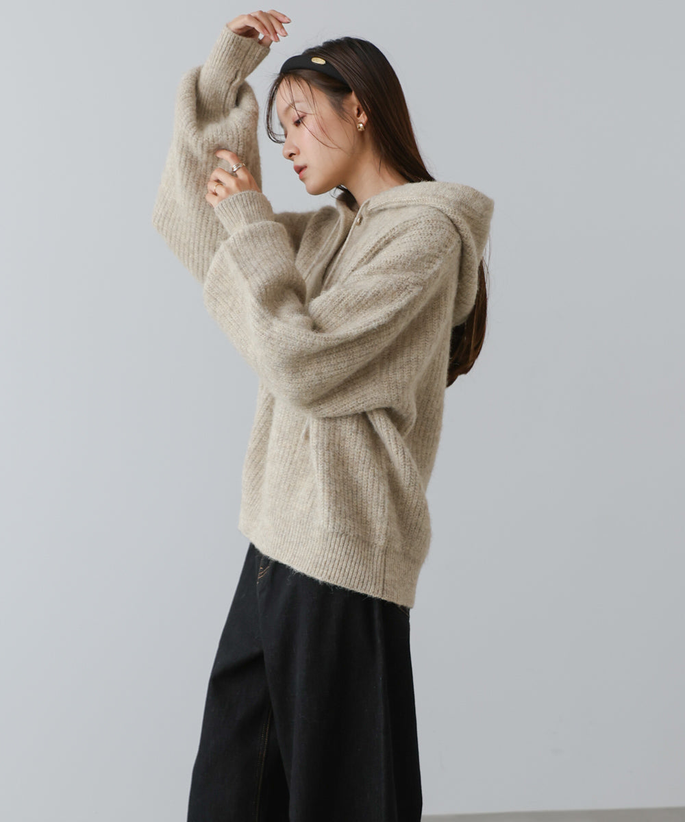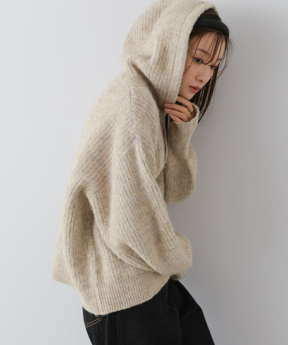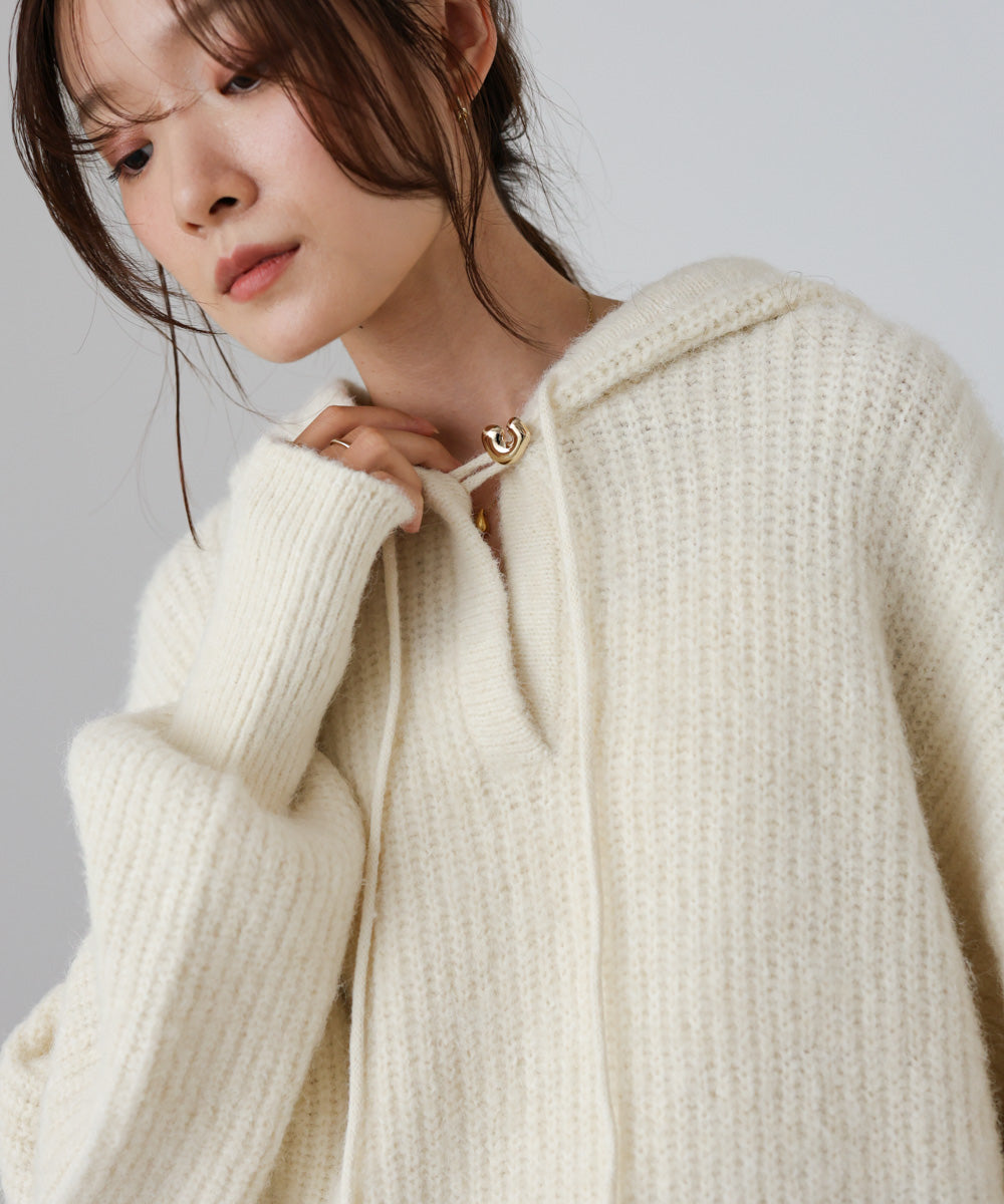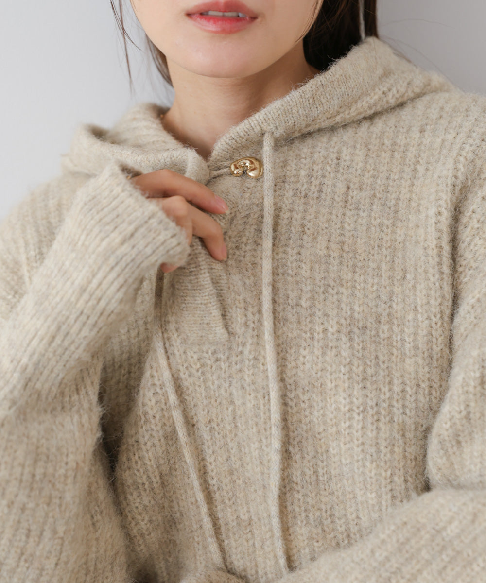 やわらかなニット素材で仕立てたフーディートップス。ふんわりとしたボリューム感がありながらも軽やかで、程よい抜け感を演出してくれます。首元にあしらわれたゴールドの金具が上品なアクセントになり、ラフすぎず大人フェミニンな印象に。アイボリー・グレー・ベージュのやさしいカラーバリエーションで、どんなコーデにもなじみ、程よいアクセントをプラスしてくれるぴったりの一枚です。