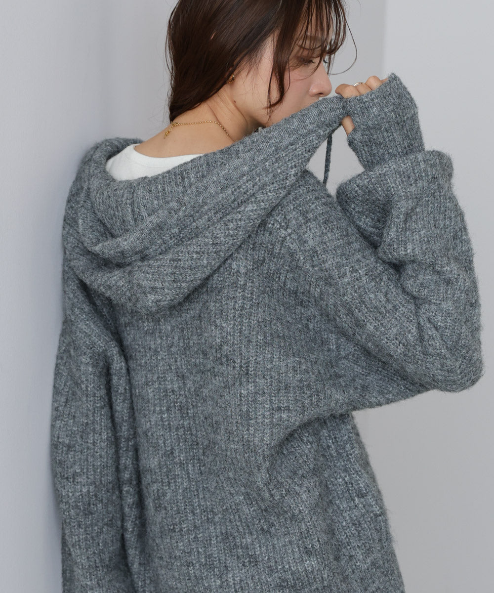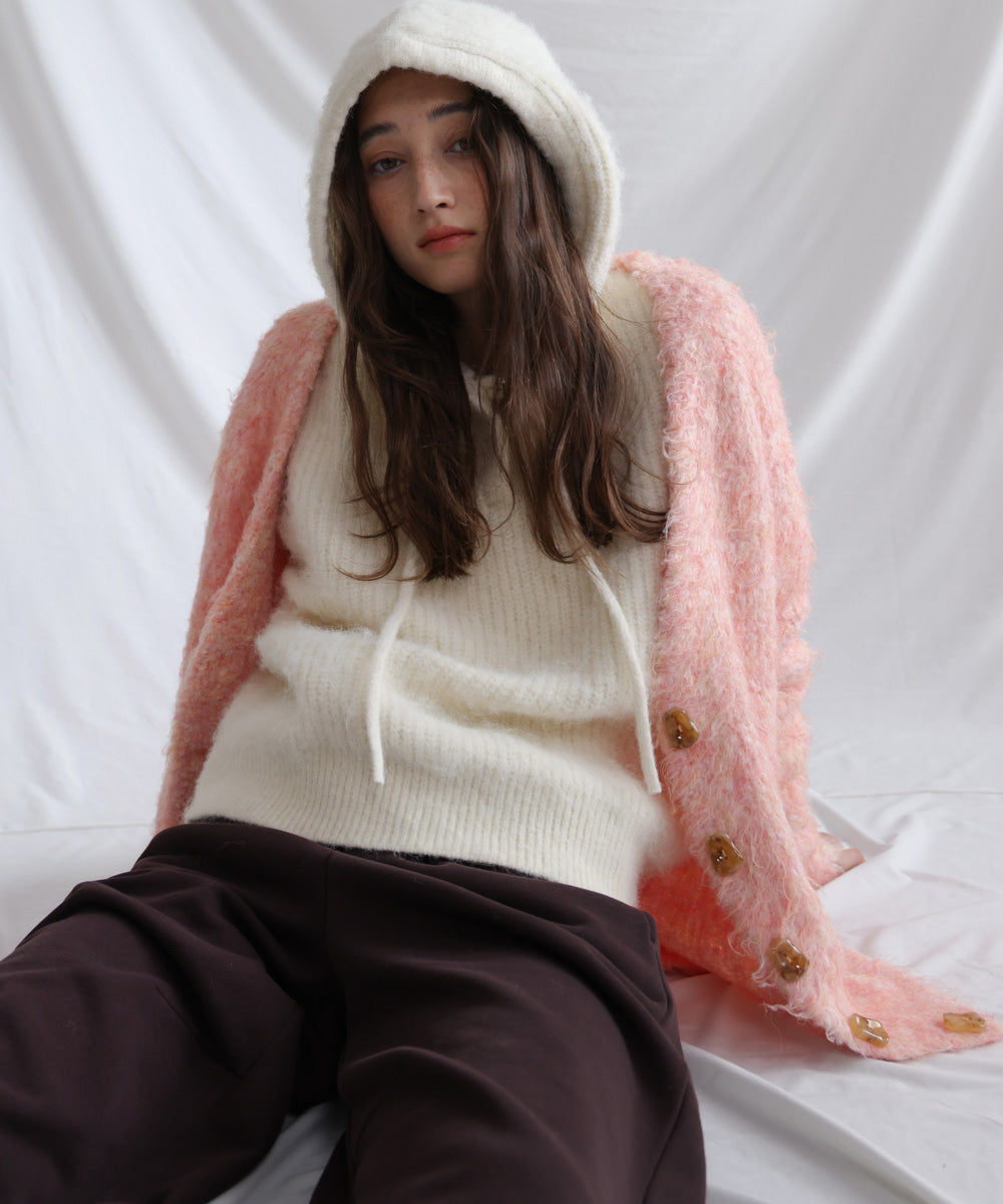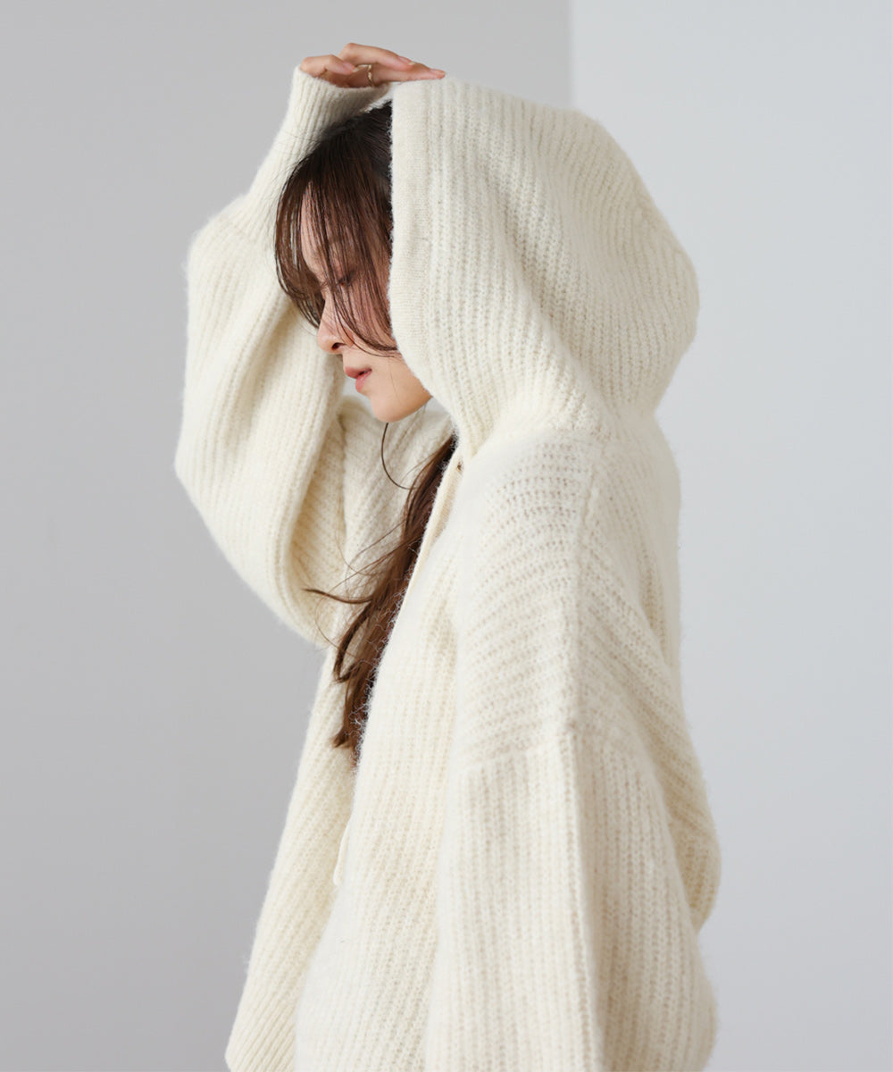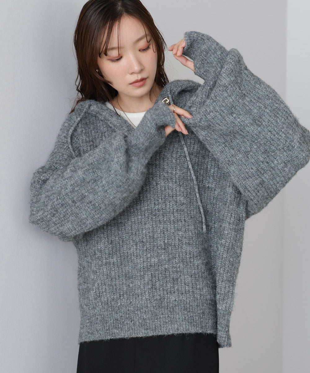 やわらかなニット素材で仕立てたフーディートップス。ふんわりとしたボリューム感がありながらも軽やかで、程よい抜け感を演出してくれます。首元にあしらわれたゴールドの金具が上品なアクセントになり、ラフすぎず大人フェミニンな印象に。アイボリー・グレー・ベージュのやさしいカラーバリエーションで、どんなコーデにもなじみ、程よいアクセントをプラスしてくれるぴったりの一枚です。