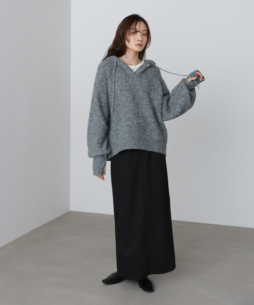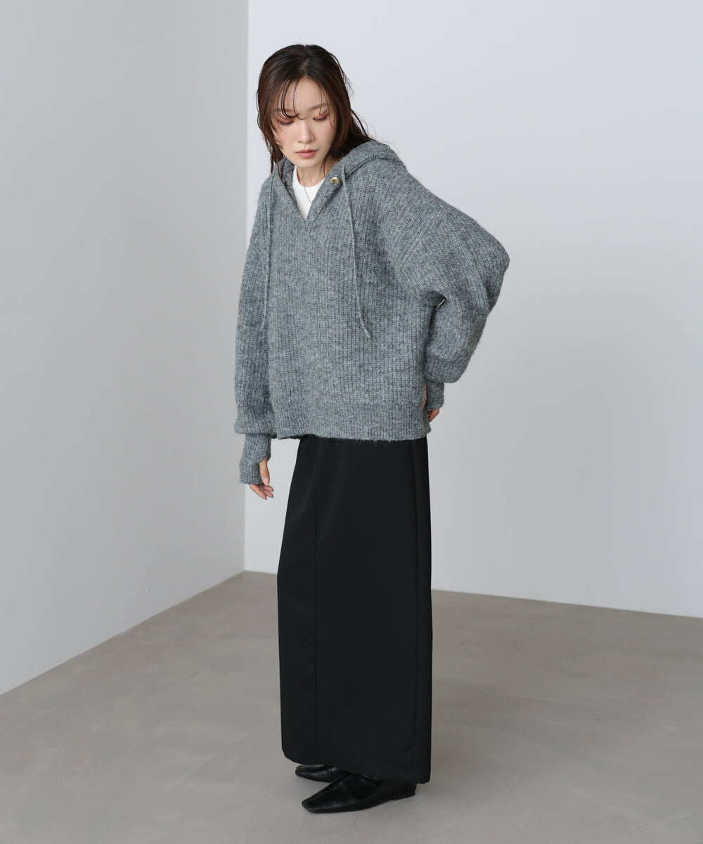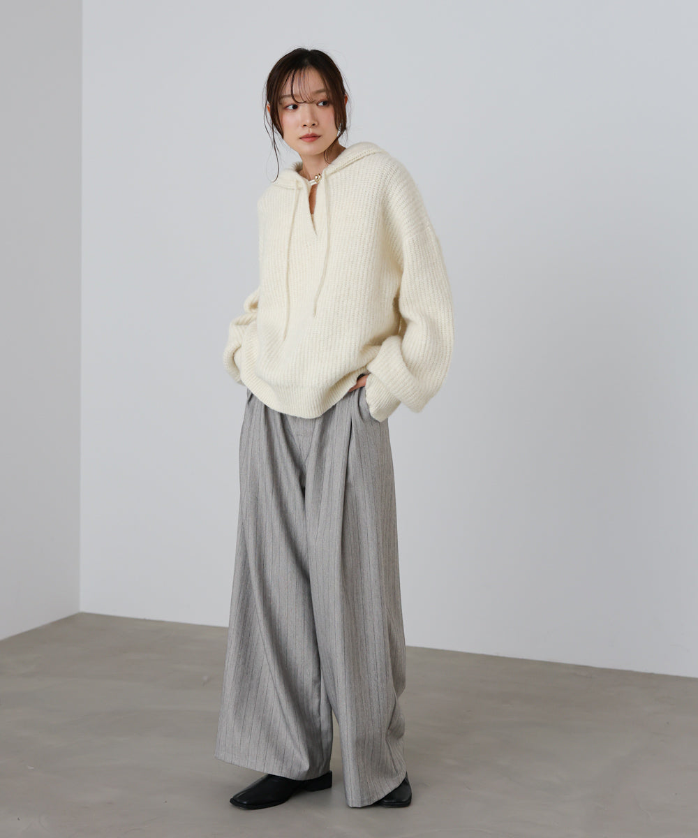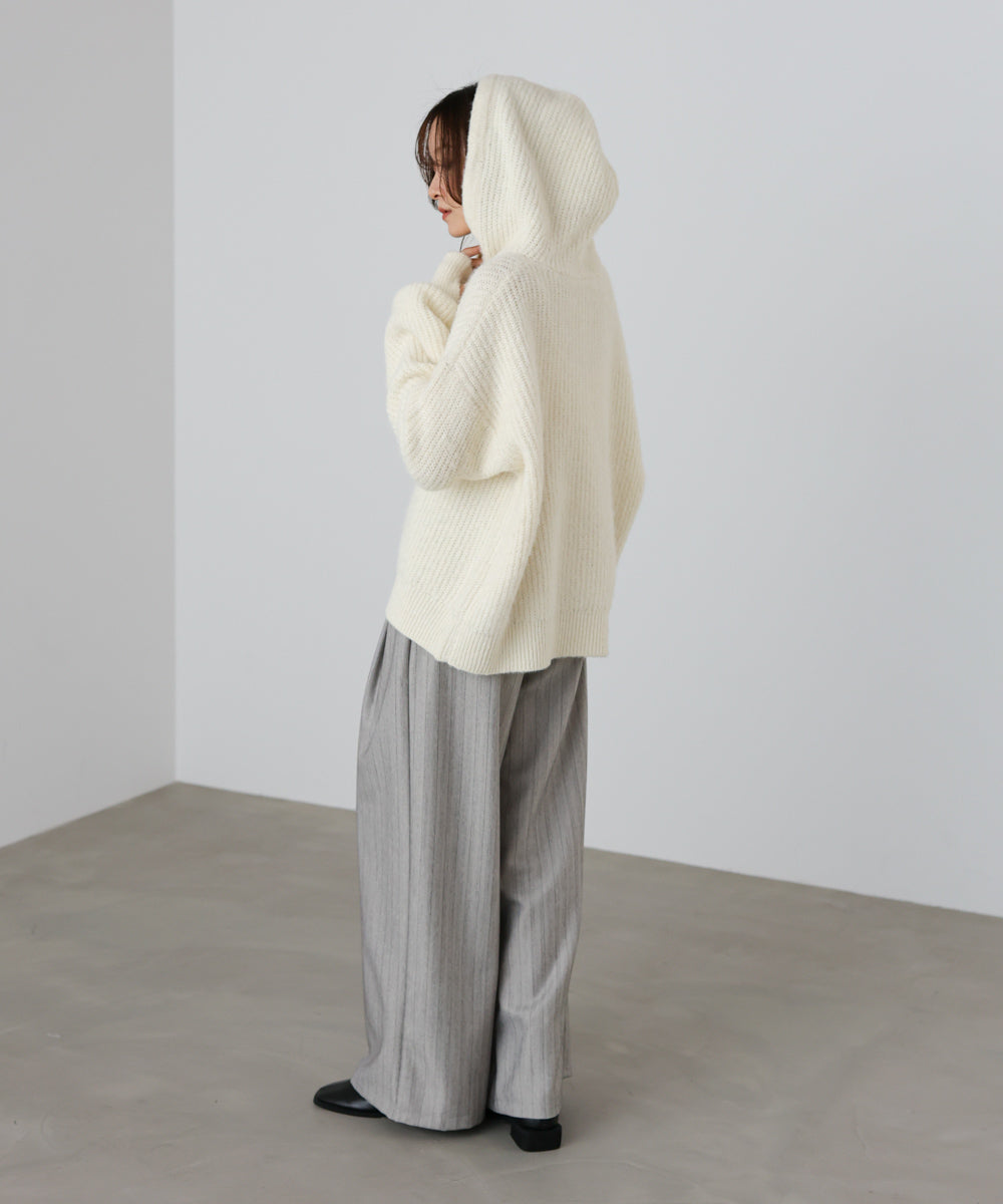 やわらかなニット素材で仕立てたフーディートップス。ふんわりとしたボリューム感がありながらも軽やかで、程よい抜け感を演出してくれます。首元にあしらわれたゴールドの金具が上品なアクセントになり、ラフすぎず大人フェミニンな印象に。アイボリー・グレー・ベージュのやさしいカラーバリエーションで、どんなコーデにもなじみ、程よいアクセントをプラスしてくれるぴったりの一枚です。