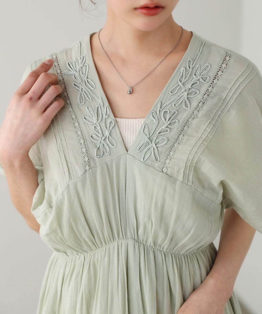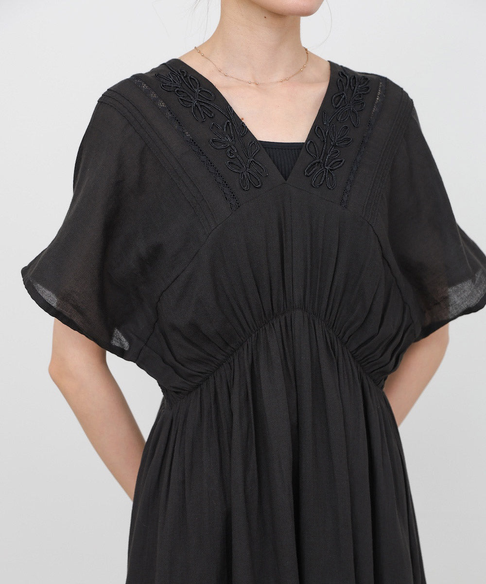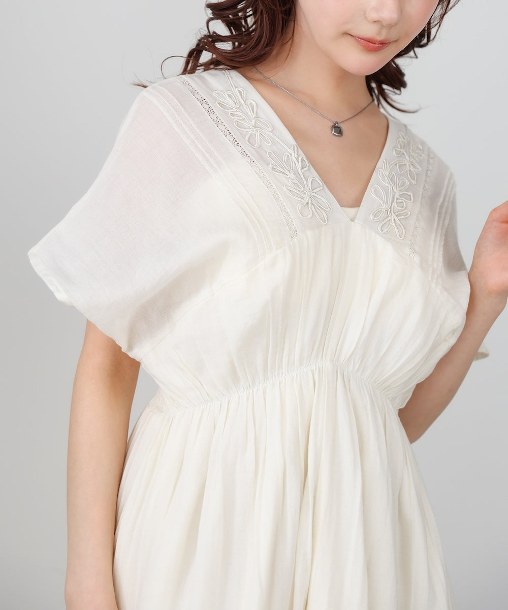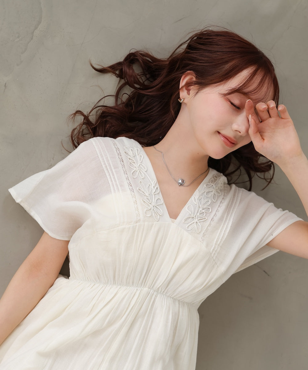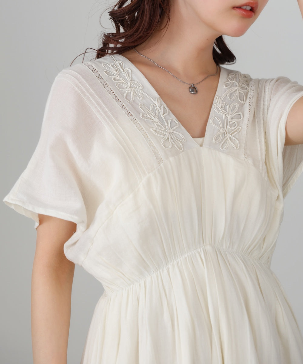ナチュラルな中にほんのりクラフト感を感じる、テープ刺繍ワンピース。ふんわりとしたシルエットにピンタックを施すことで、甘さを抑えた上品なバランスに仕上げました。顔まわりを華やかに見せてくれる刺繍デザインが、シンプルながら印象的な一枚です。