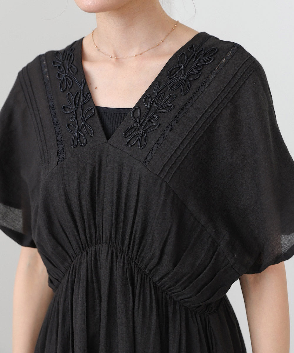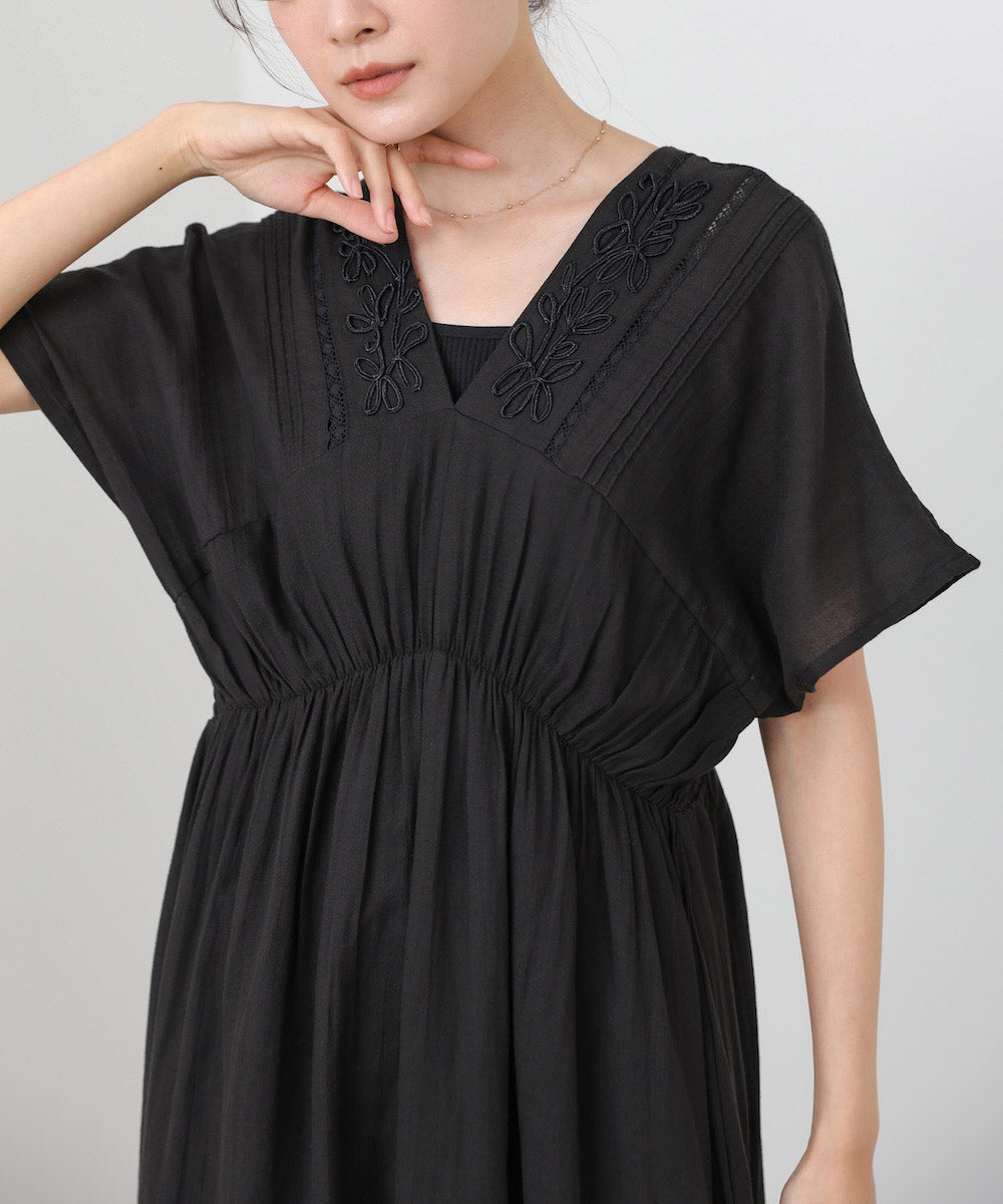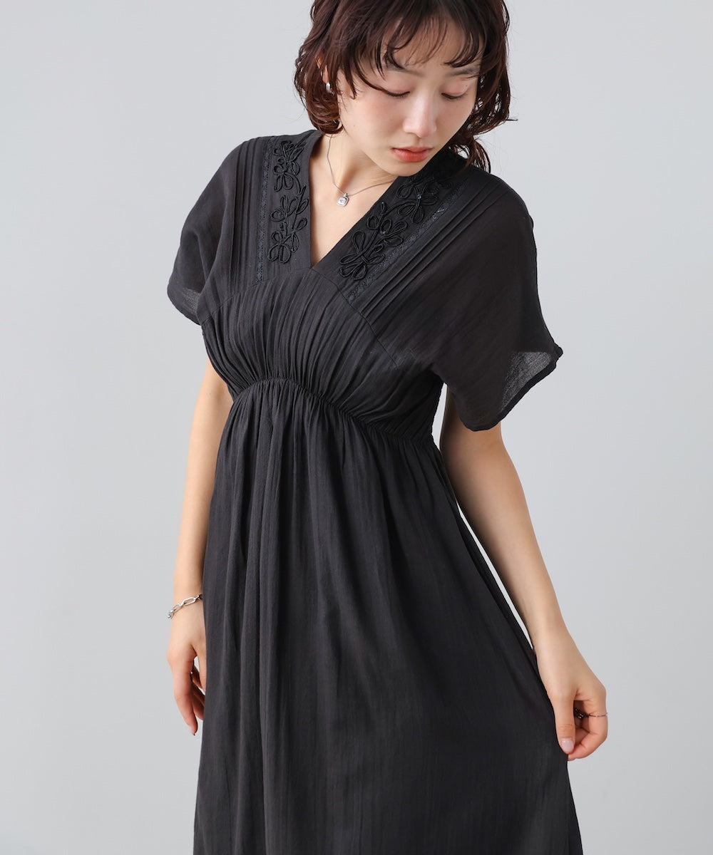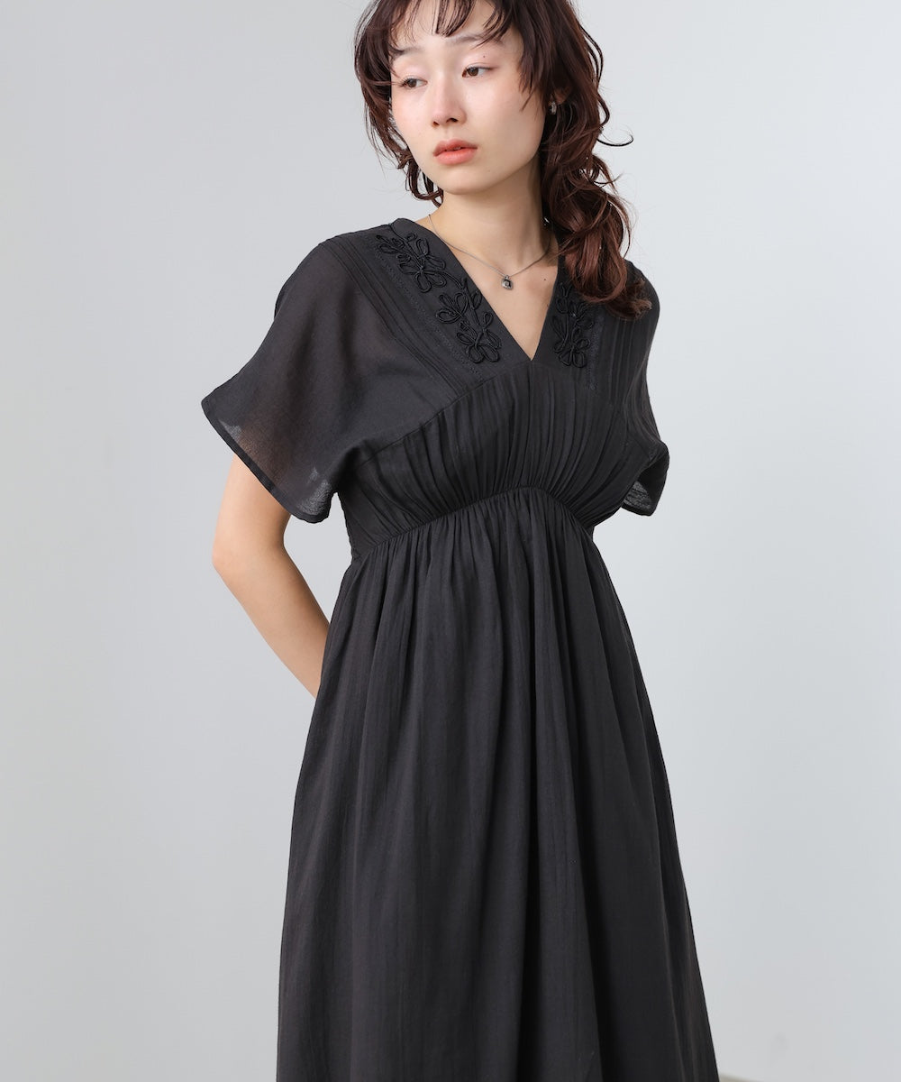 ナチュラルな中にほんのりクラフト感を感じる、テープ刺繍ワンピース。ふんわりとしたシルエットにピンタックを施すことで、甘さを抑えた上品なバランスに仕上げました。顔まわりを華やかに見せてくれる刺繍デザインが、シンプルながら印象的な一枚です。