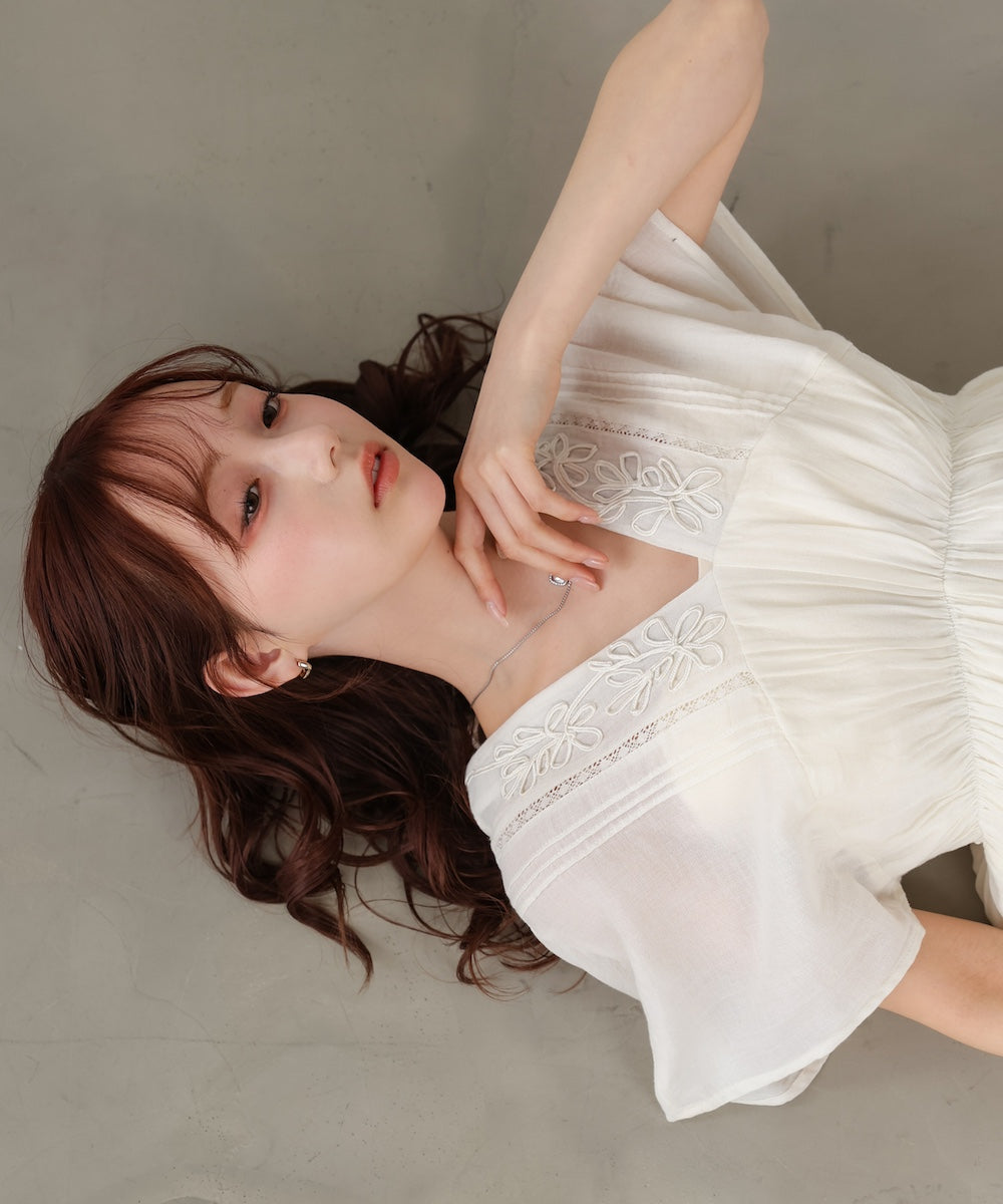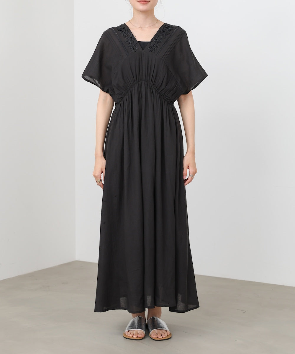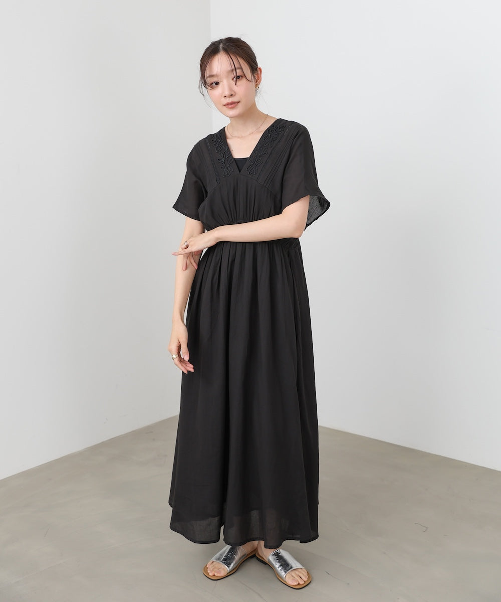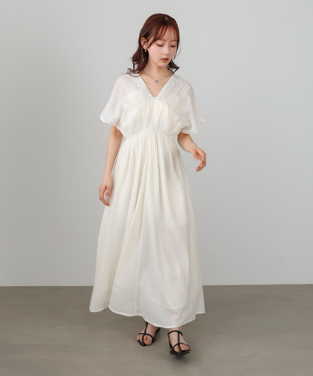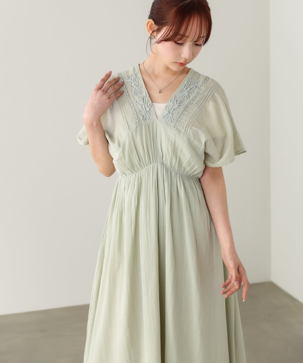 ナチュラルな中にほんのりクラフト感を感じる、テープ刺繍ワンピース。ふんわりとしたシルエットにピンタックを施すことで、甘さを抑えた上品なバランスに仕上げました。顔まわりを華やかに見せてくれる刺繍デザインが、シンプルながら印象的な一枚です。