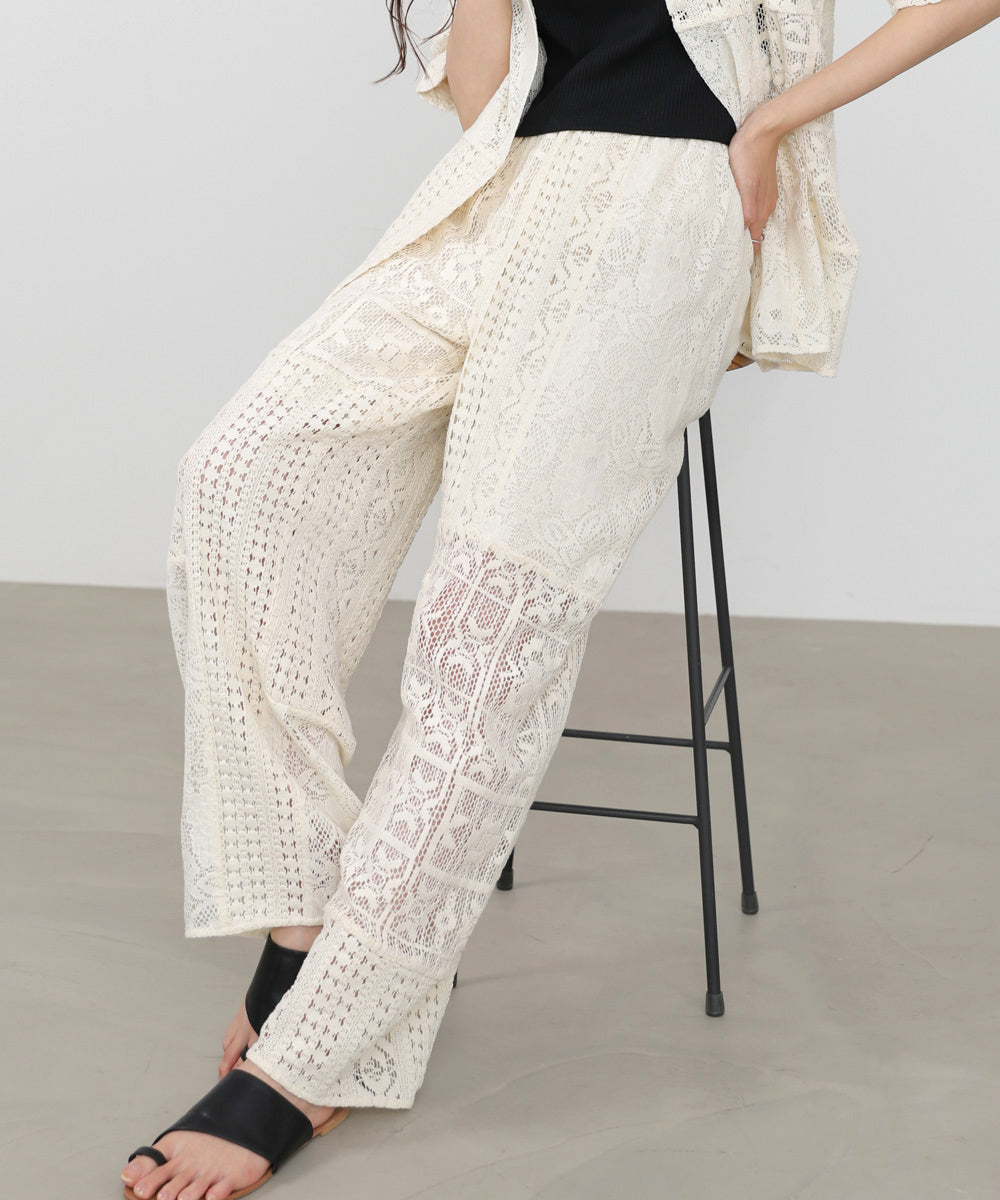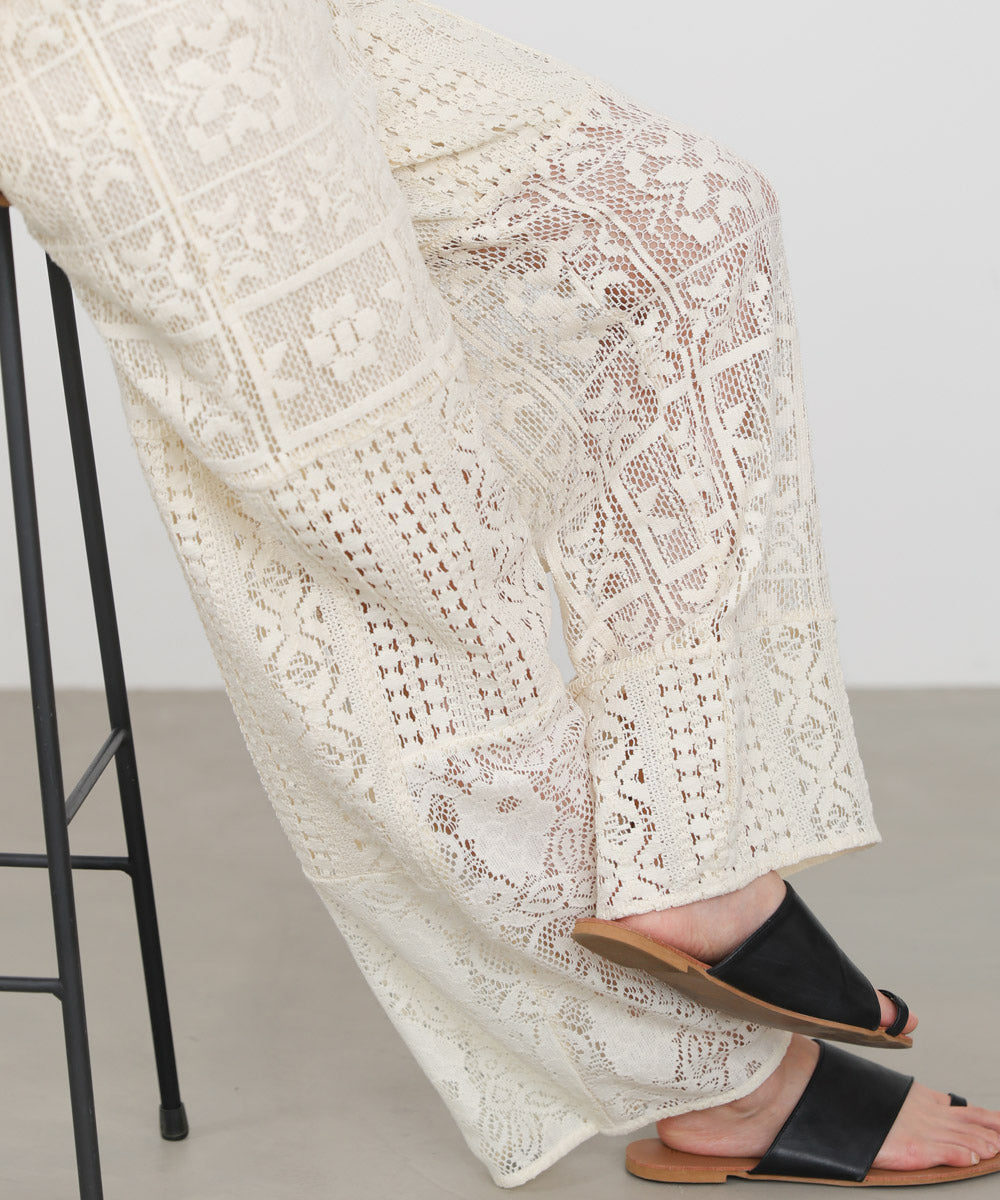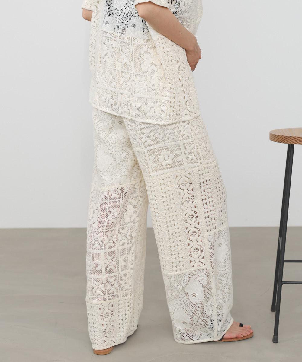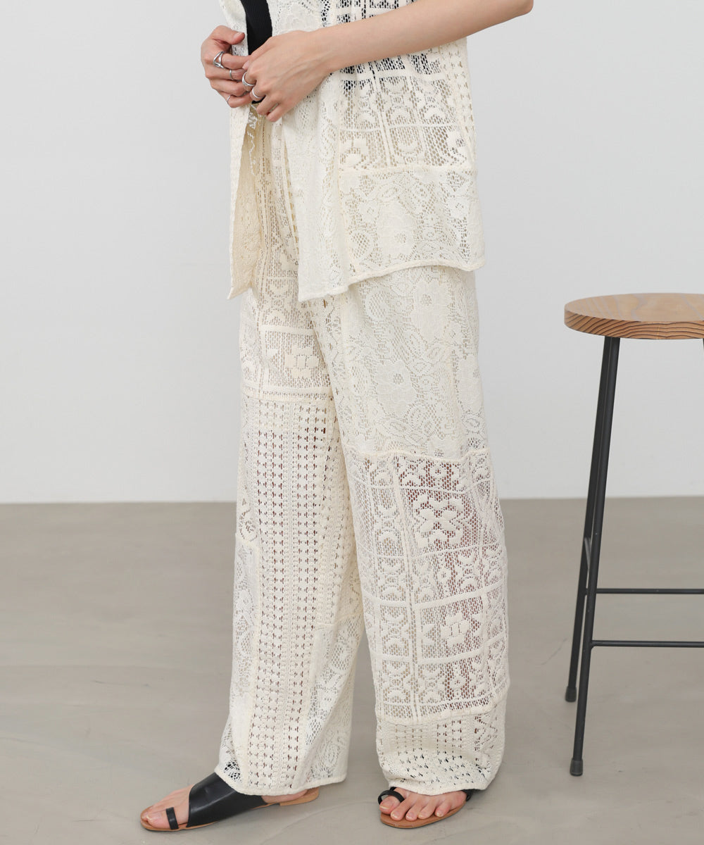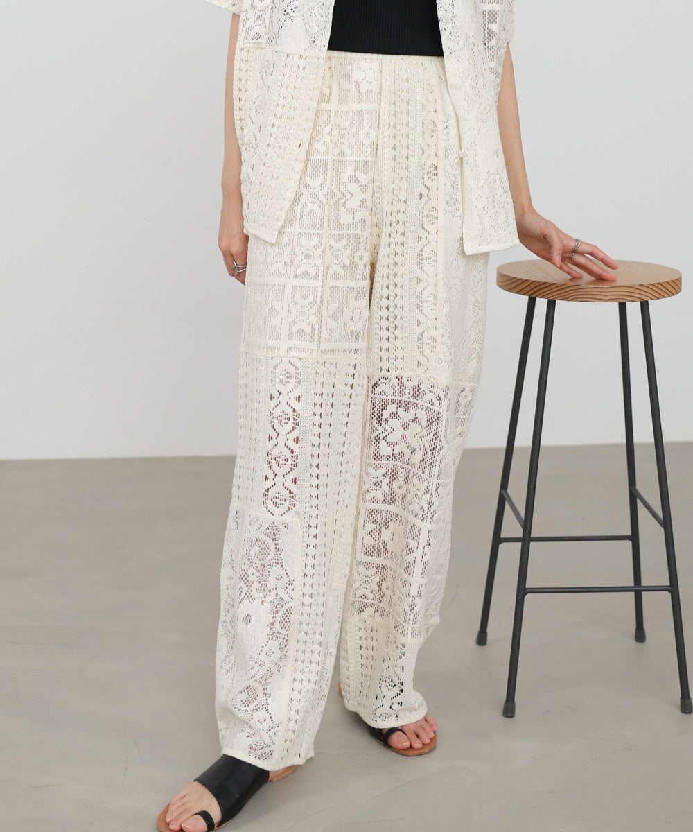 異なるレースを組み合わせたパッチワークデザインが目を惹くパンツ。繊細な刺繍が縦ラインを強調し、リラックス感のあるシルエットながらもすっきりとした印象に仕上げてくれます。ナチュラルな風合いとクラフト感が、大人の抜け感スタイルにぴったりの一着です。
