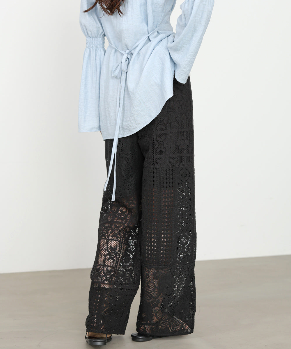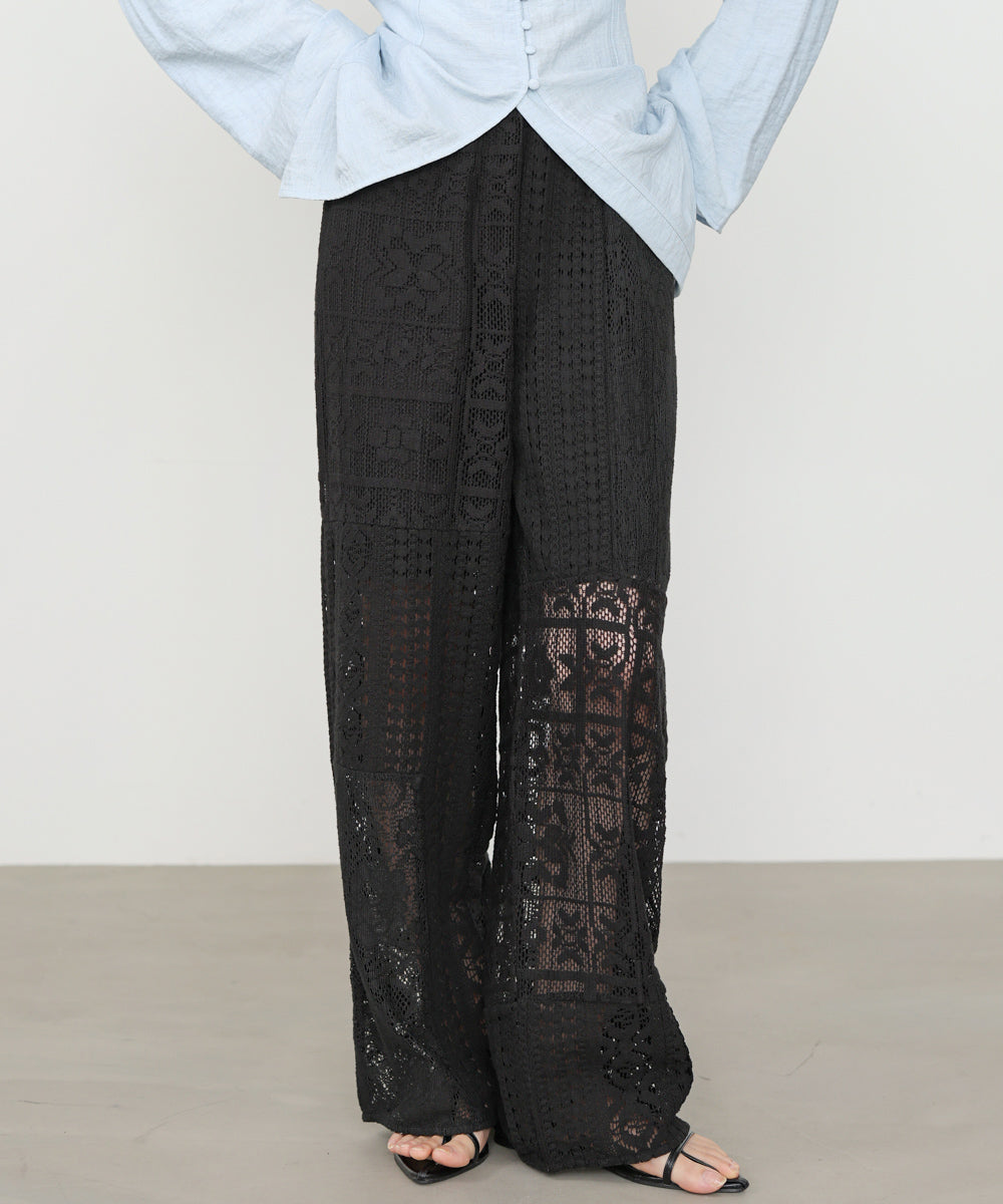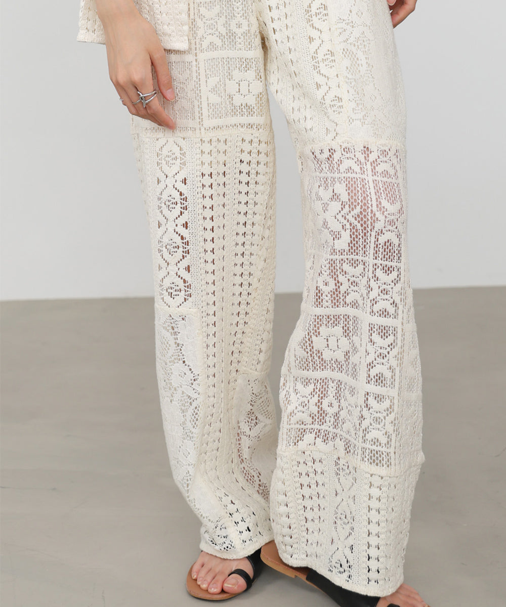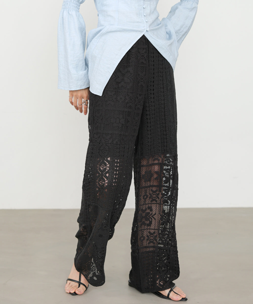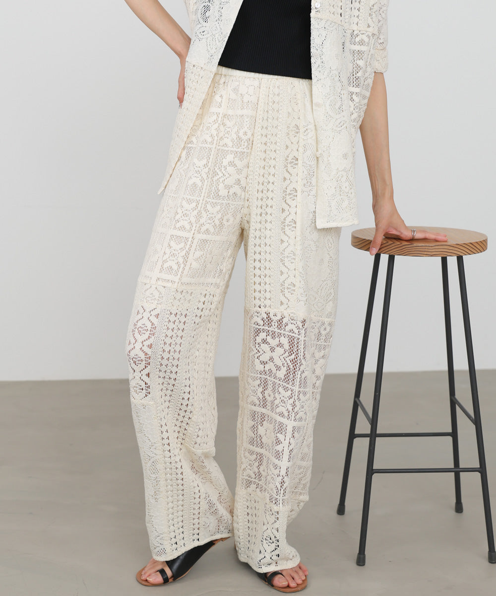 異なるレースを組み合わせたパッチワークデザインが目を惹くパンツ。繊細な刺繍が縦ラインを強調し、リラックス感のあるシルエットながらもすっきりとした印象に仕上げてくれます。ナチュラルな風合いとクラフト感が、大人の抜け感スタイルにぴったりの一着です。