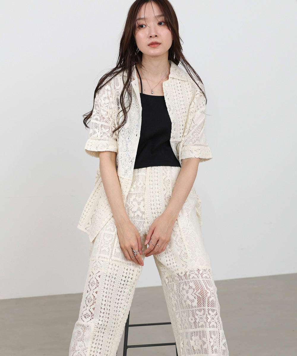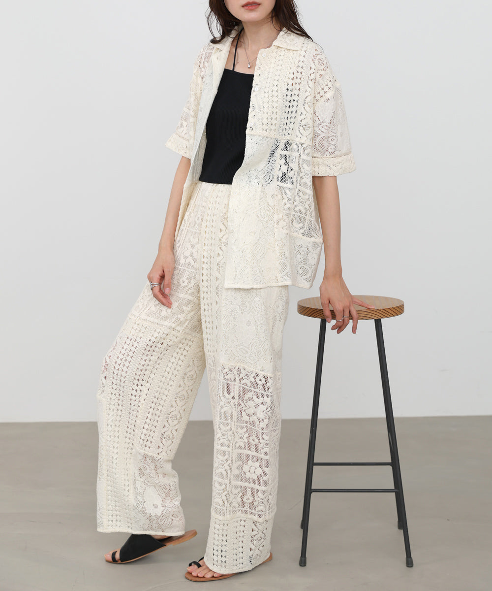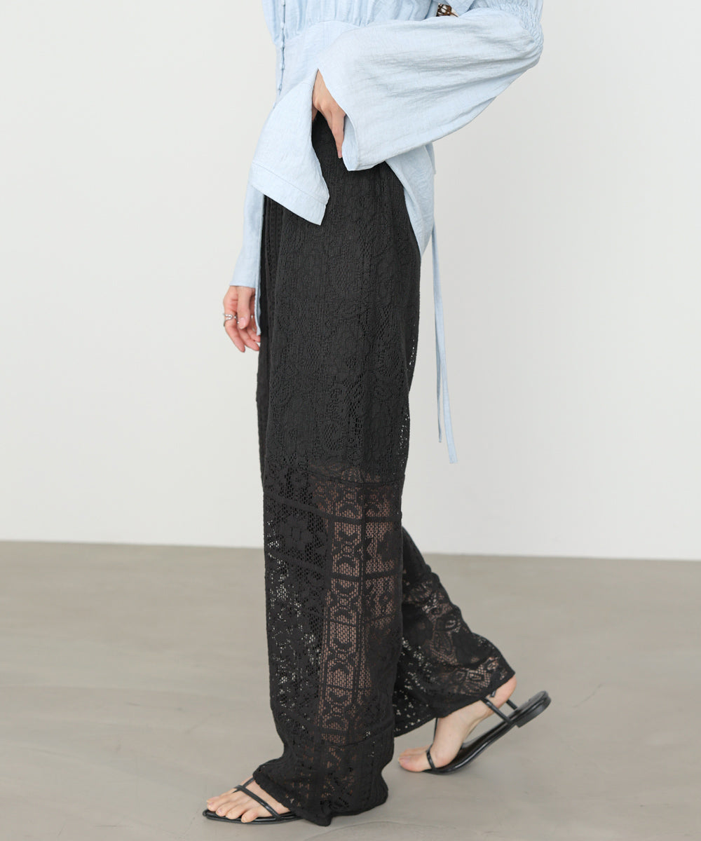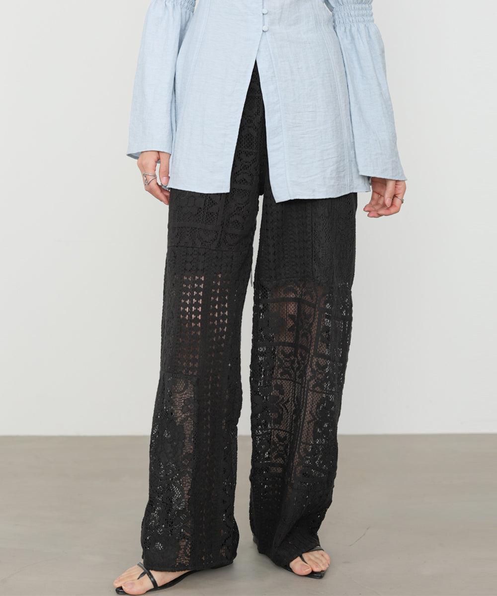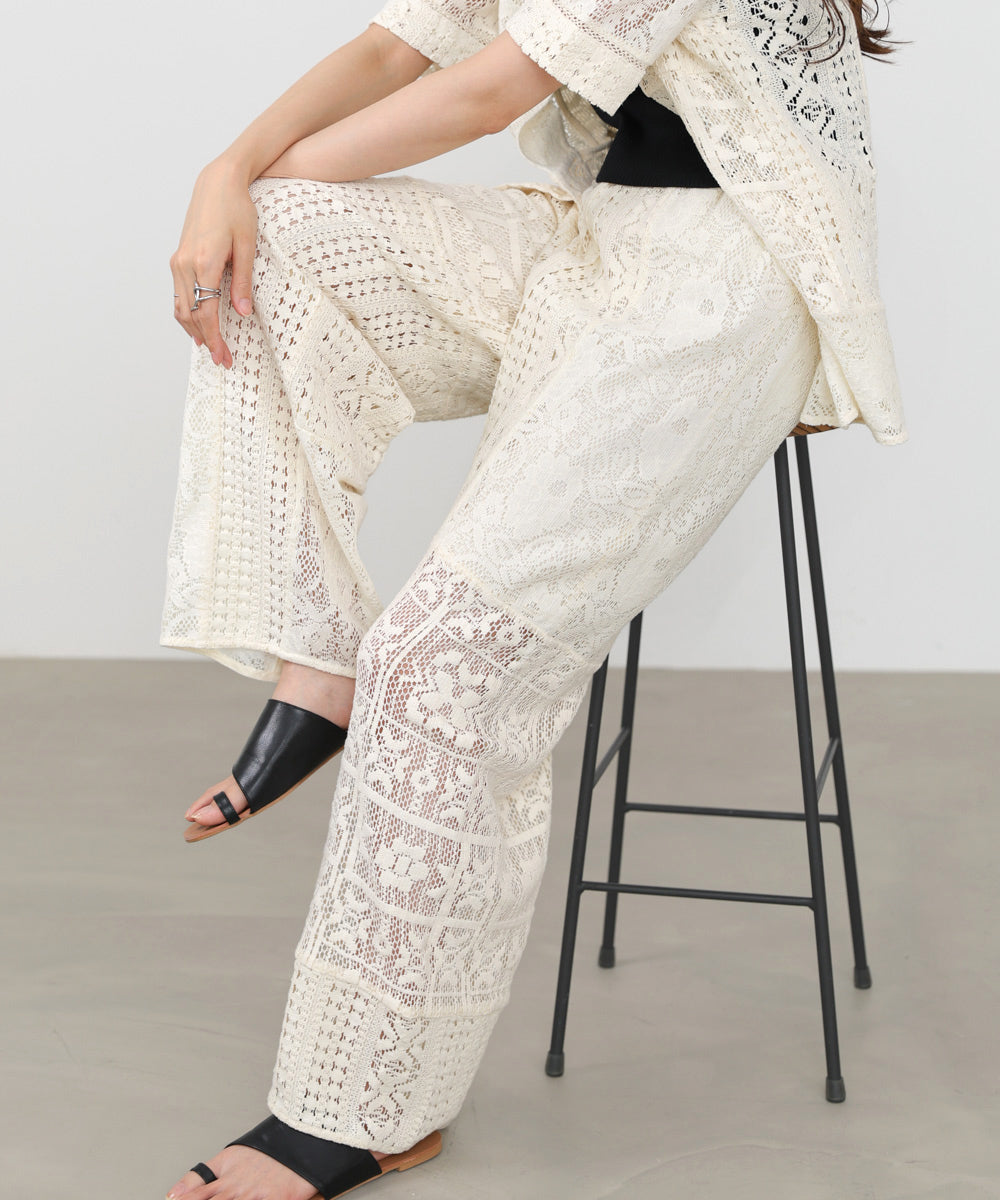 異なるレースを組み合わせたパッチワークデザインが目を惹くパンツ。繊細な刺繍が縦ラインを強調し、リラックス感のあるシルエットながらもすっきりとした印象に仕上げてくれます。ナチュラルな風合いとクラフト感が、大人の抜け感スタイルにぴったりの一着です。