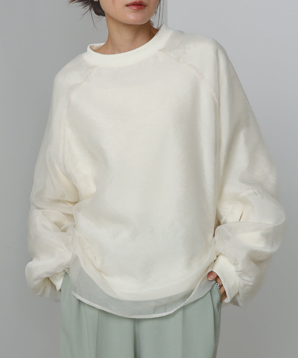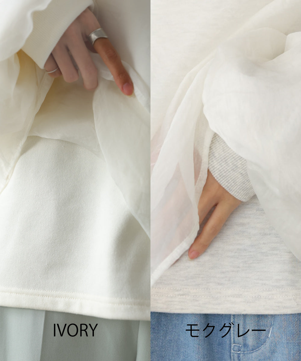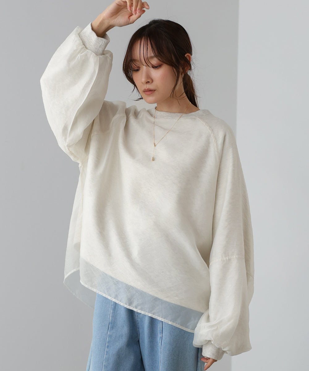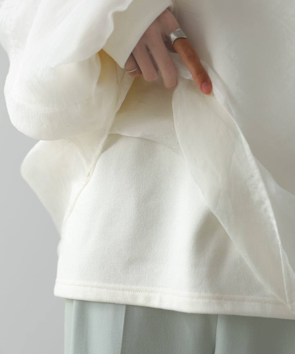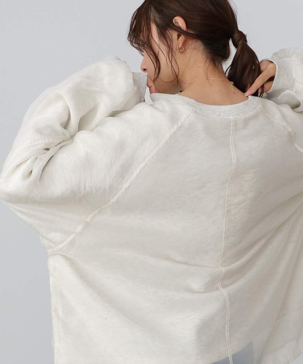 イージーな着心地の裏毛スウェットにオーガンジーをレイヤードして着映え抜群の1枚が出来上がりました!オーガンジー部分は光の当たり具合で様々な表情が浮かび上がります。ラグランスリーブの程よくルーズなシルエットがこなれ感を演出し、袖もぱふっと感があり 可愛らしいボリューム感でフェミニンさを引き立てます。バランスの取りやすい腰までのレングスも魅力的です。
