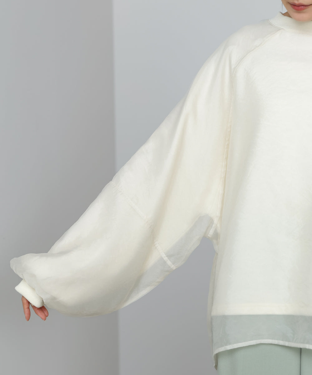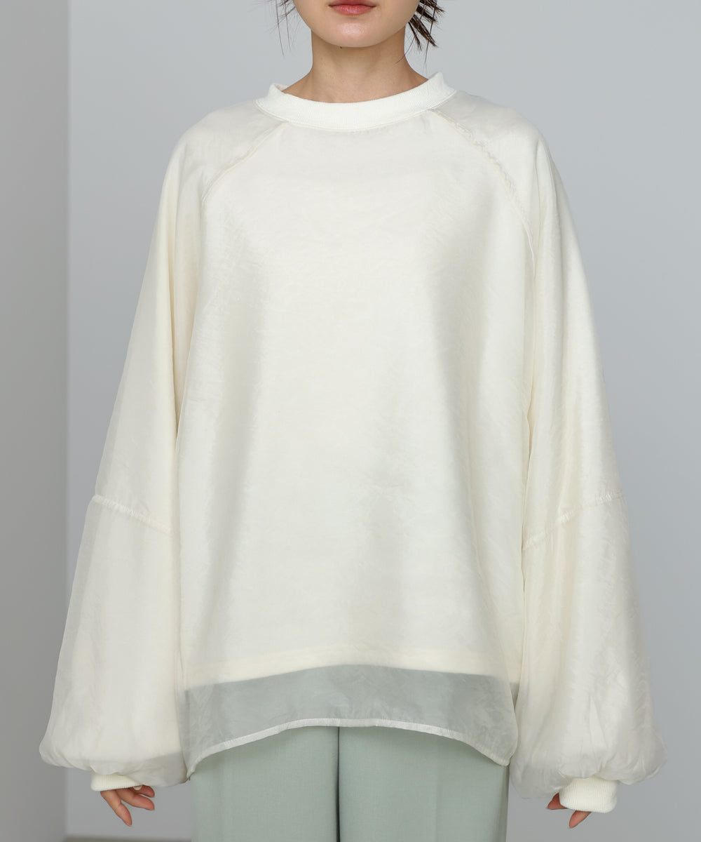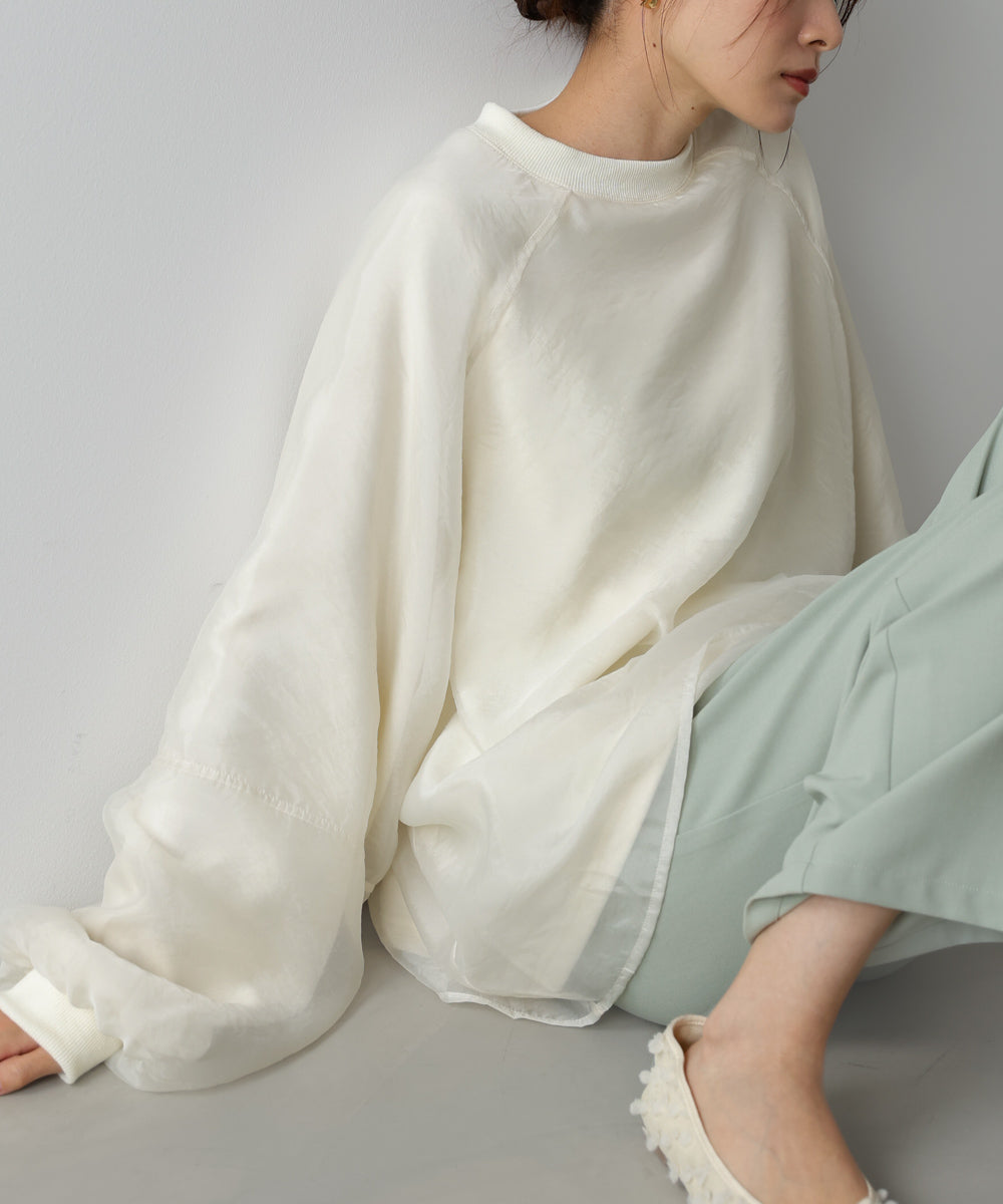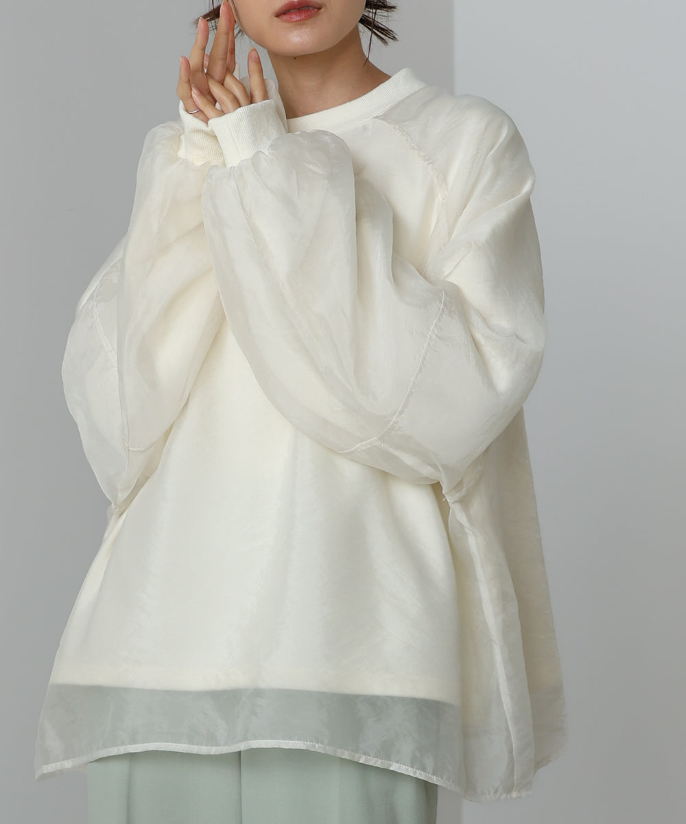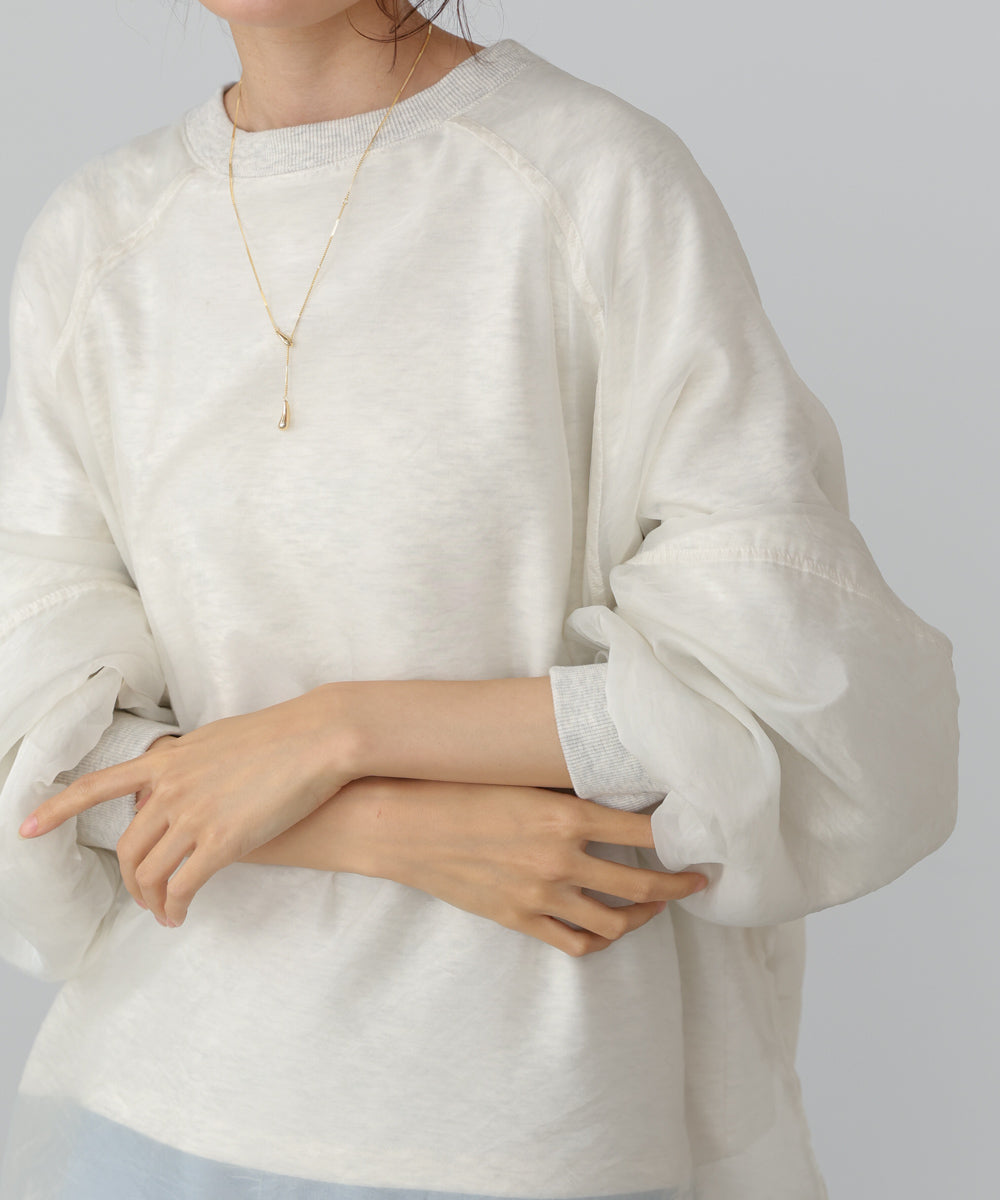 イージーな着心地の裏毛スウェットにオーガンジーをレイヤードして着映え抜群の1枚が出来上がりました!オーガンジー部分は光の当たり具合で様々な表情が浮かび上がります。ラグランスリーブの程よくルーズなシルエットがこなれ感を演出し、袖もぱふっと感があり 可愛らしいボリューム感でフェミニンさを引き立てます。バランスの取りやすい腰までのレングスも魅力的です。