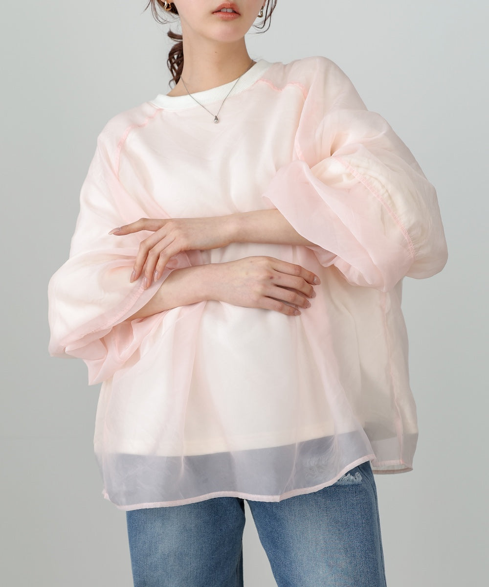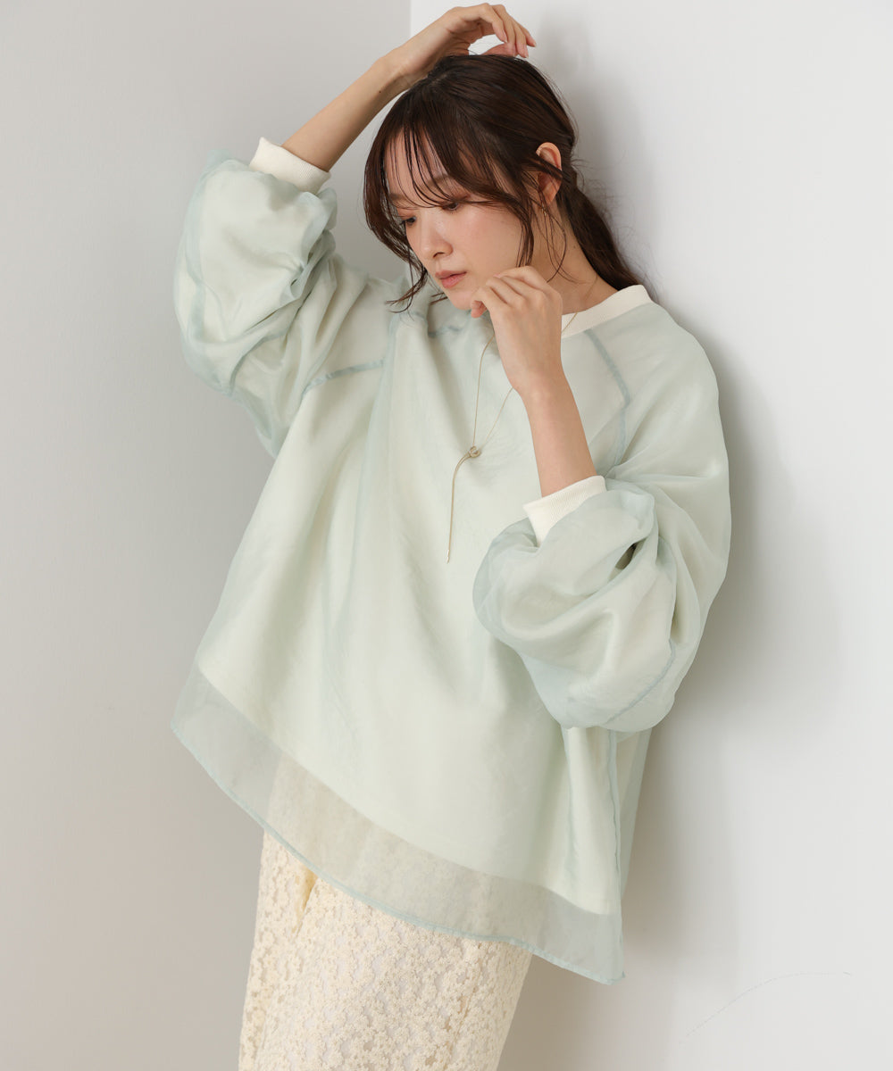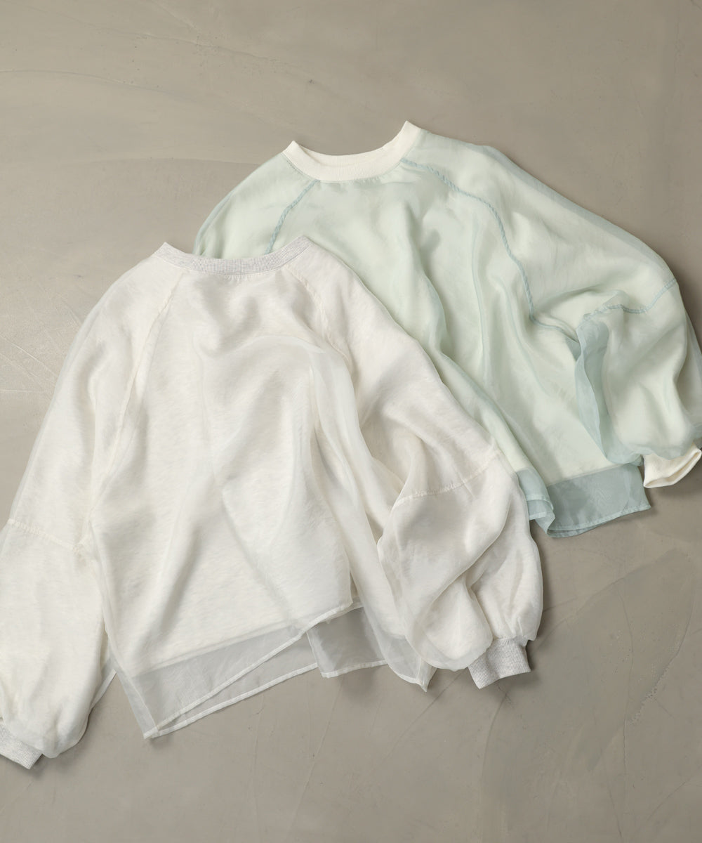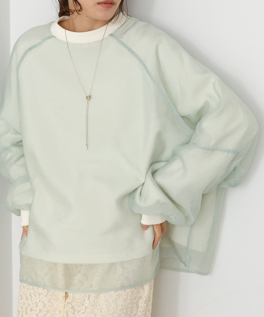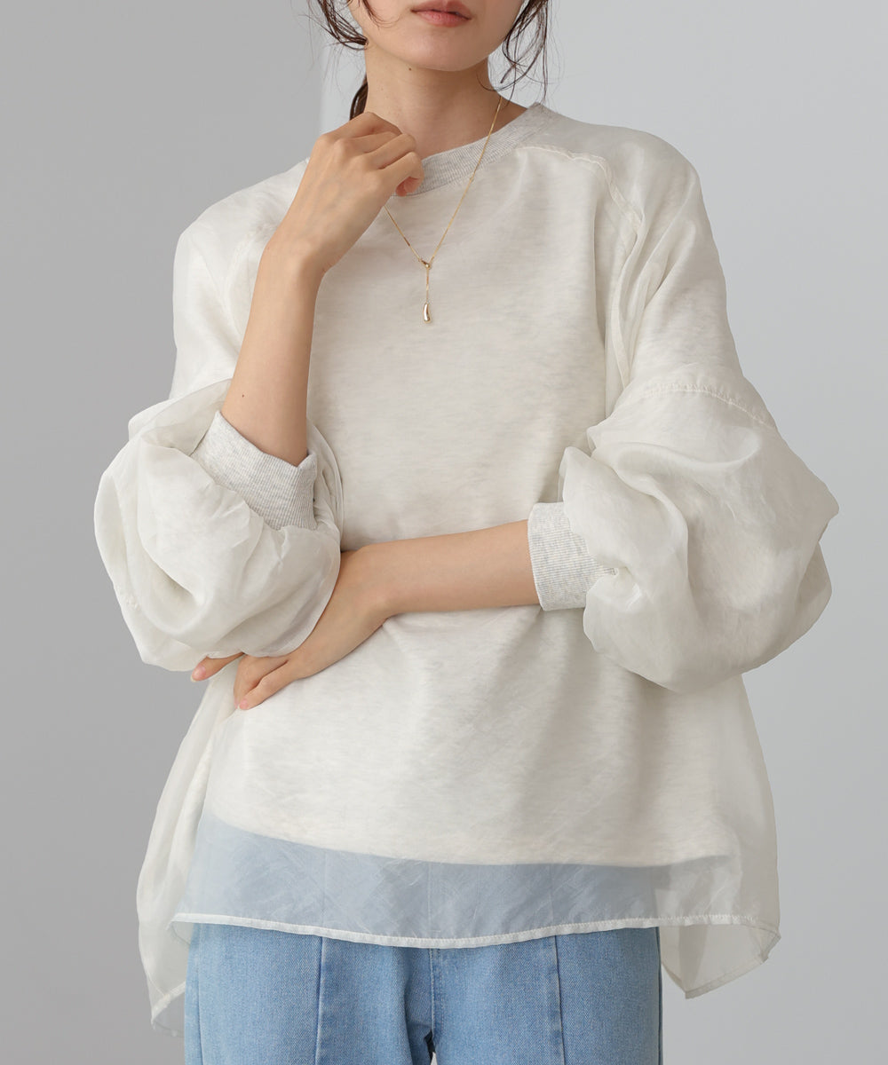 イージーな着心地の裏毛スウェットにオーガンジーをレイヤードして着映え抜群の1枚が出来上がりました!オーガンジー部分は光の当たり具合で様々な表情が浮かび上がります。ラグランスリーブの程よくルーズなシルエットがこなれ感を演出し、袖もぱふっと感があり 可愛らしいボリューム感でフェミニンさを引き立てます。バランスの取りやすい腰までのレングスも魅力的です。