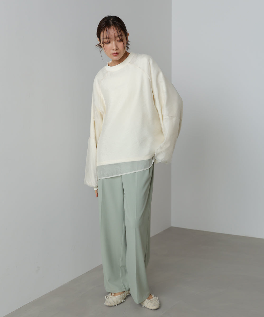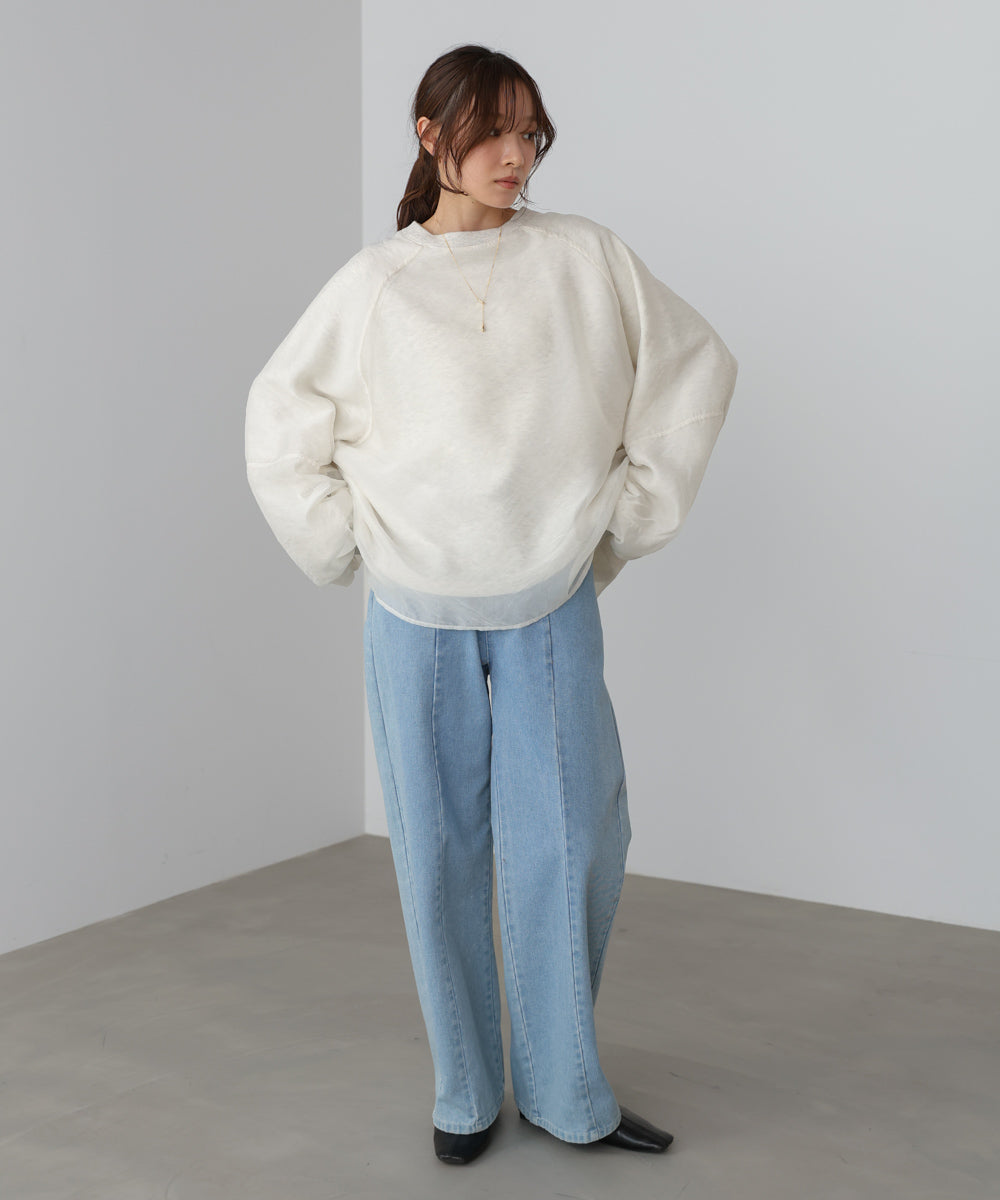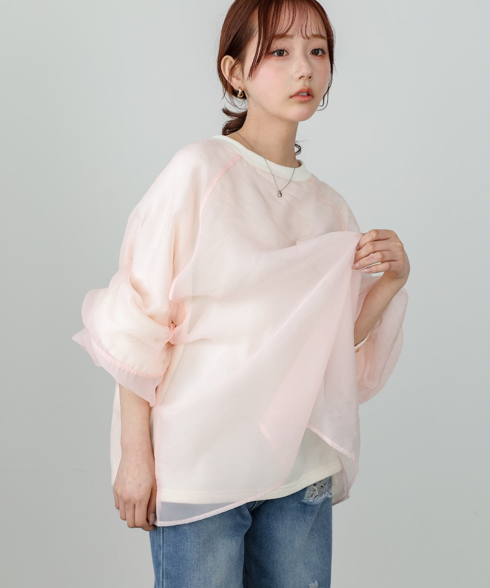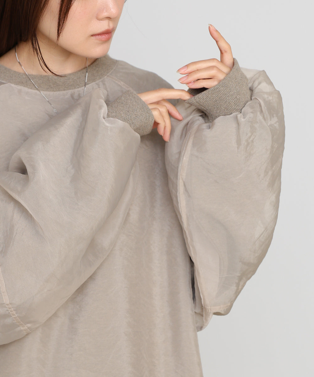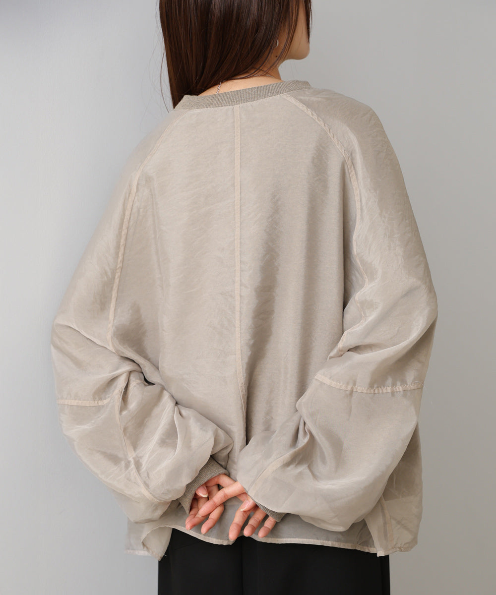 イージーな着心地の裏毛スウェットにオーガンジーをレイヤードして着映え抜群の1枚が出来上がりました!オーガンジー部分は光の当たり具合で様々な表情が浮かび上がります。ラグランスリーブの程よくルーズなシルエットがこなれ感を演出し、袖もぱふっと感があり 可愛らしいボリューム感でフェミニンさを引き立てます。バランスの取りやすい腰までのレングスも魅力的です。